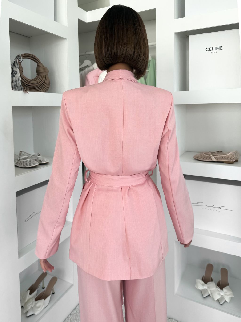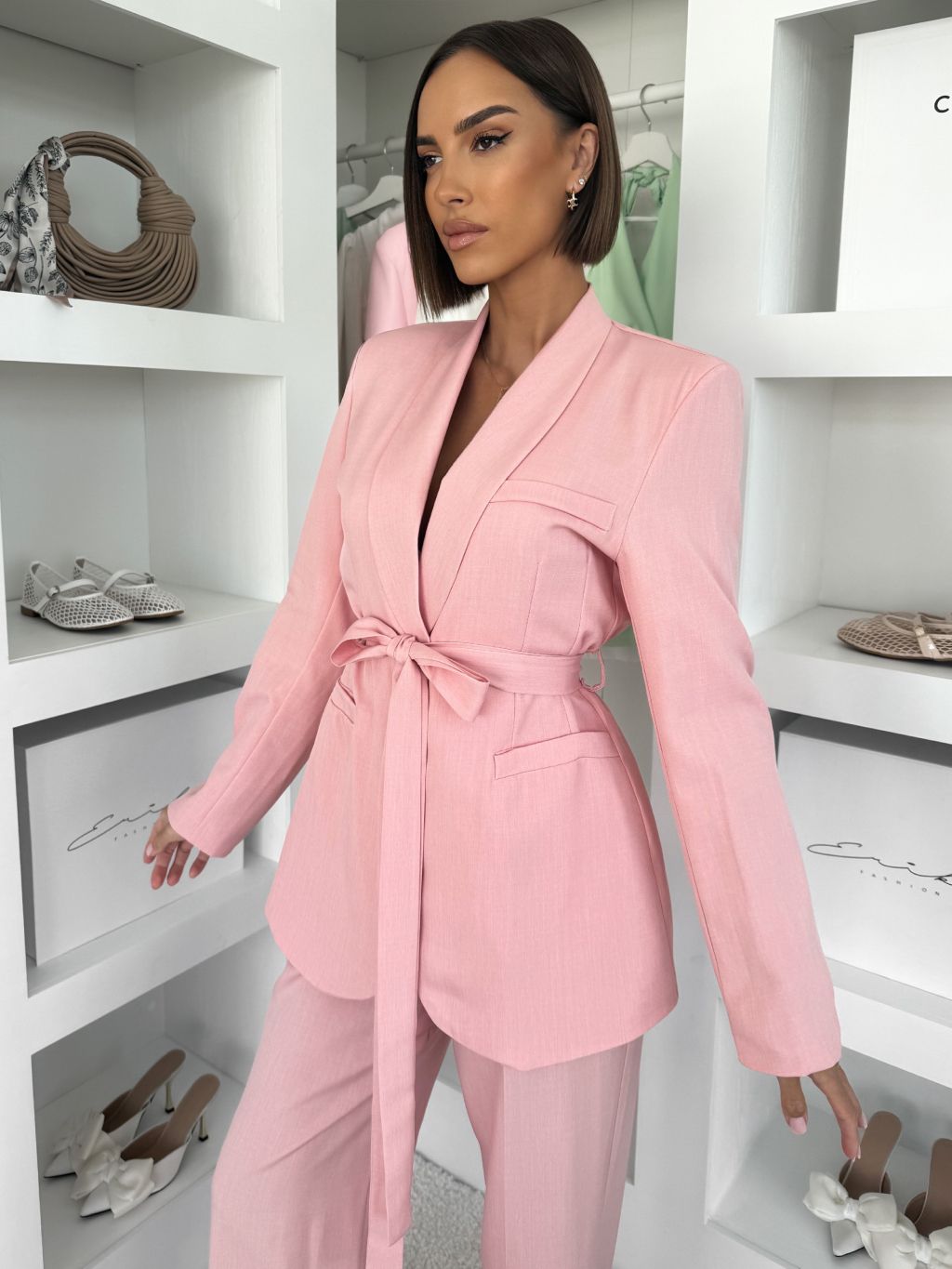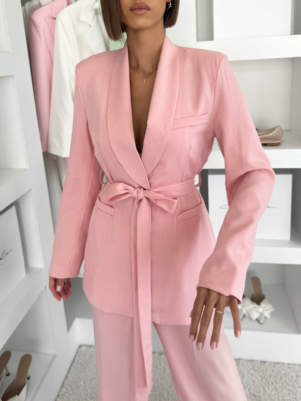 Ružové basic sako THELYA so zaväzovaním