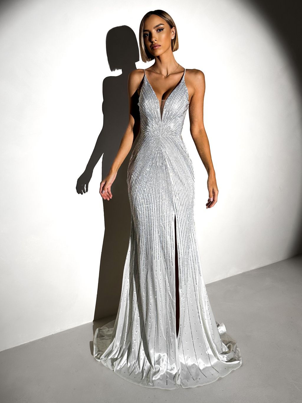 Biele plesové trblietavé šaty RAVELLE s rázporkom
