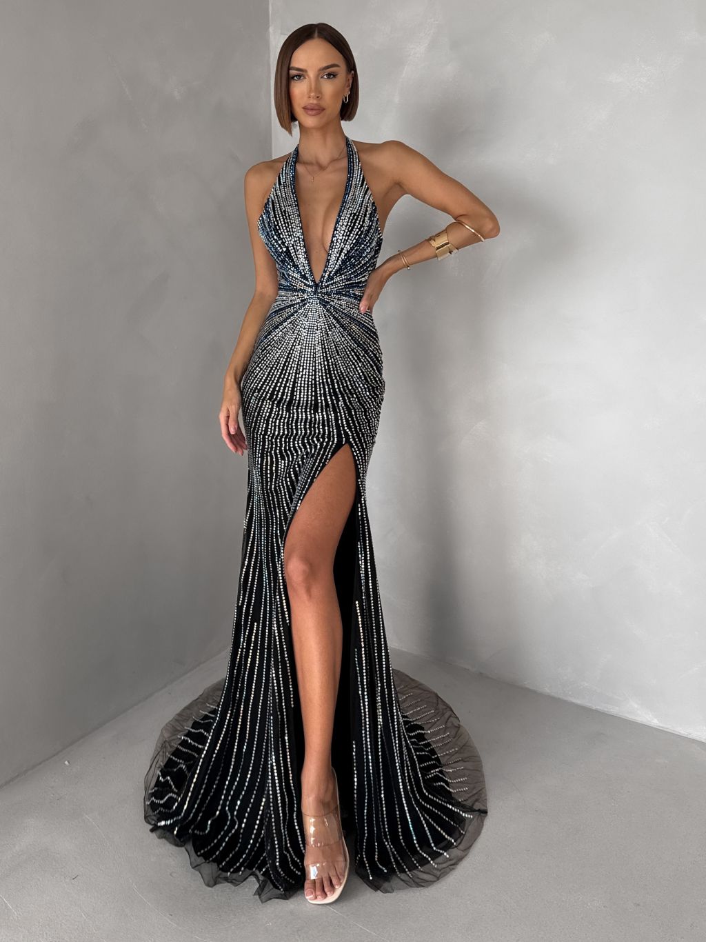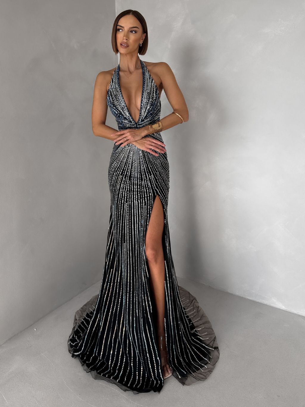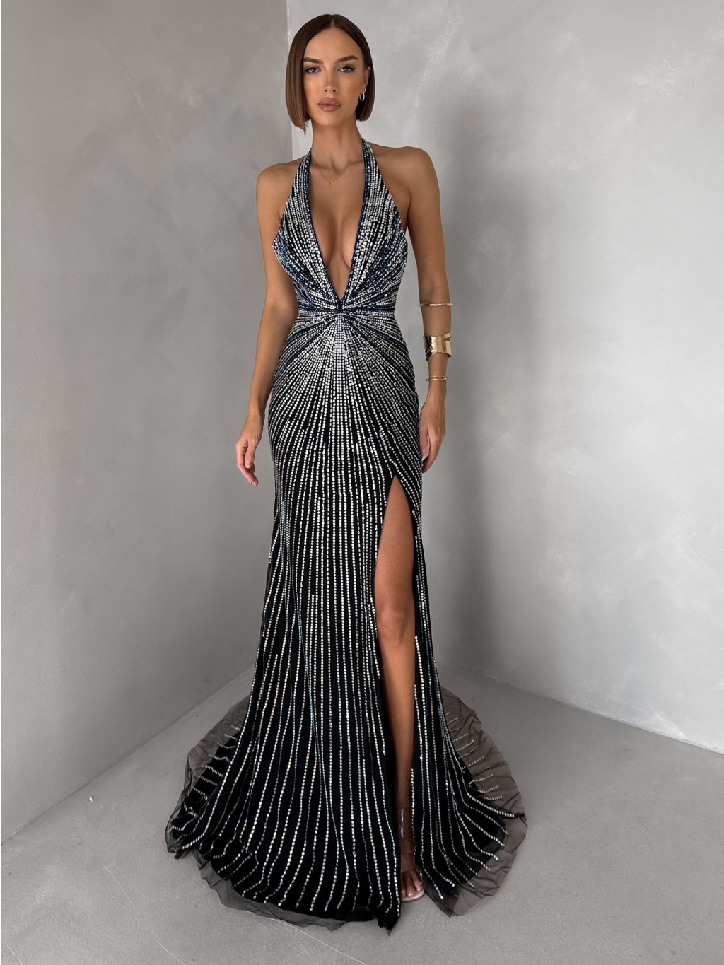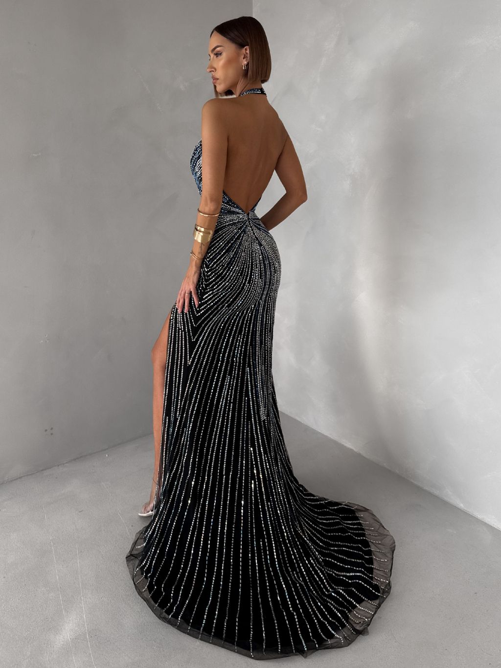 Čierne luxusné dlhé plesové trblietavé šaty ISOLANE