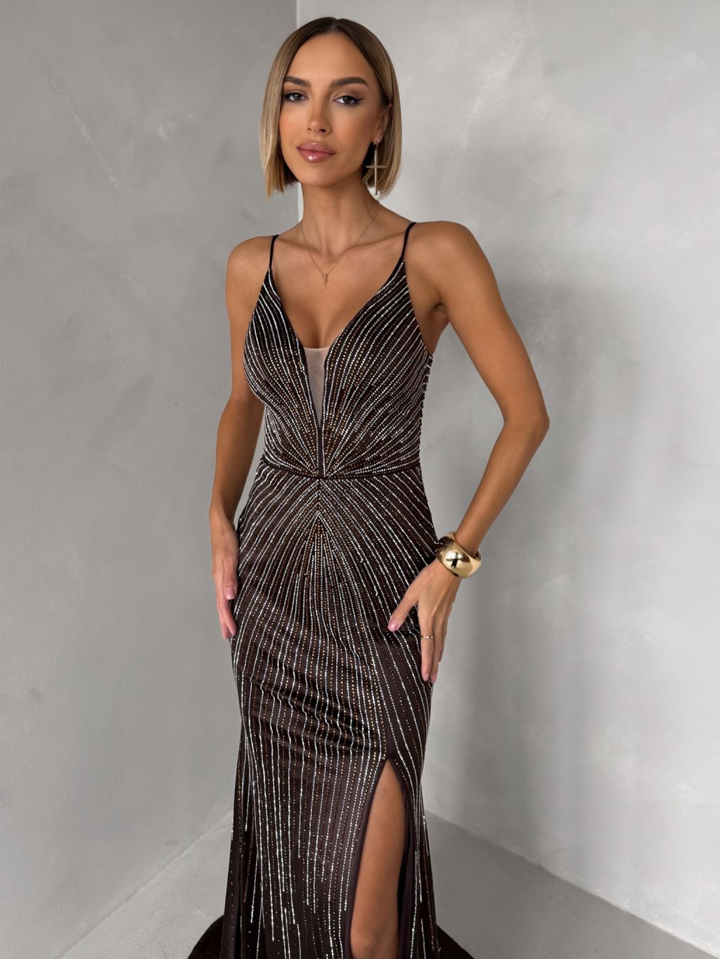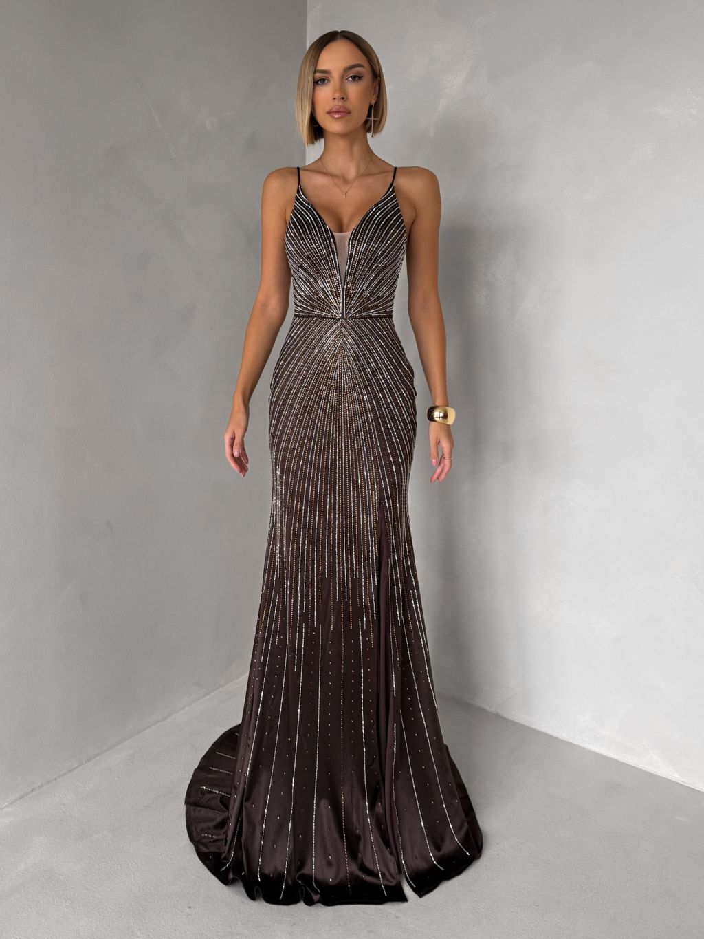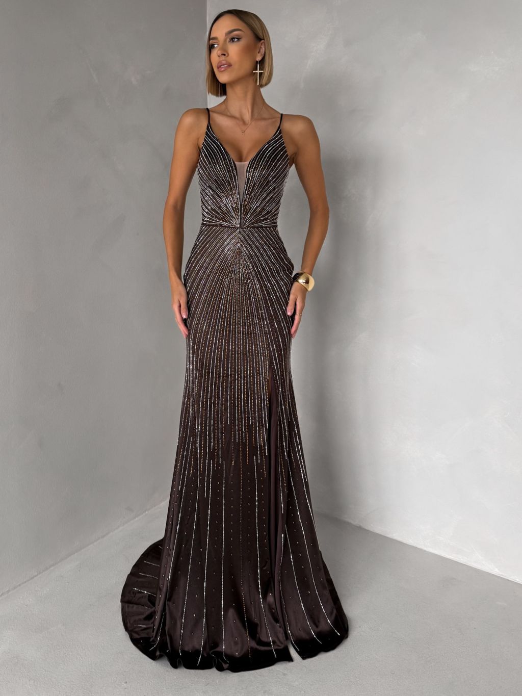 Hnedé luxusné plesové trblietavé šaty RAVELLE na ramienka