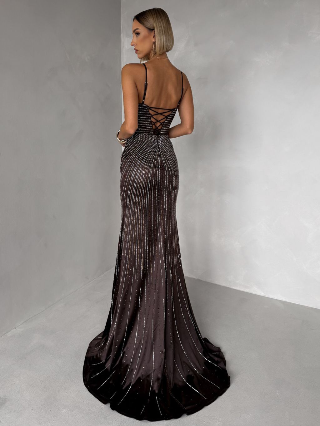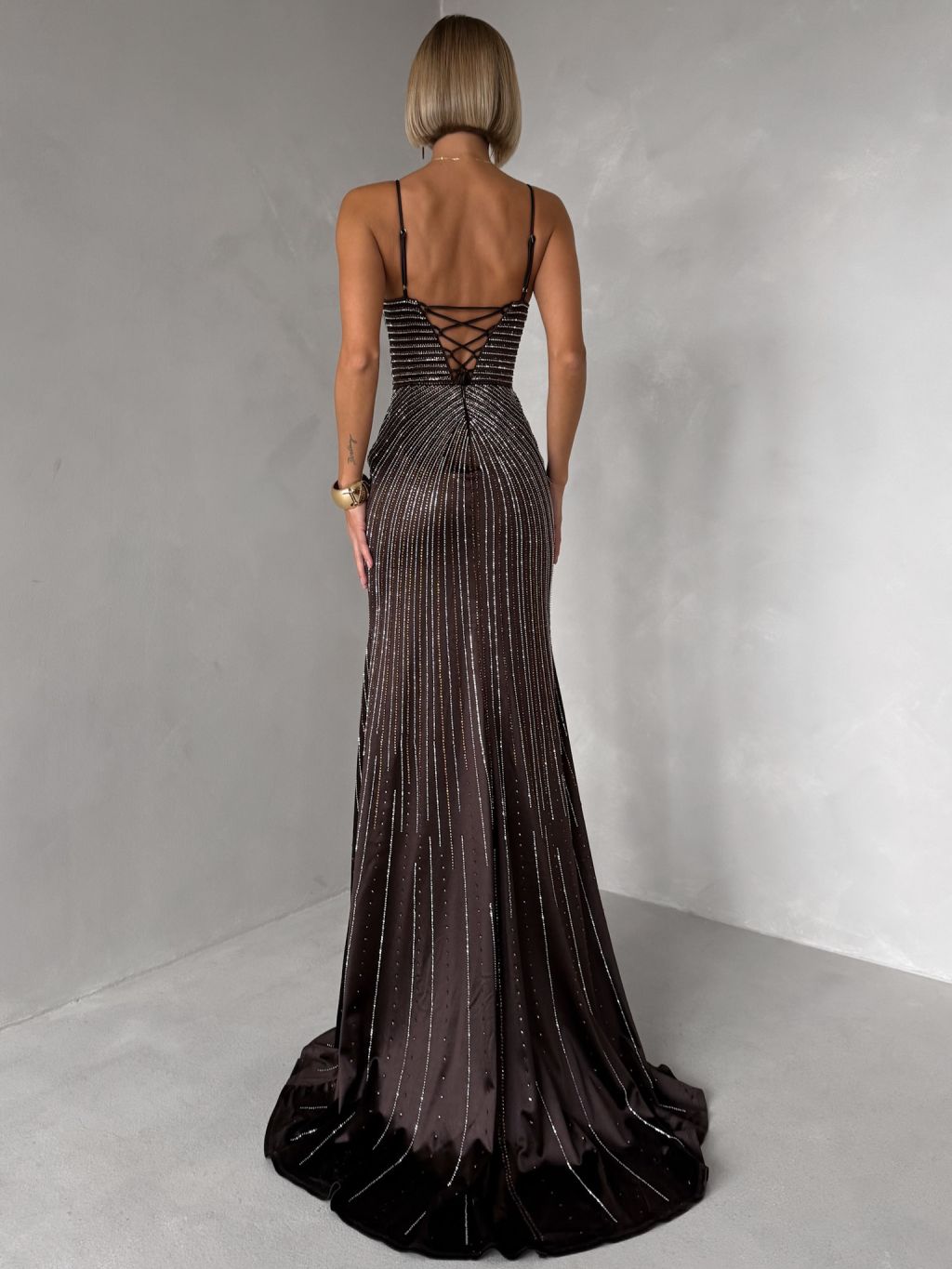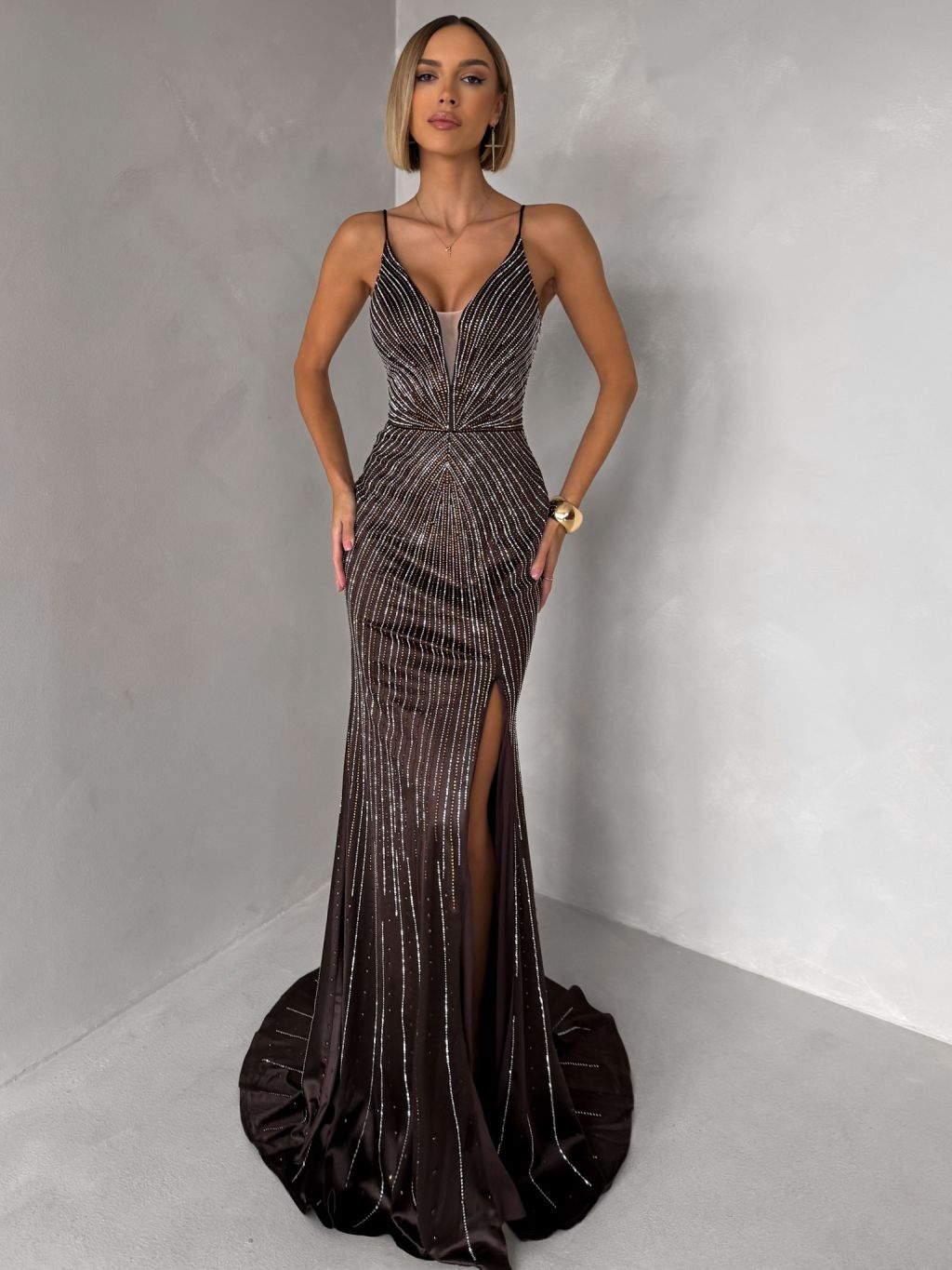Hnedé luxusné plesové trblietavé šaty RAVELLE na ramienka