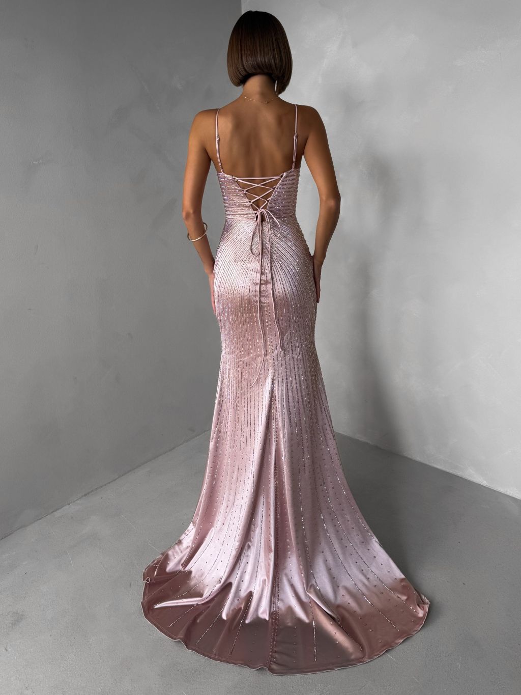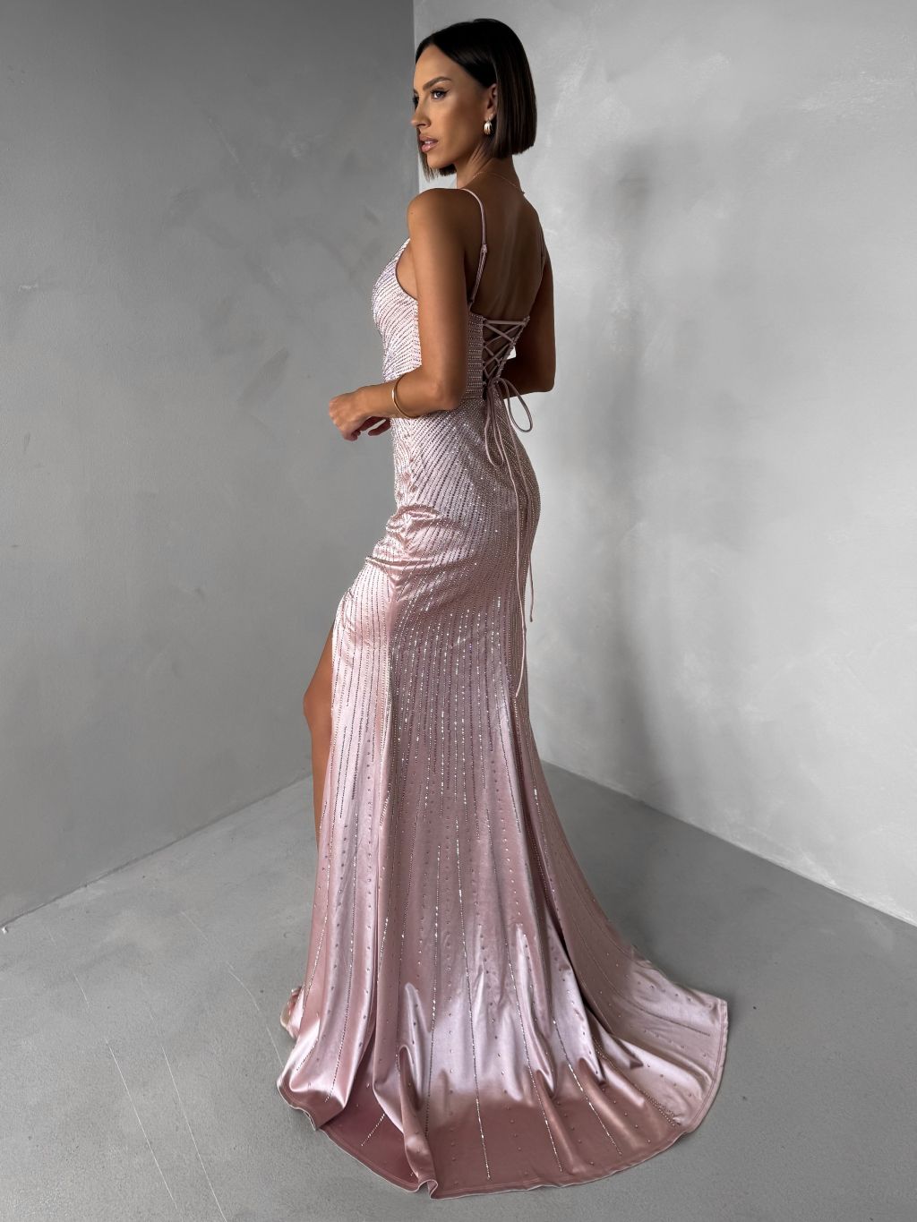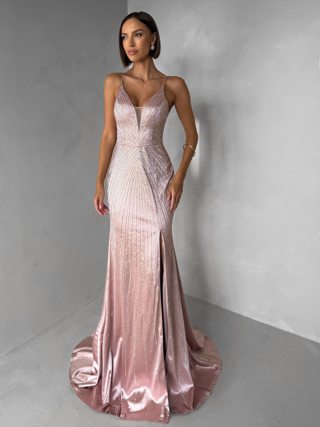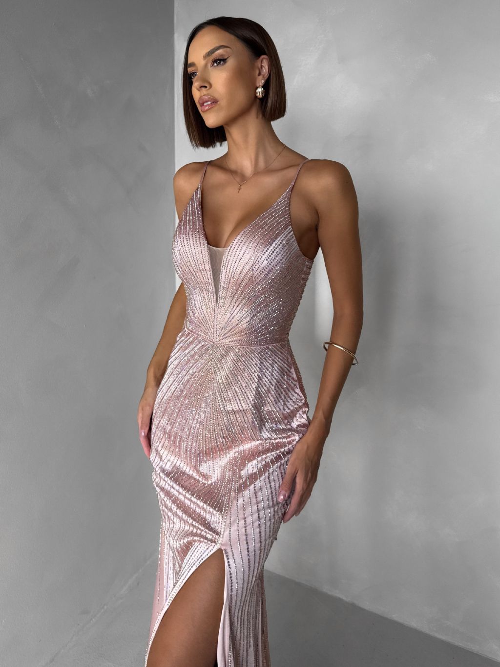 Staroružové luxusné plesové trblietavé šaty RAVELLE s rázporkom