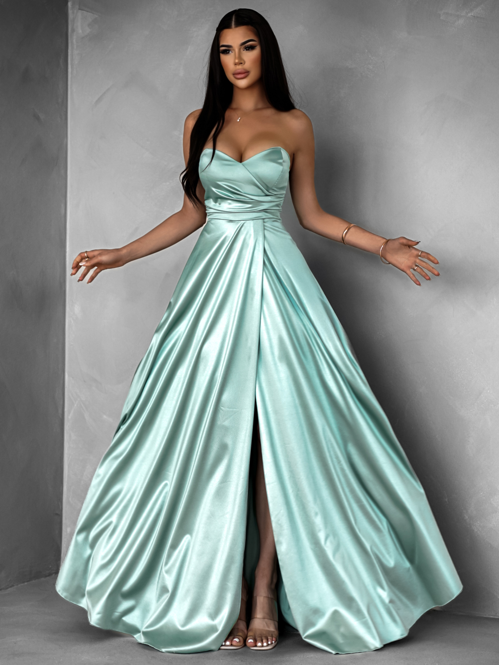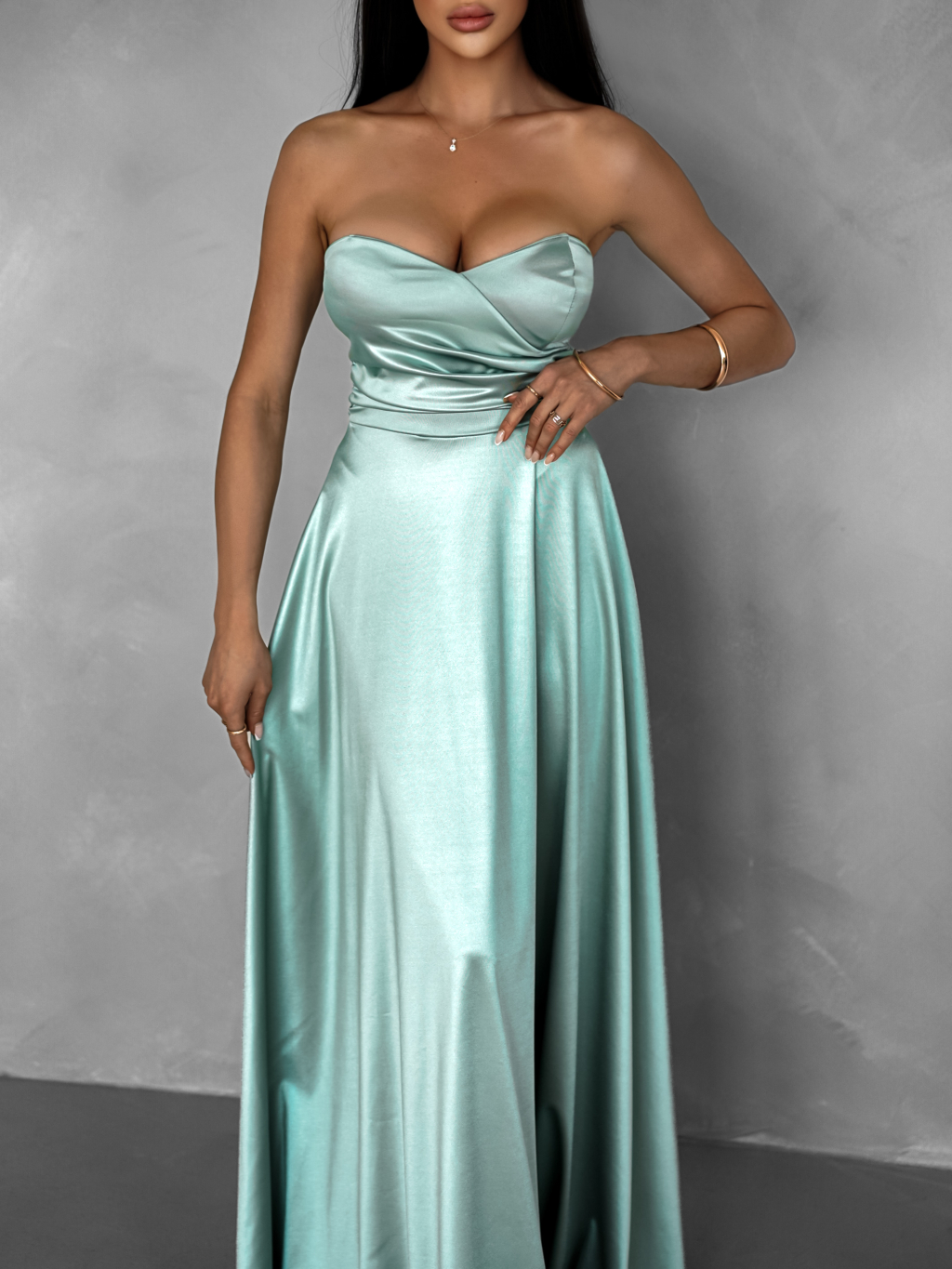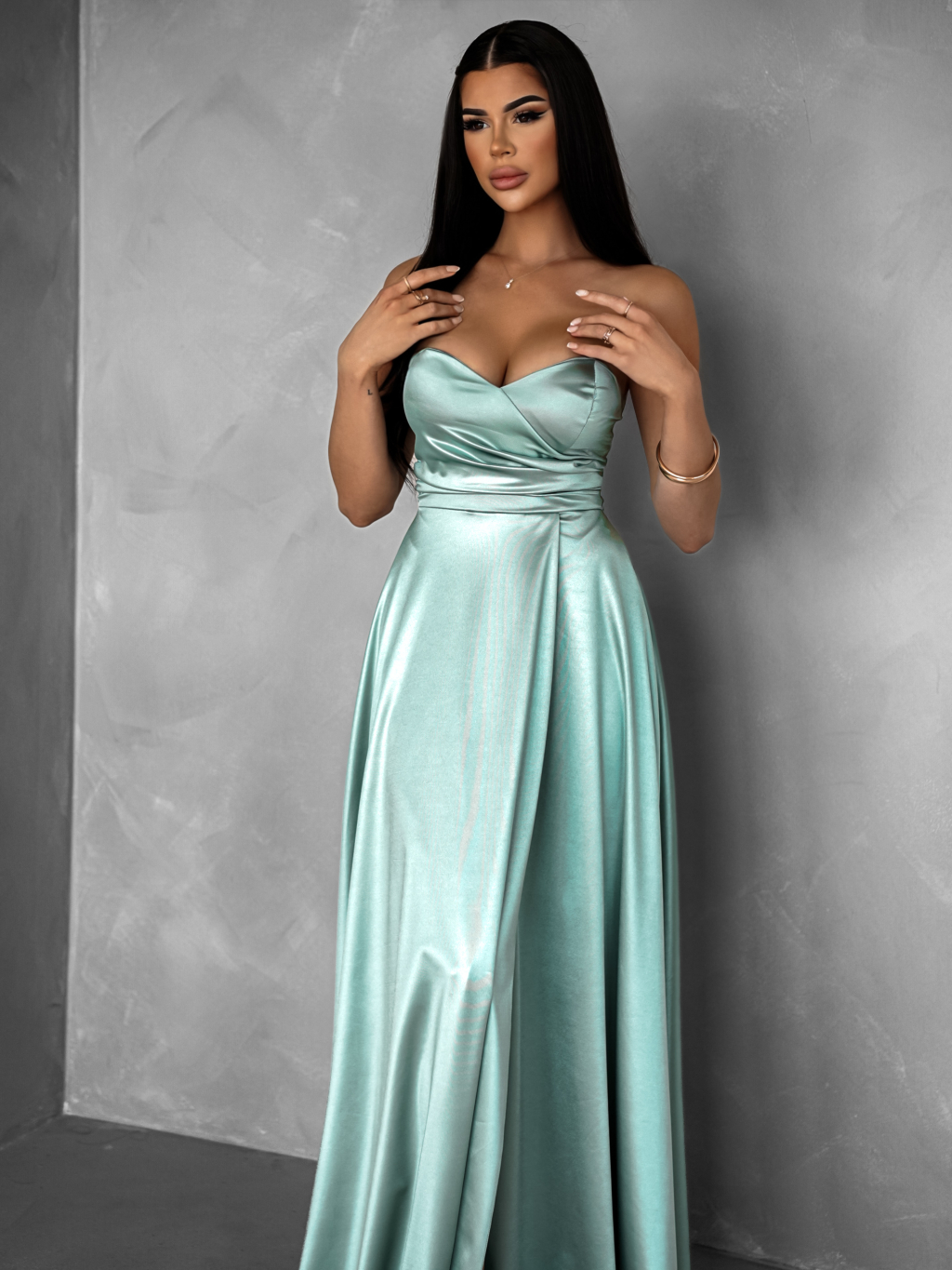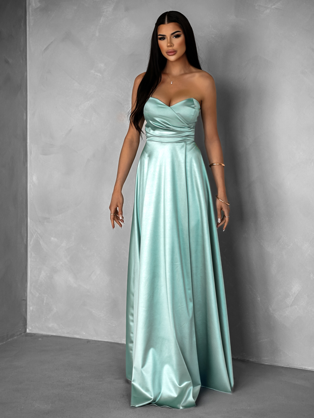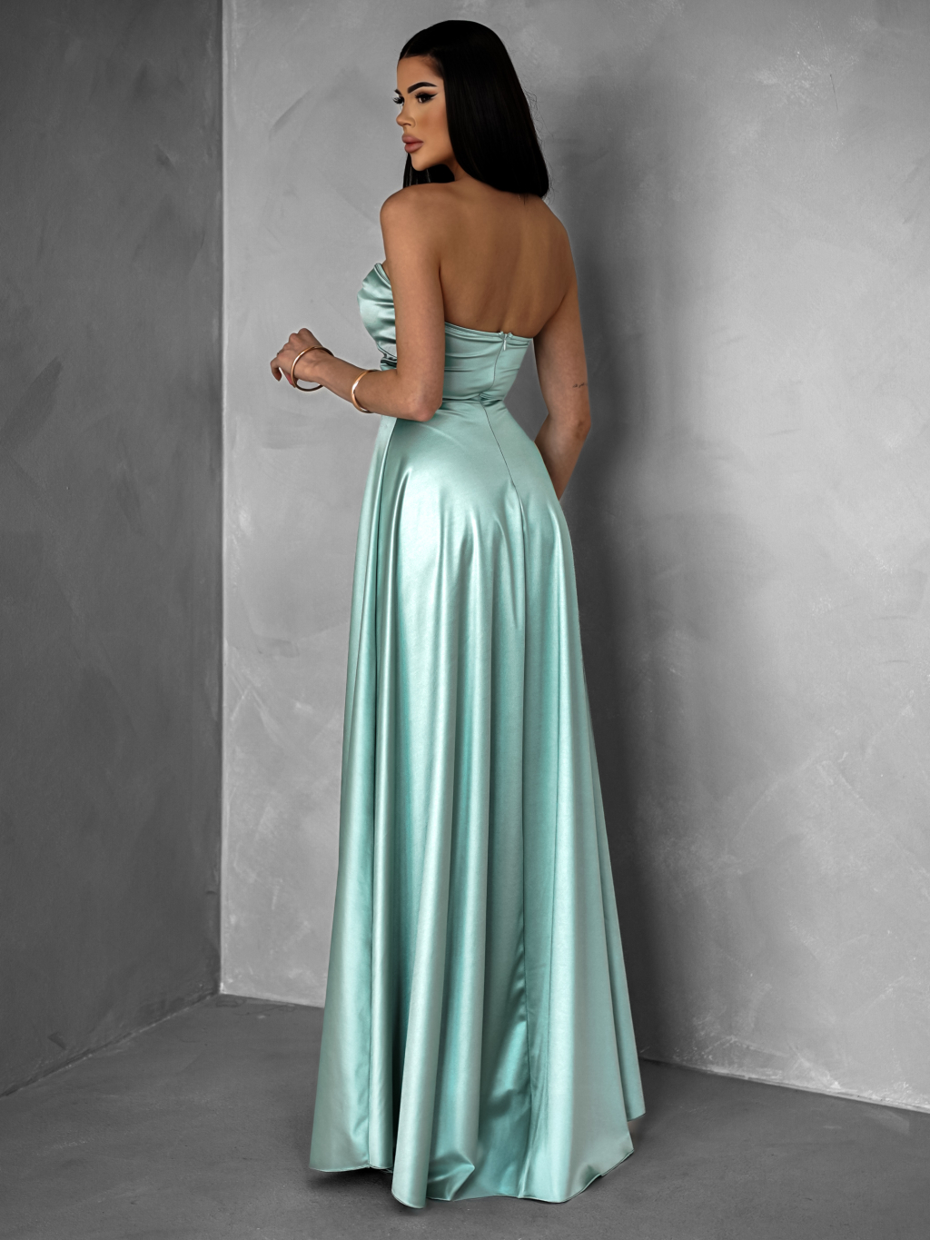 Svetlo zelené saténové dlhé šaty SYCHAEUS bez ramienok