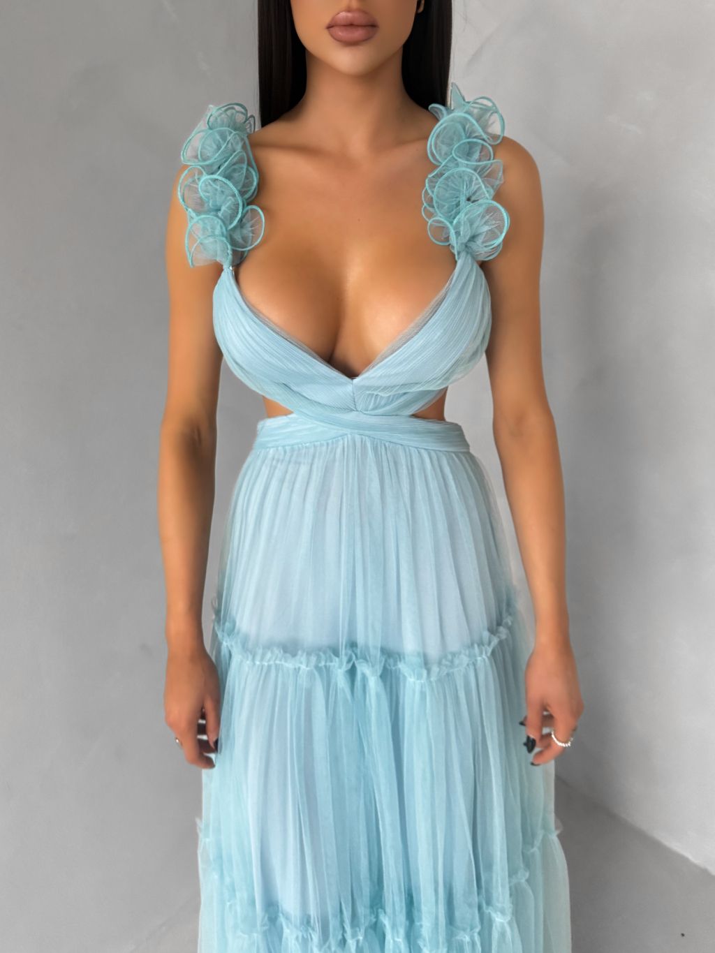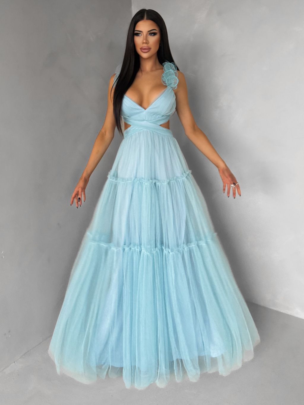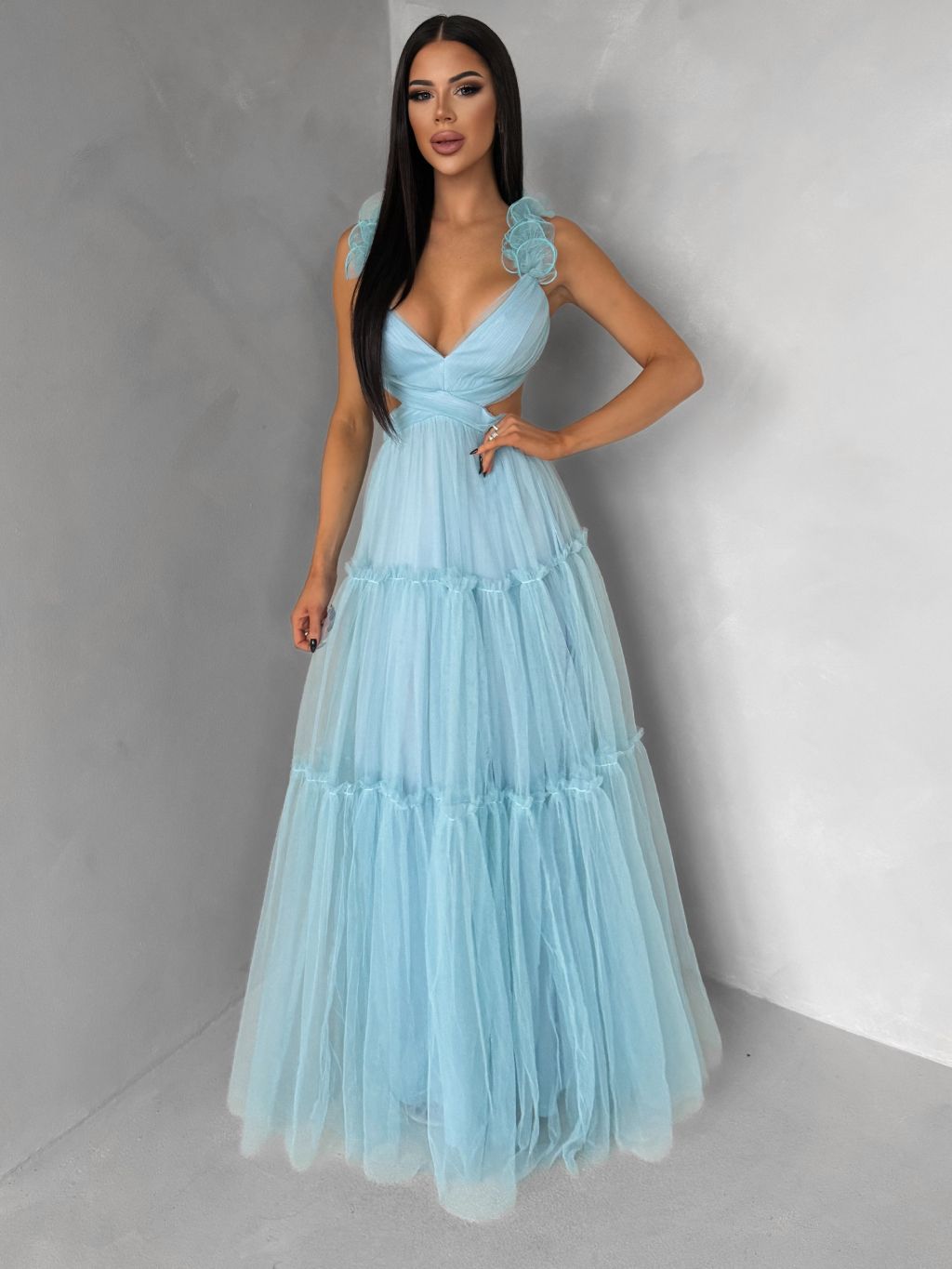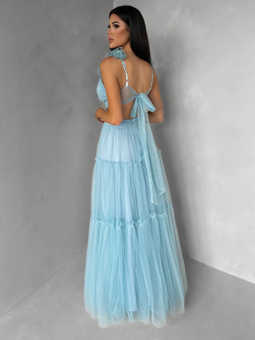 Mentolové tylové plesové šaty NALASI s prestrihmi
