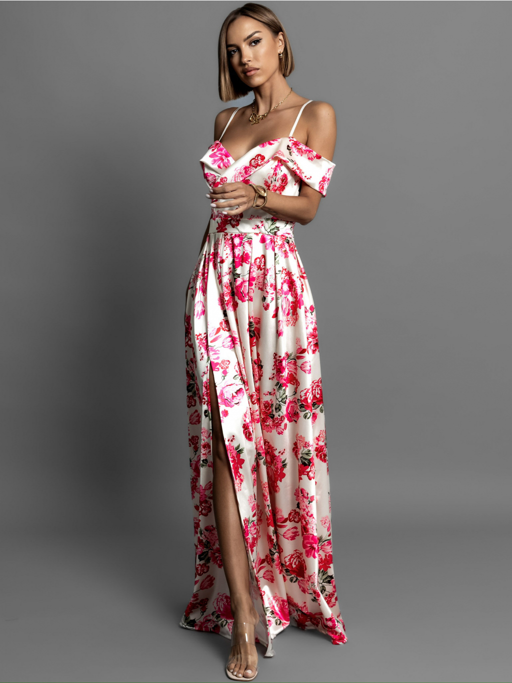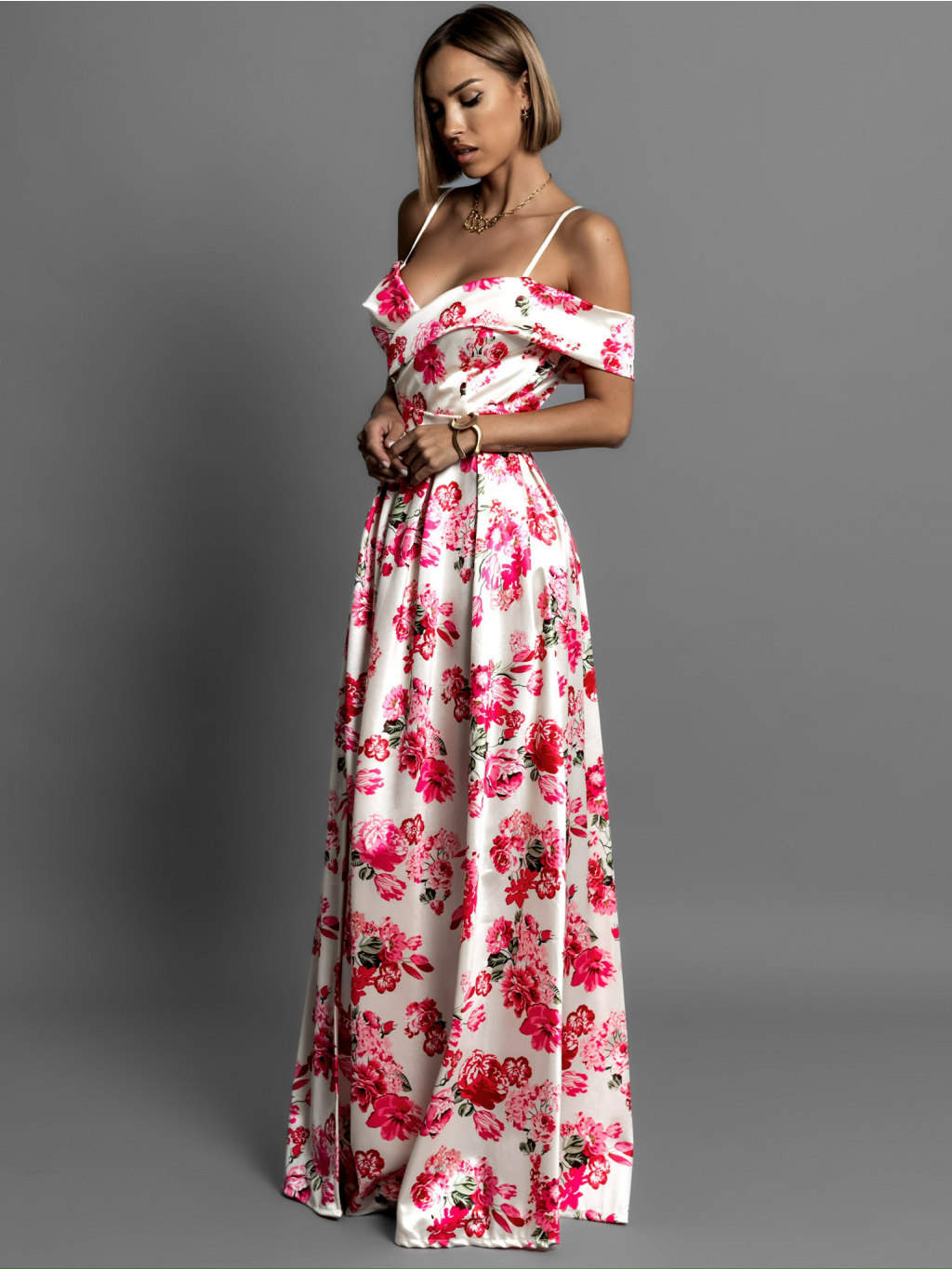 Krémové dlhé saténové kvetinové šaty MAXWELL