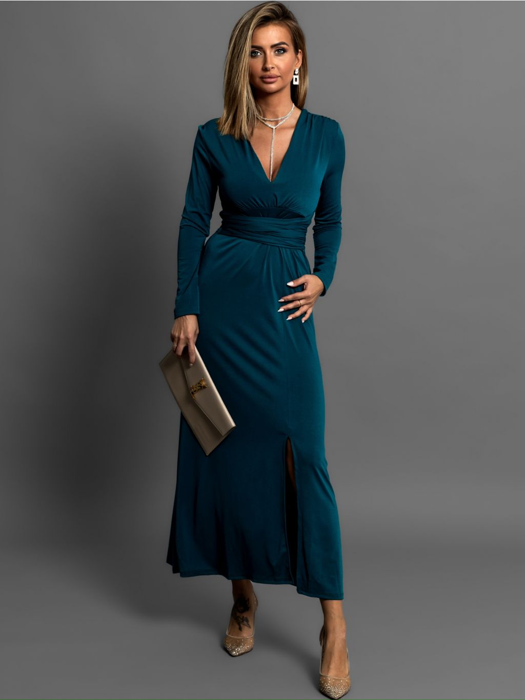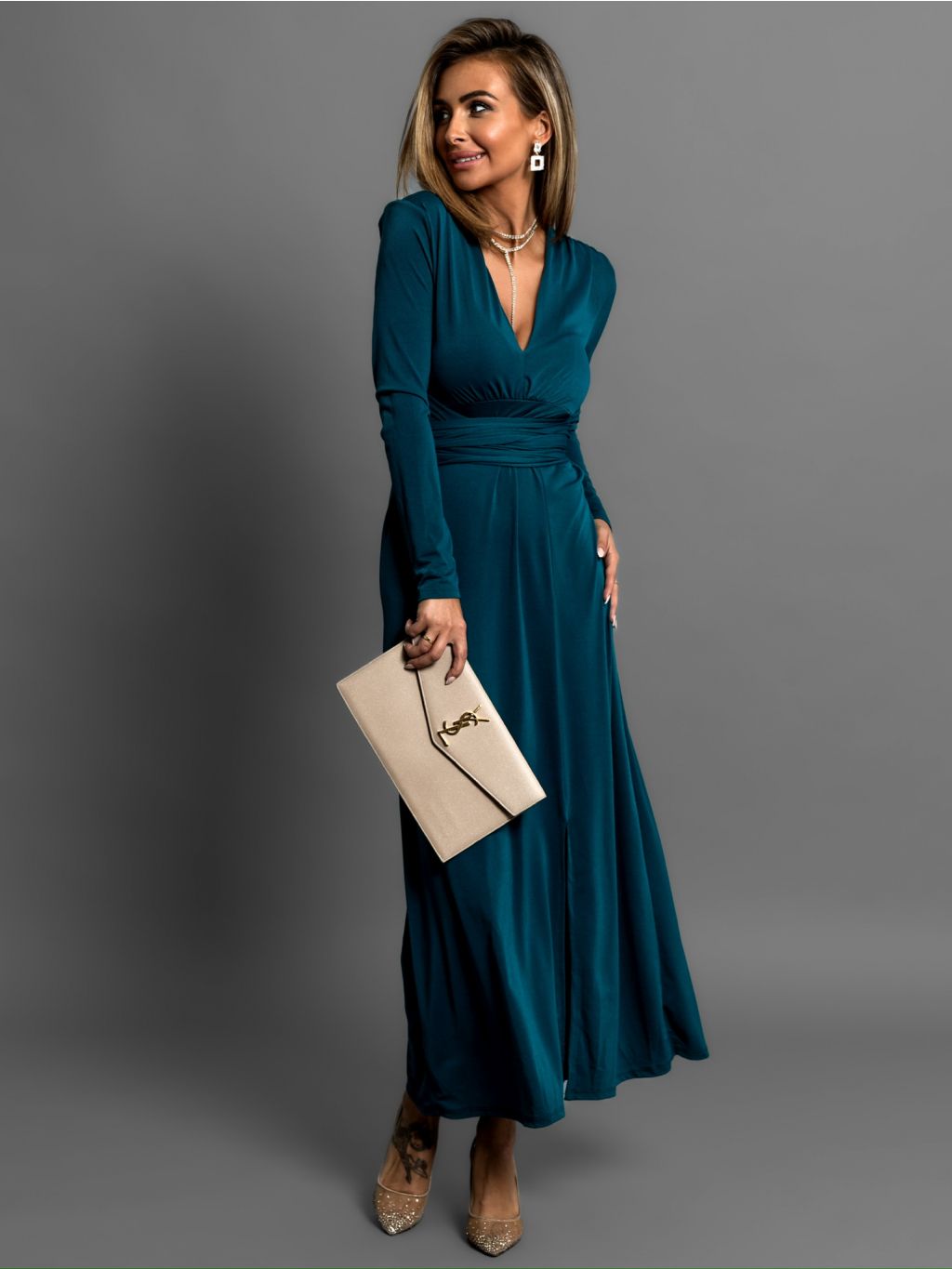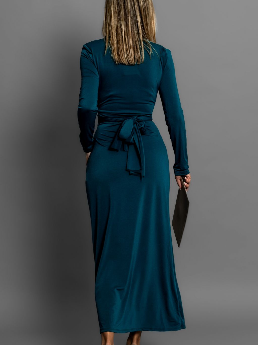 Petrolejové šaty BOTTOM na zaviazanie s dlhým rukávom