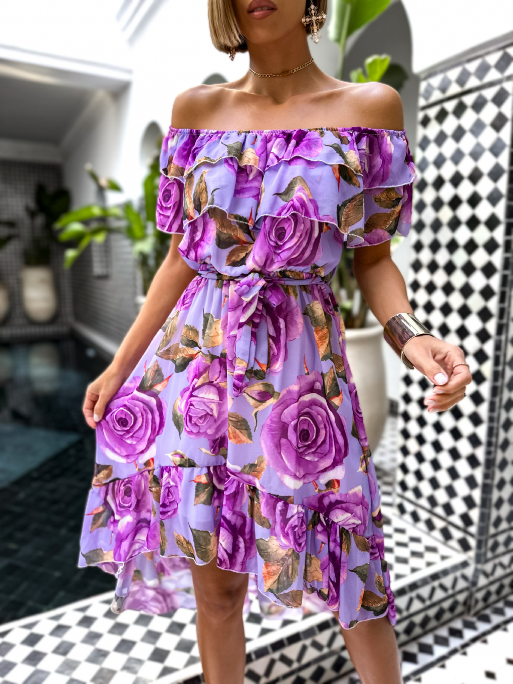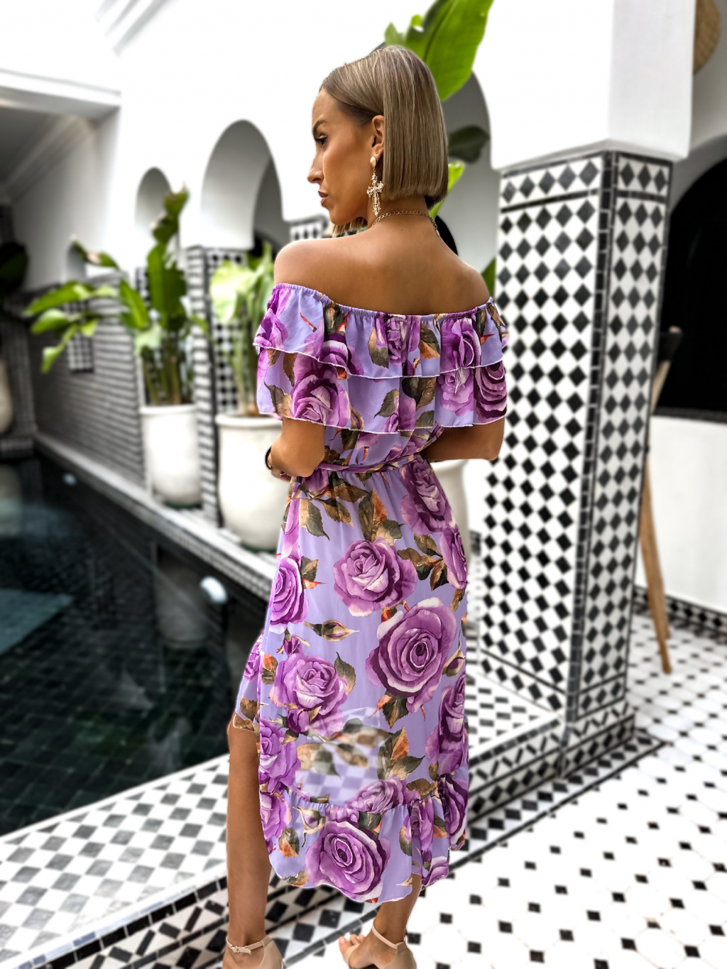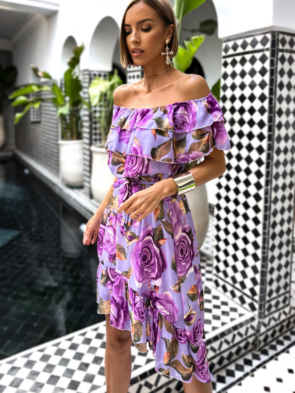 Fialové letné kvetinové šaty ROCCO s volánikmi