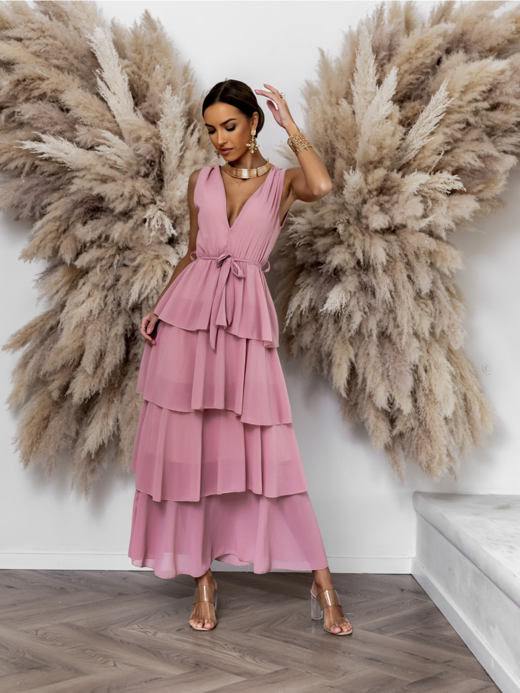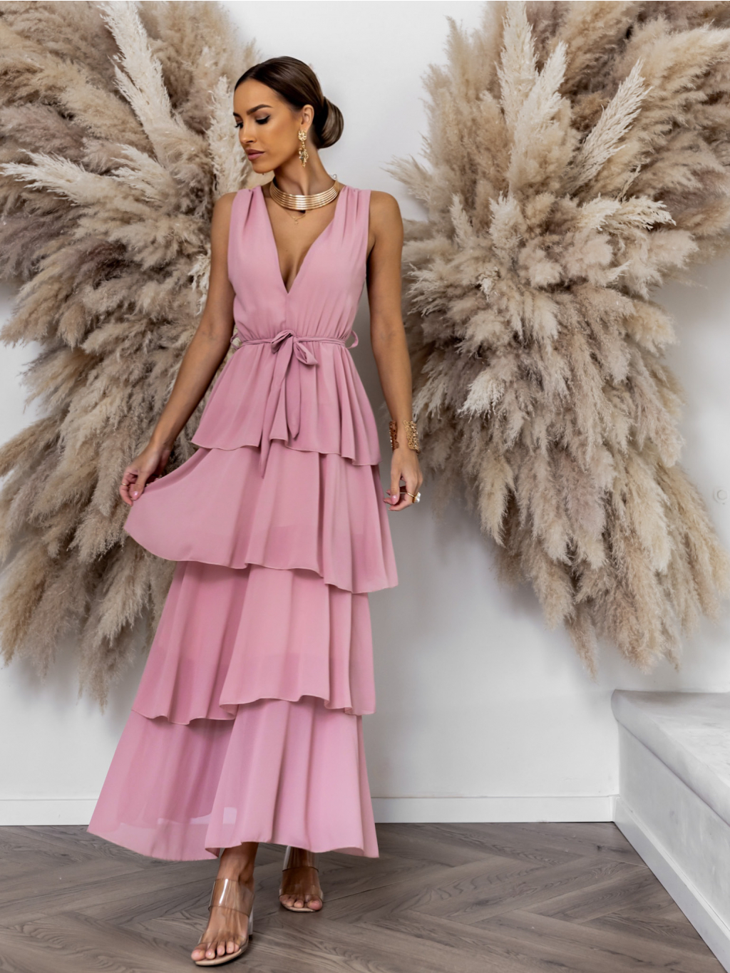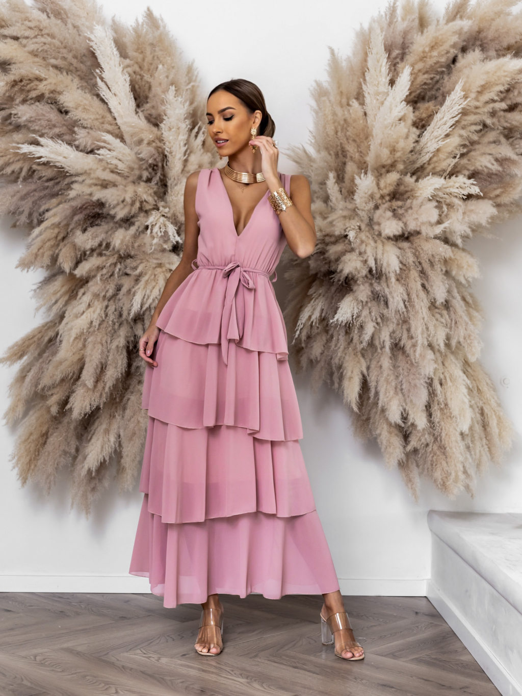 Staroružové dlhé šaty SUSANI s volánikmi pre družičky