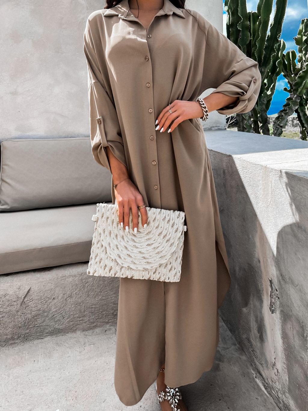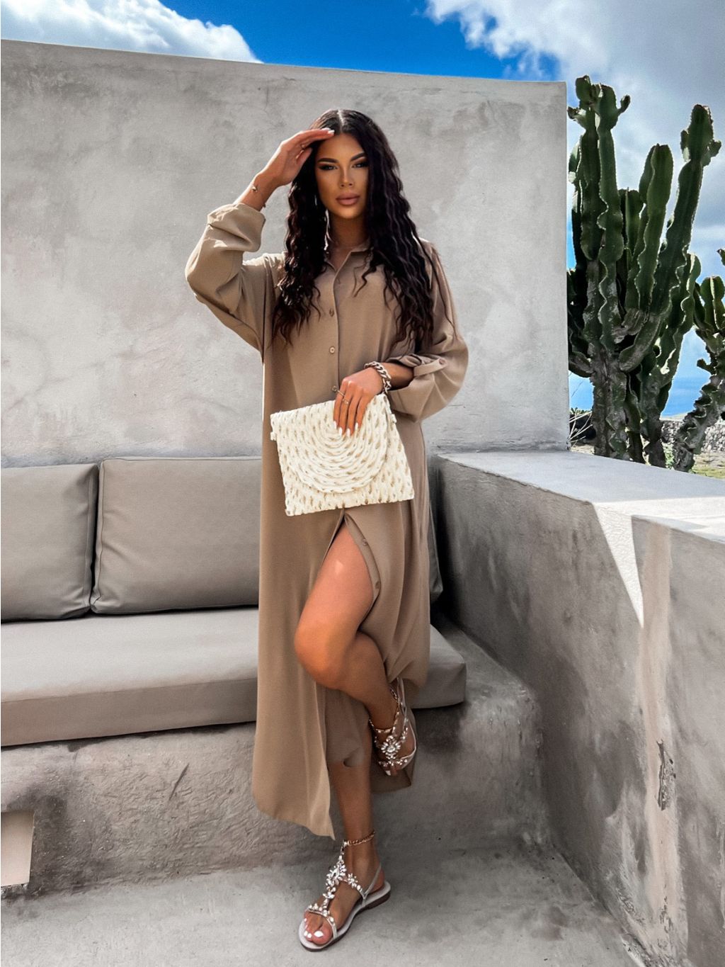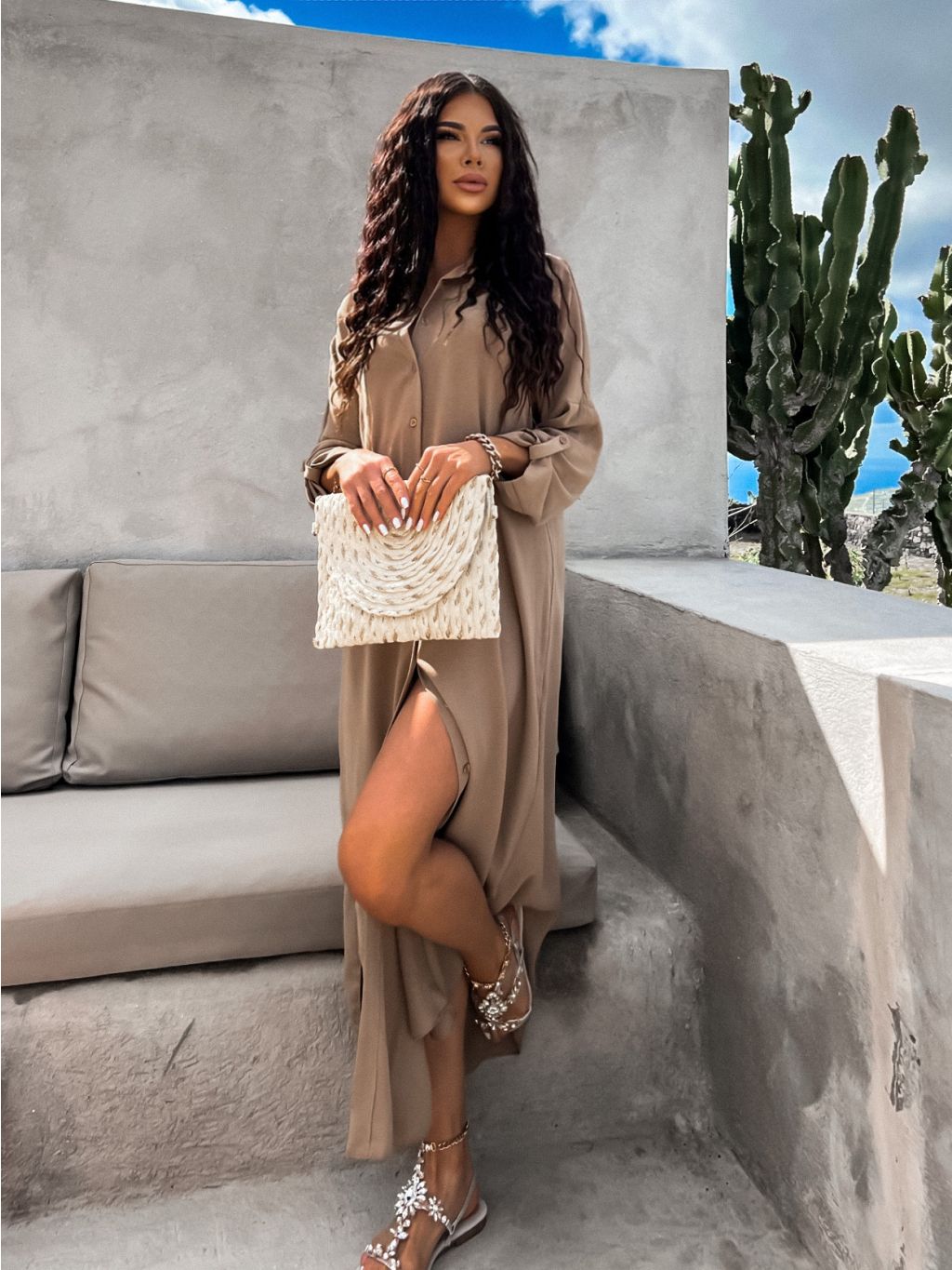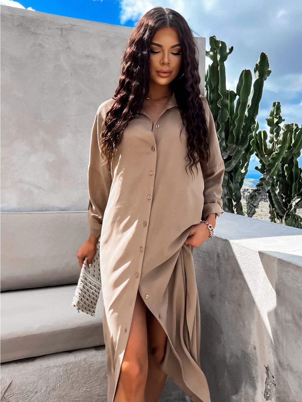 Béžové dlhé košeľové šaty NESSY