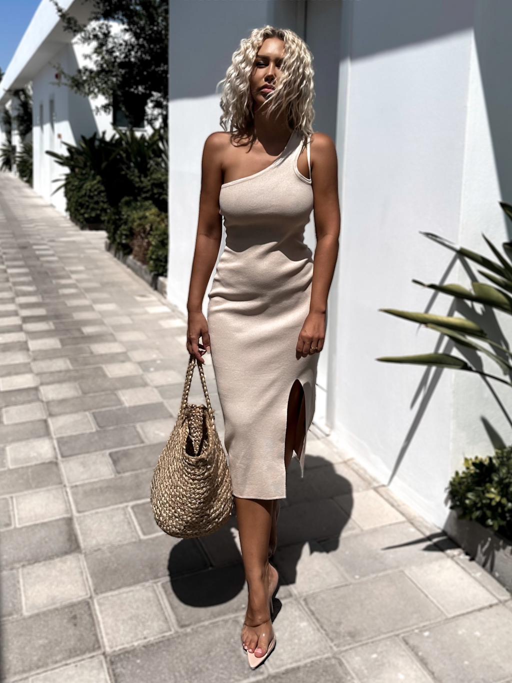 Béžové elegantné šaty LOUDE cez jedno rameno