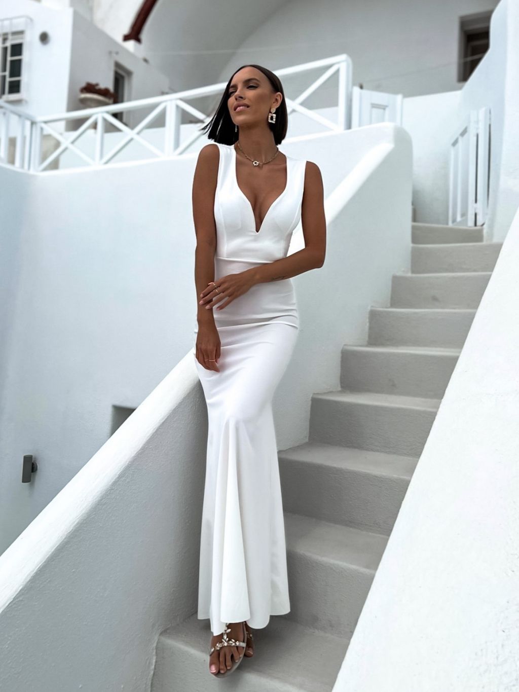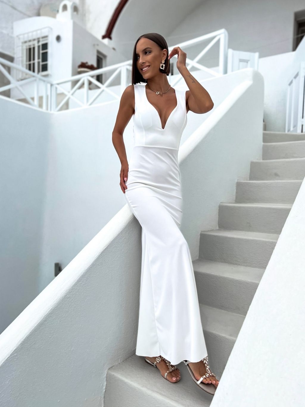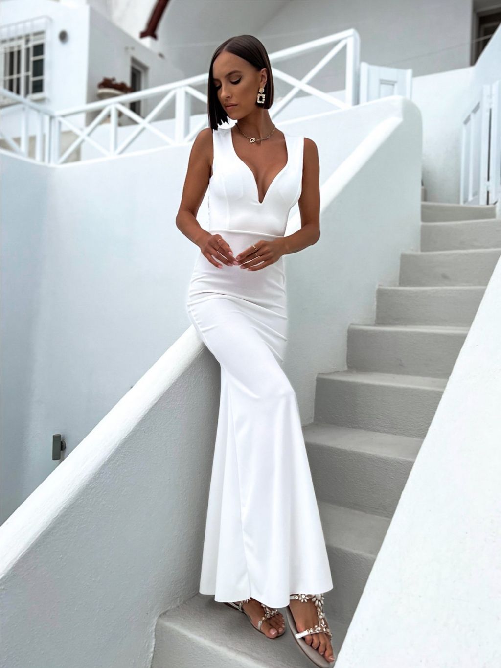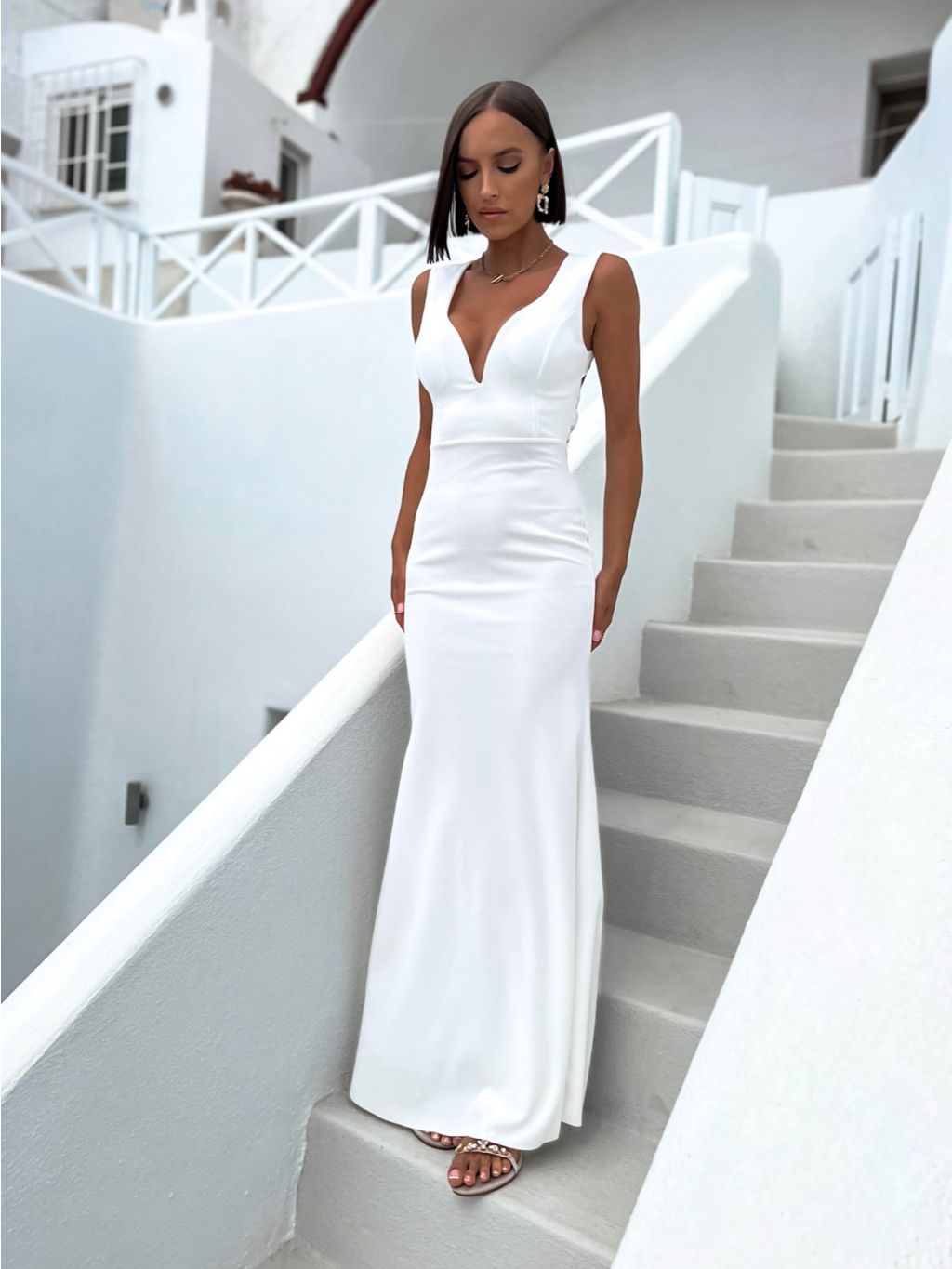 Biele dlhé elegantné šaty AZALEY s výstrihom do V