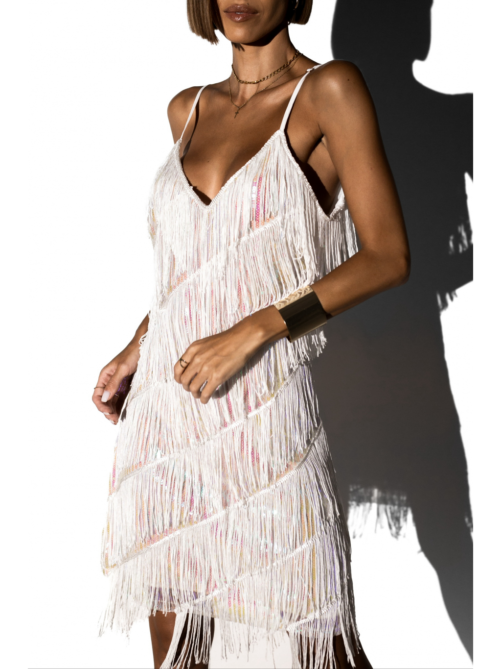 Biele elegantné šaty PUTRI s flitrami a strapcami