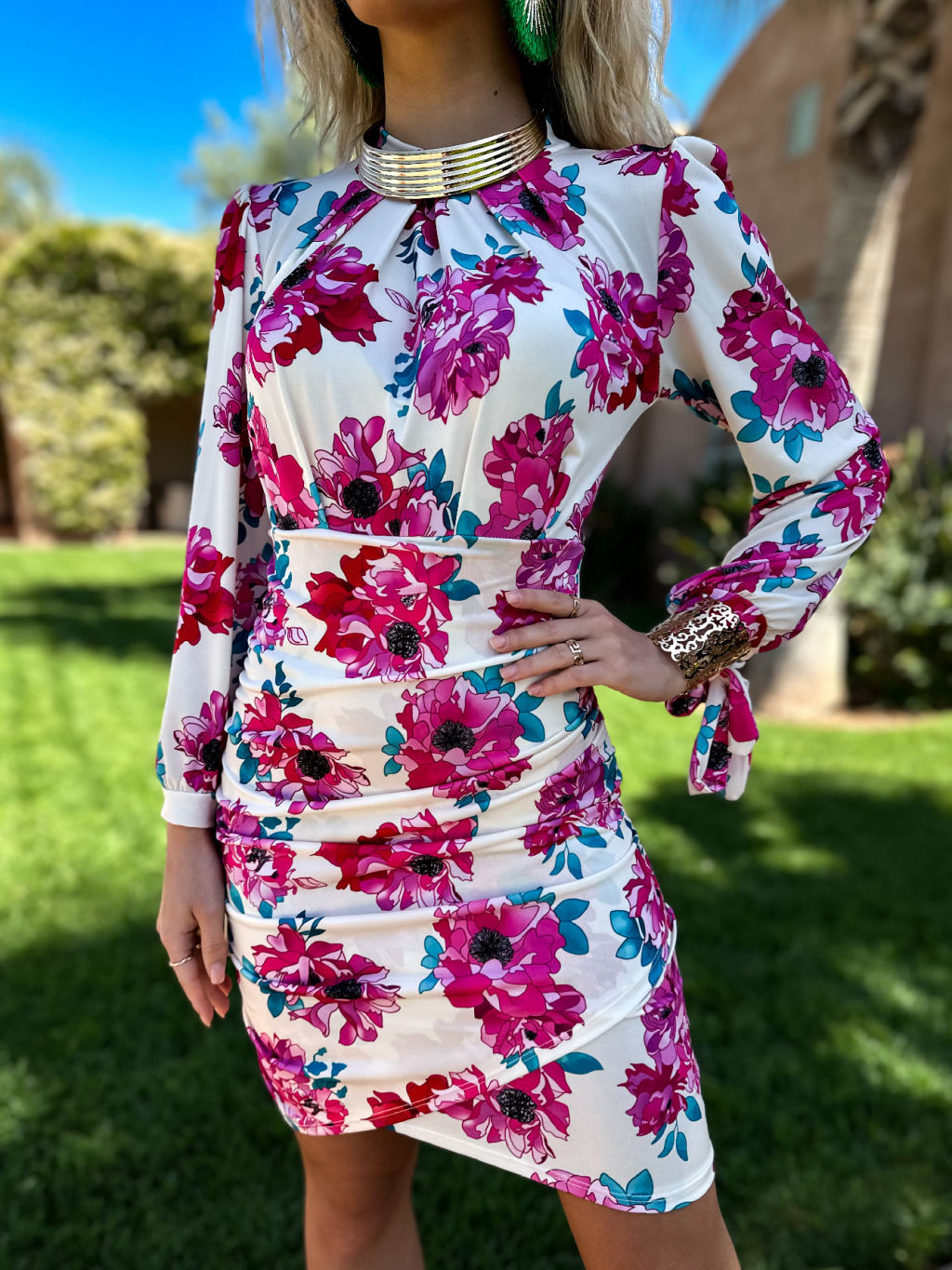 Bieloružové krátke kvetinové šaty YARMUR s dlhým rukávom