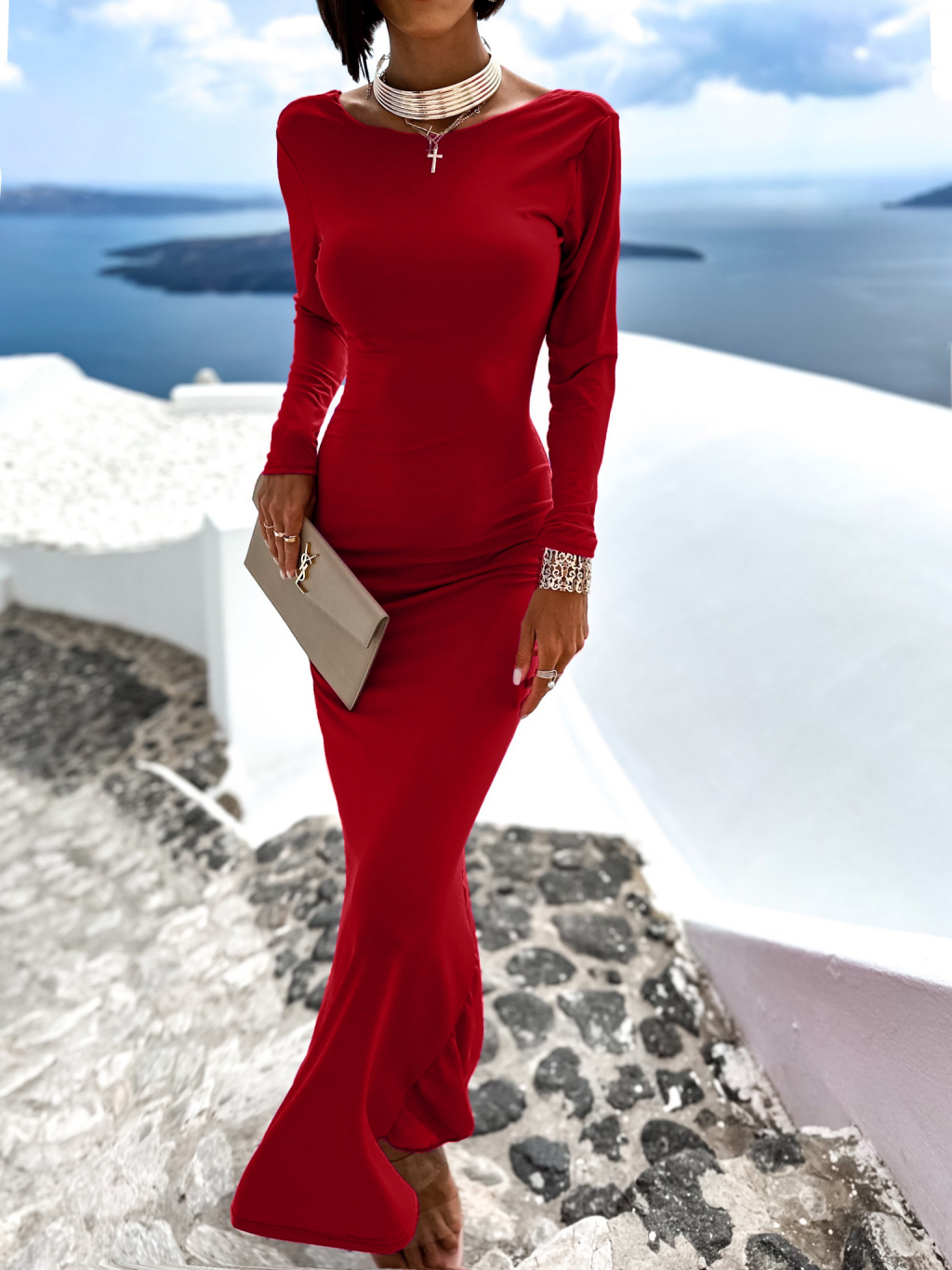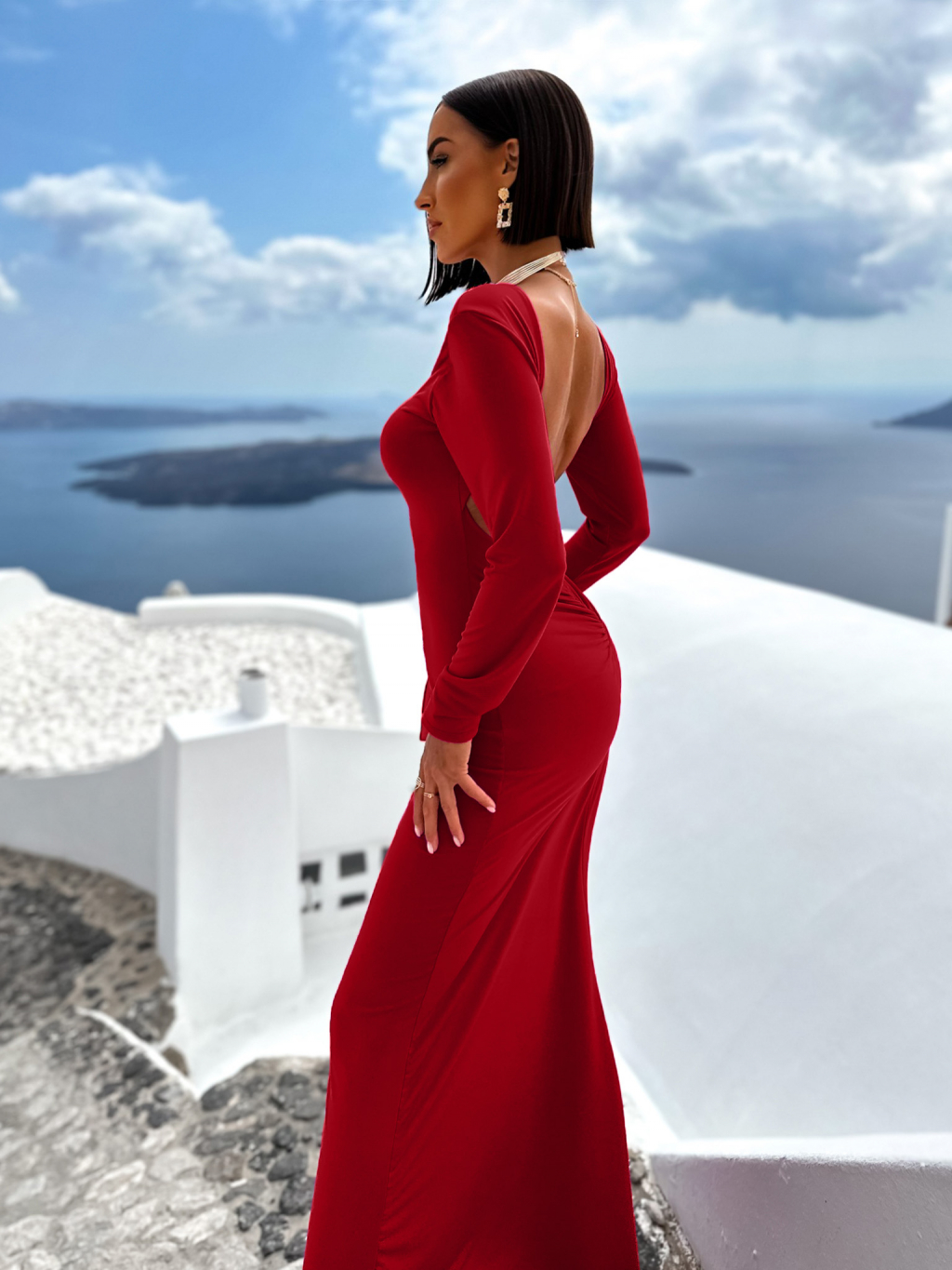 Bordové dlhé elegantné šaty NINTENI s prestrihom na chrbte