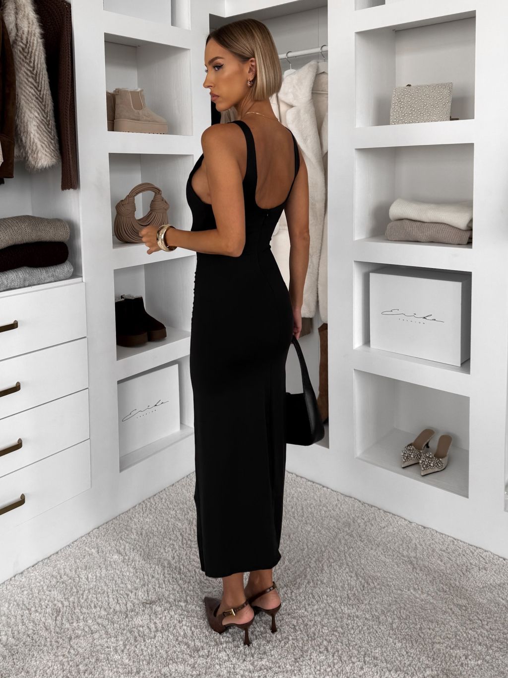 Čierne dlhé šaty DENVIQUE s riasením a rázporkom