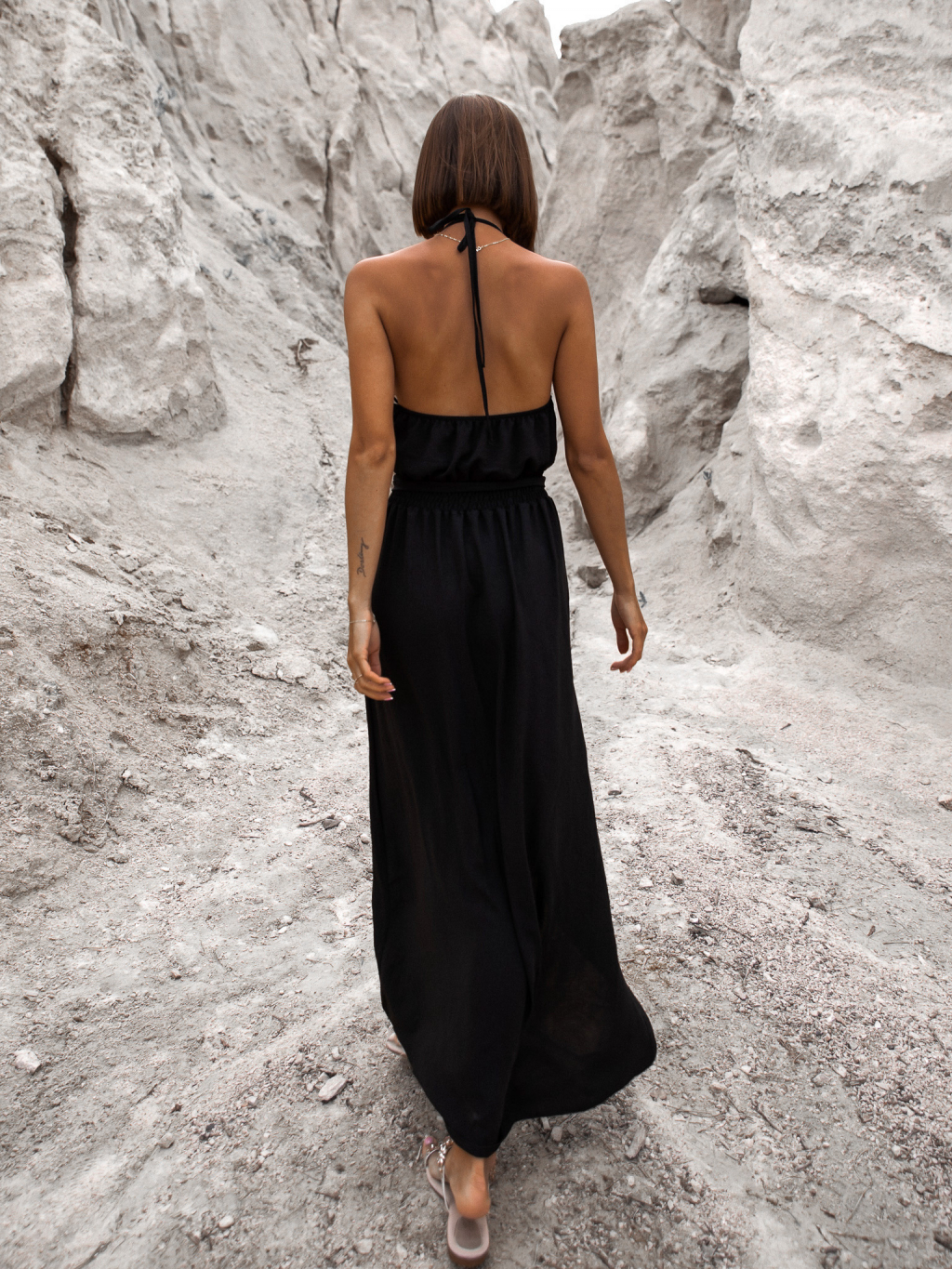 Čierne dlhšie elegantné šaty MYSTIS s rázporkami