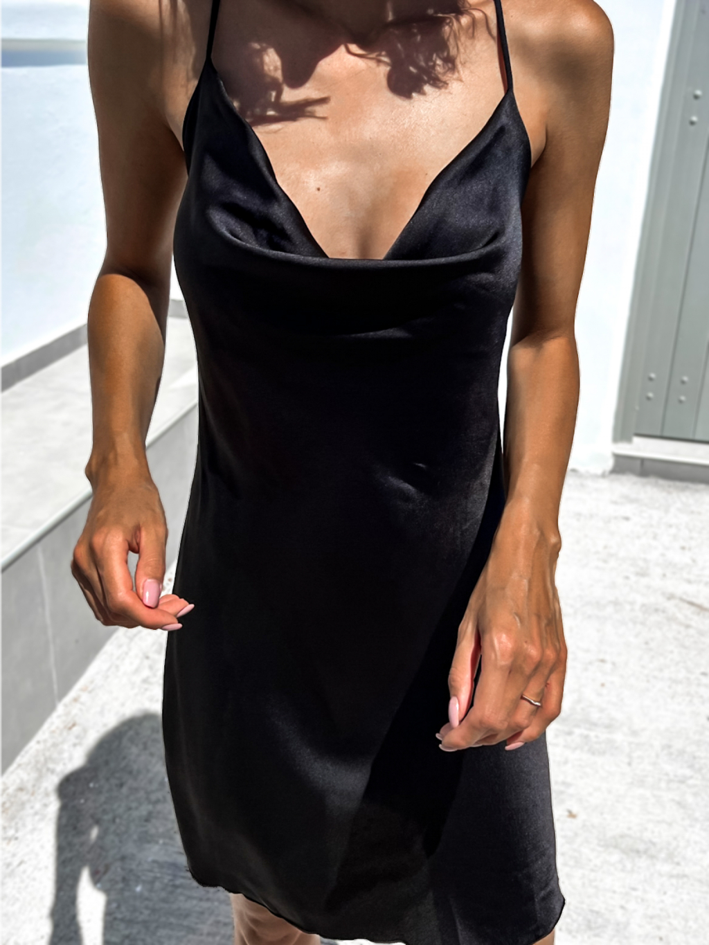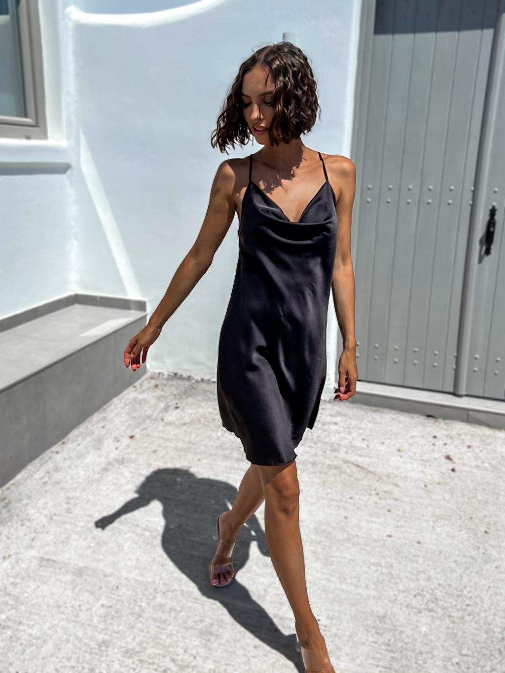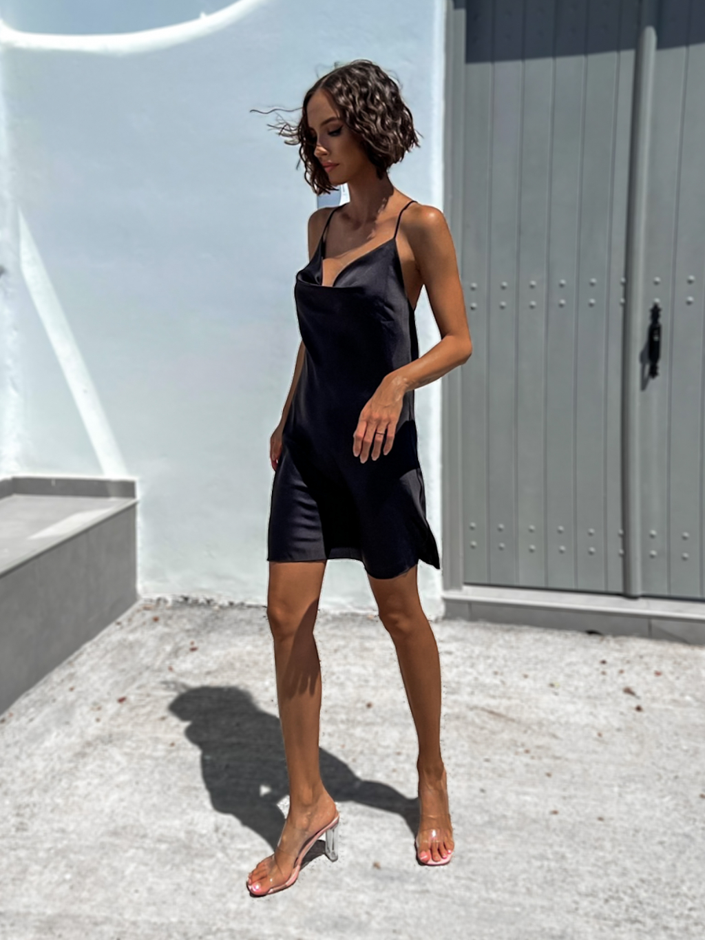 Čierne lesklé šaty IZZY s tenkými ramienkami