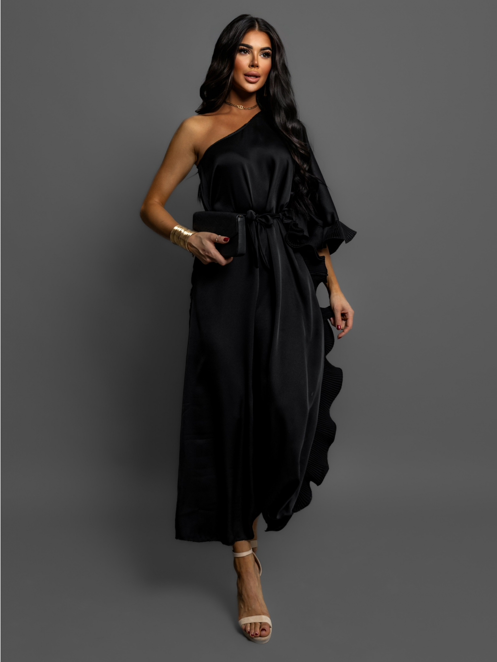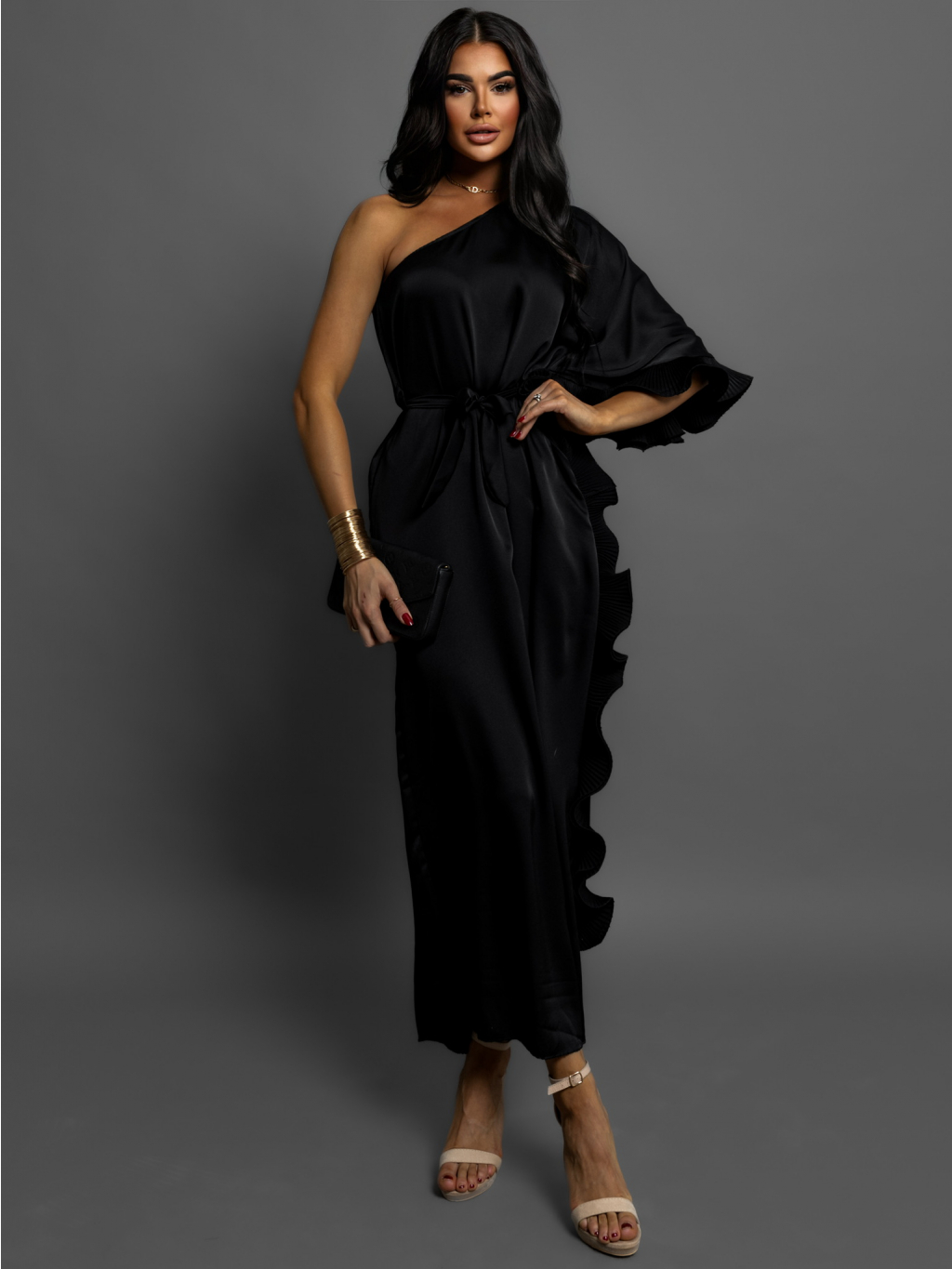 Čierne volánikové šaty DORRY cez jedno rameno