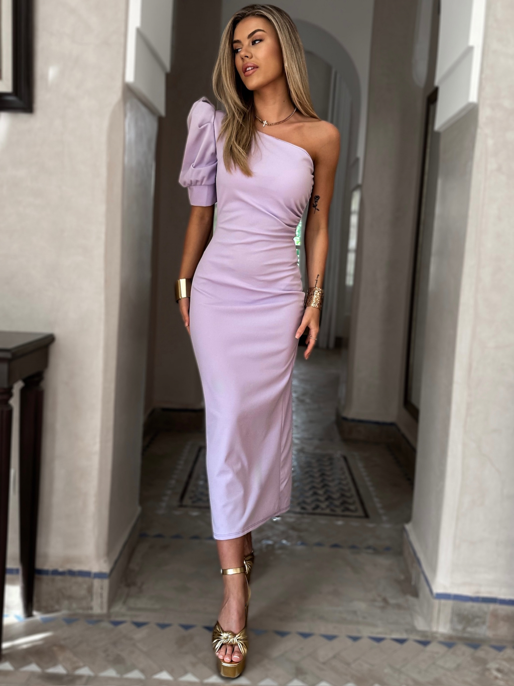 Fialové elegantné midišaty ROMANES na jedno rameno