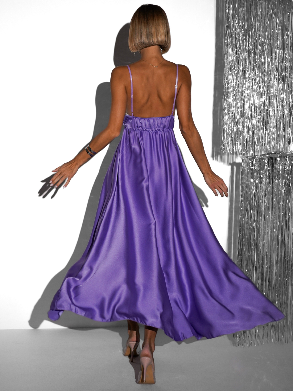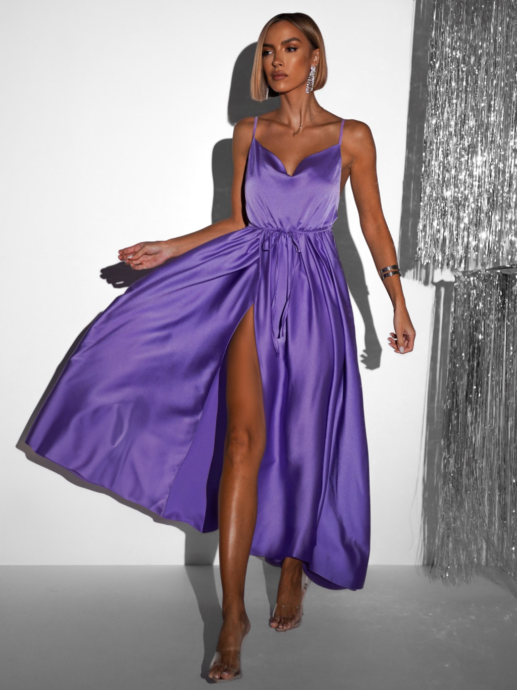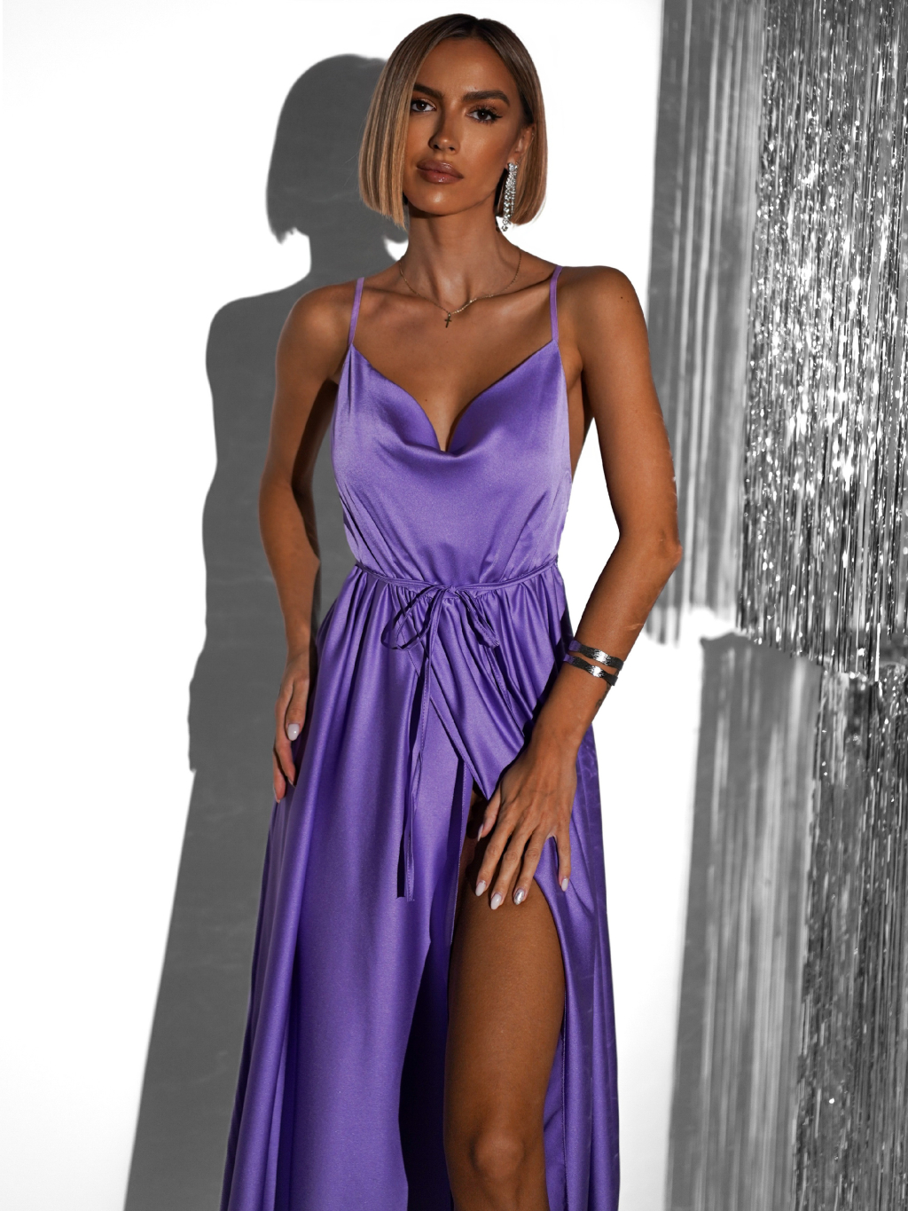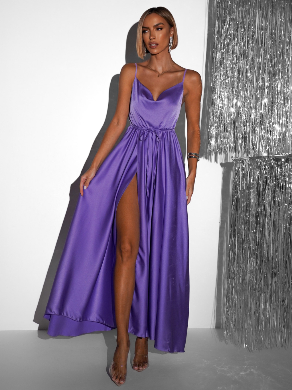 Fialové lesklé elegantné šaty YASMINE s rázporkom