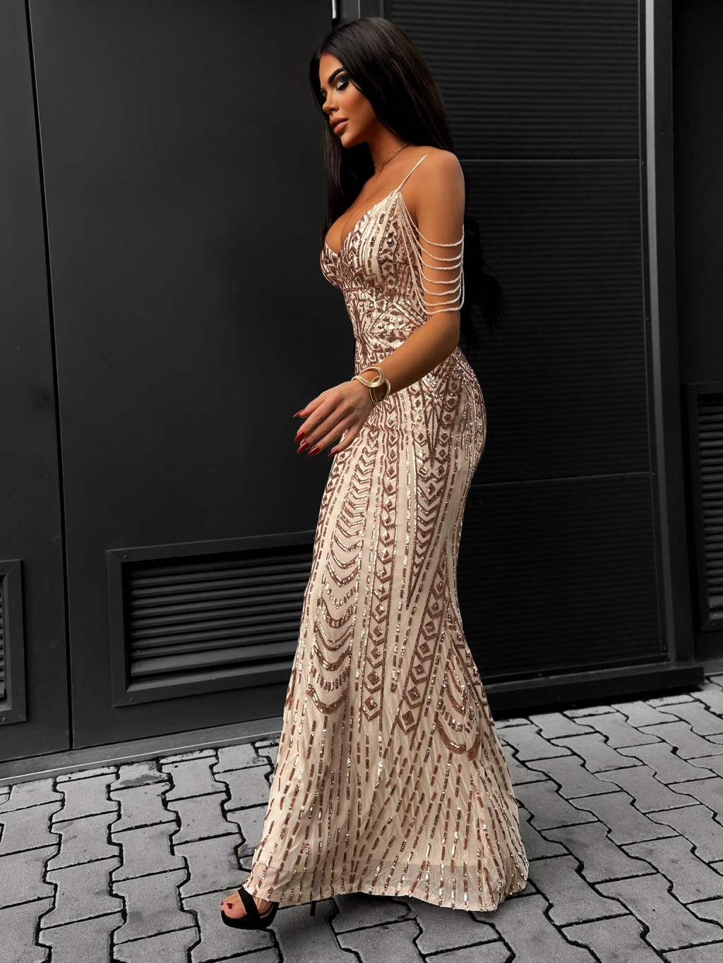 Hnedé dlhé plesové šaty PILOTE s flitrami