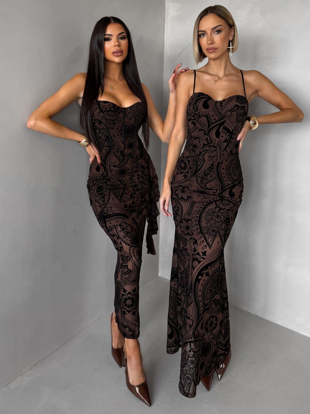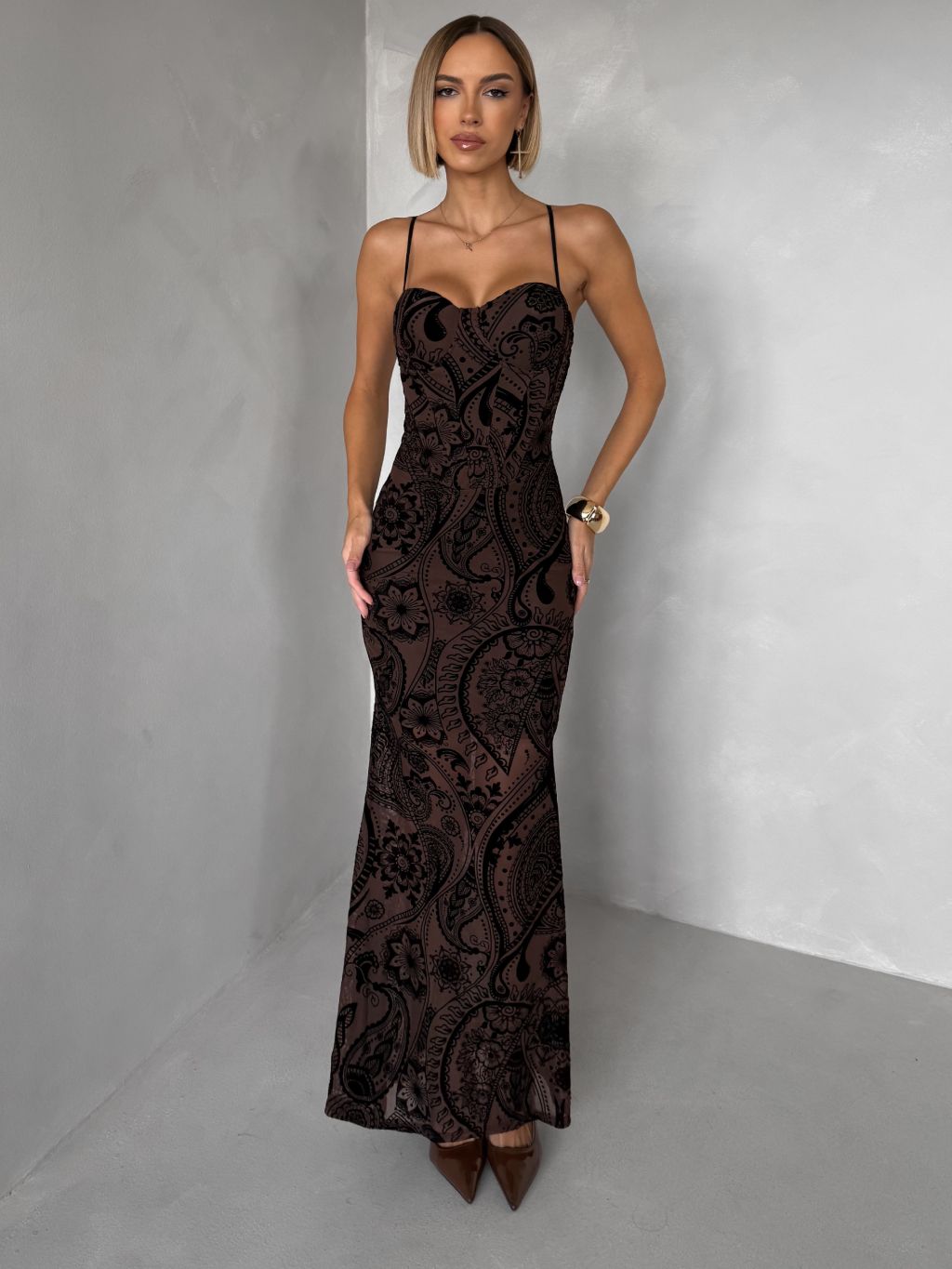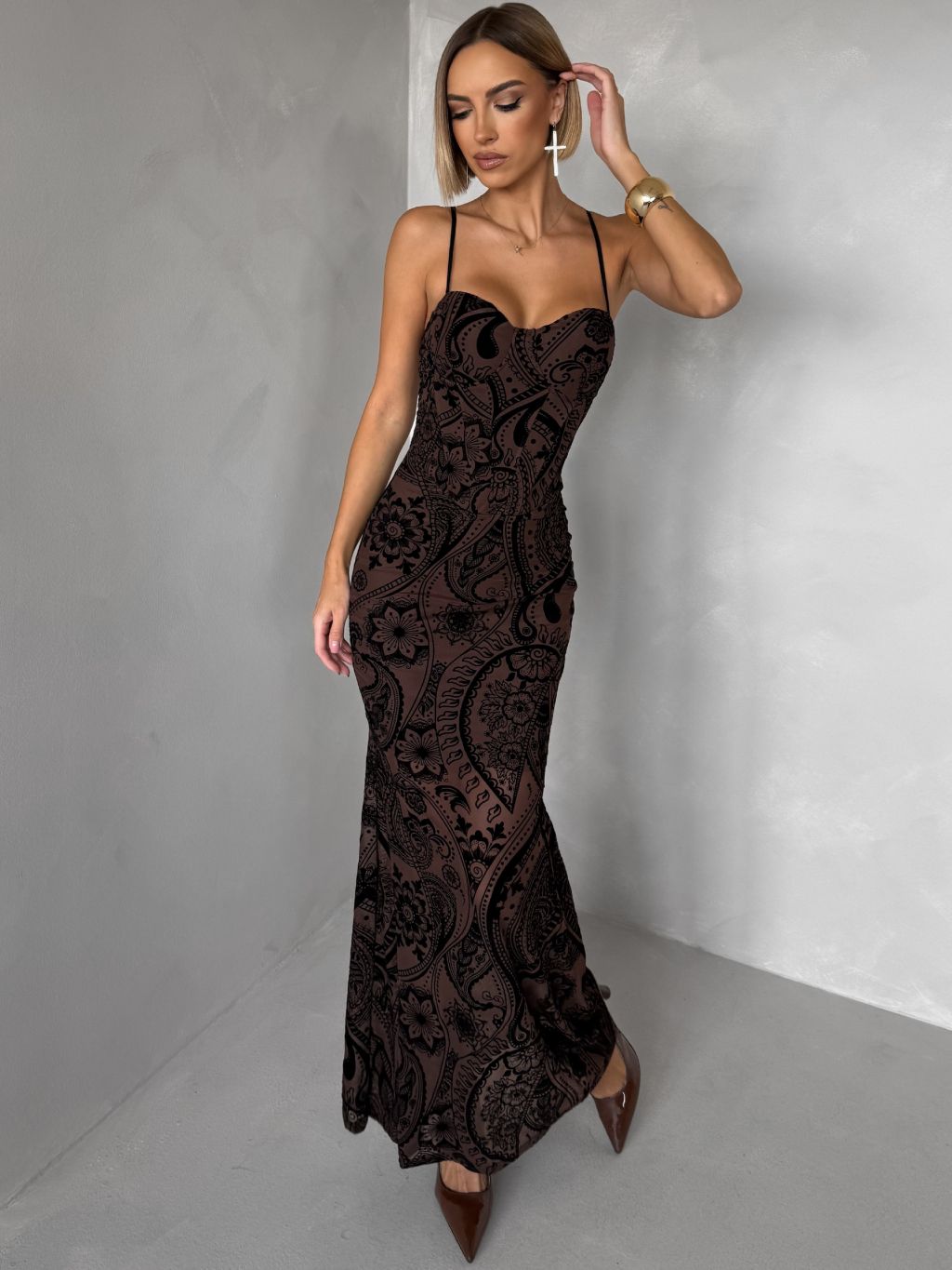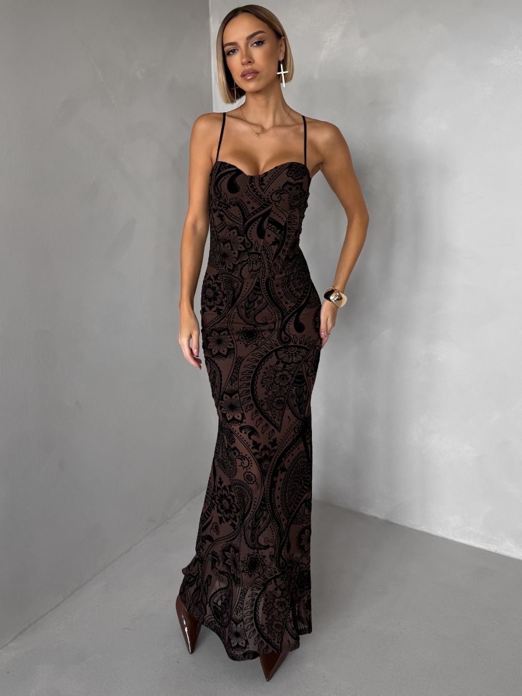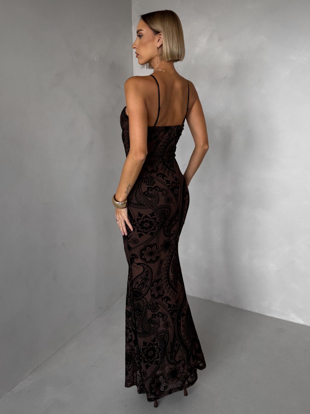 Hnedé dlhé spoločenské šaty AVENZIA na ramienka