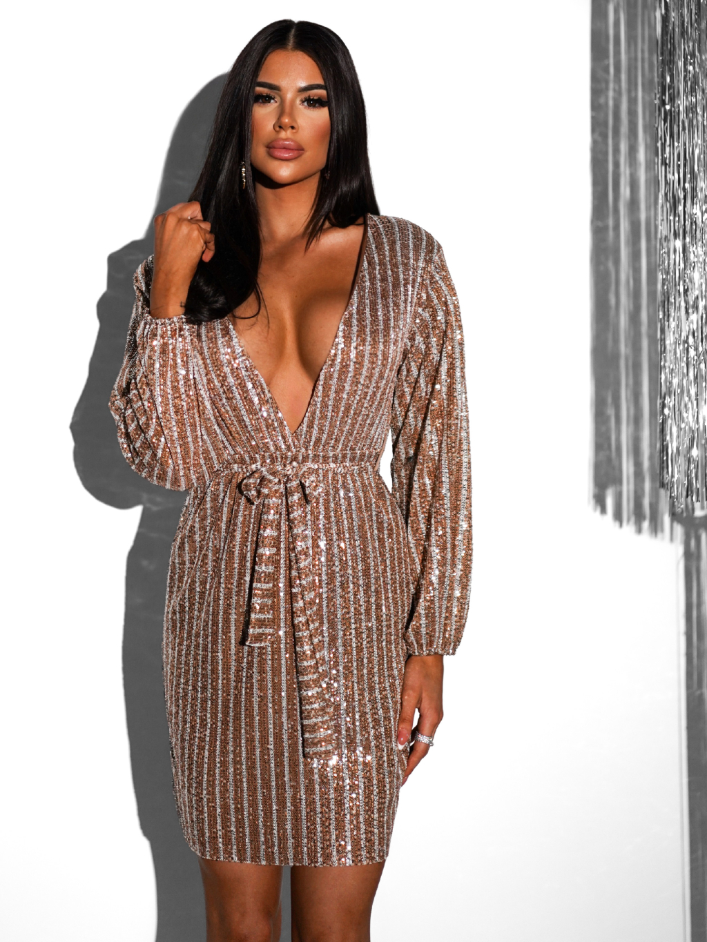 Hnedé krátke flitrované šaty LEVELY s výstrihom