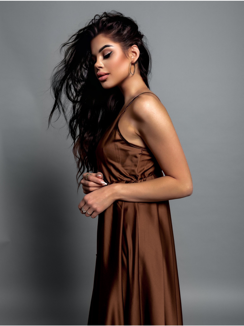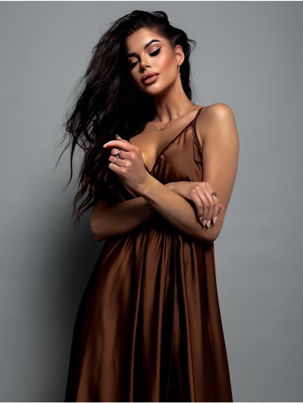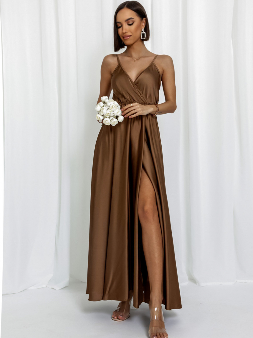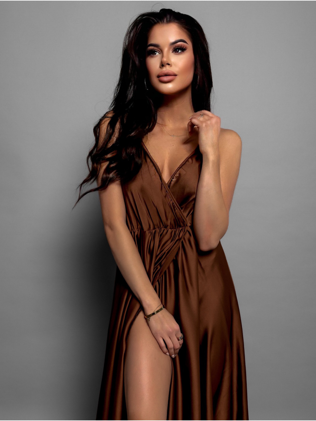 Hnedé lesklé dlhé plesové šaty CHRYSANTHE