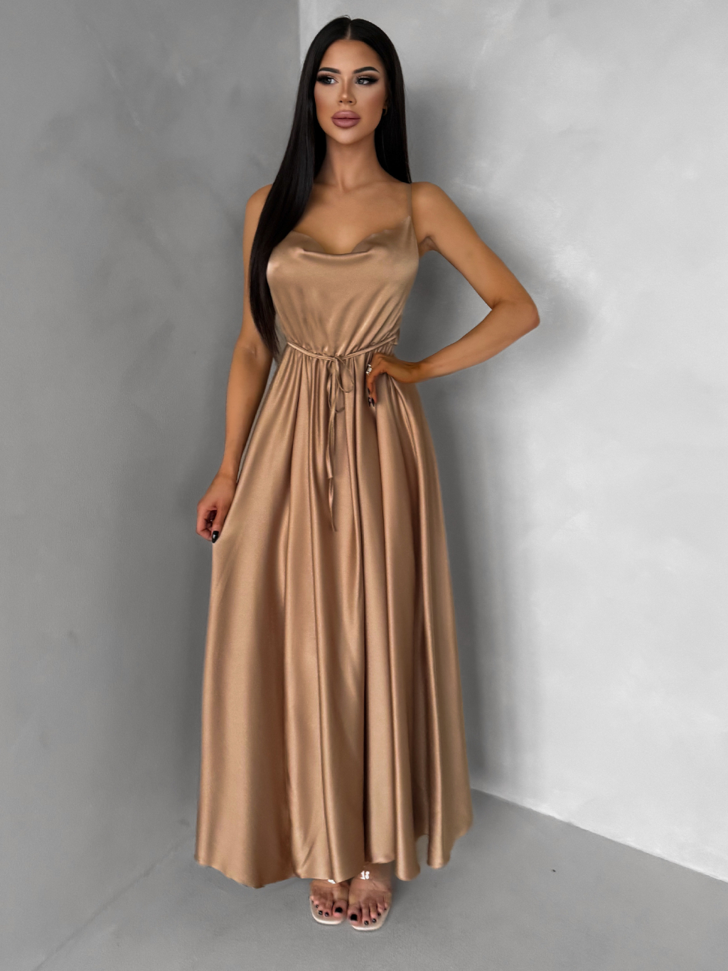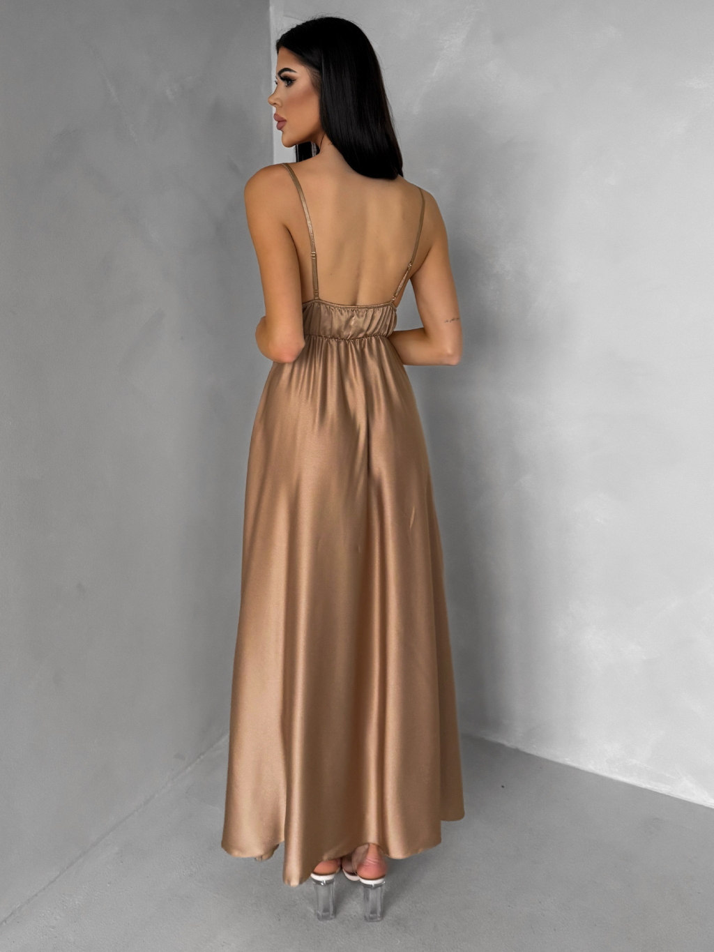 Hnedé lesklé elegantné šaty YASMINE s rázporkom