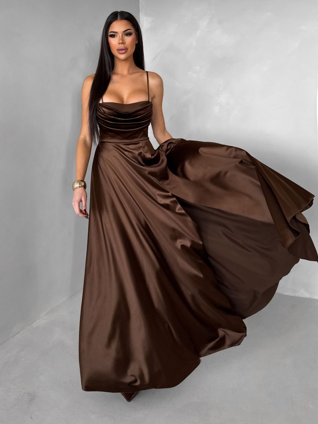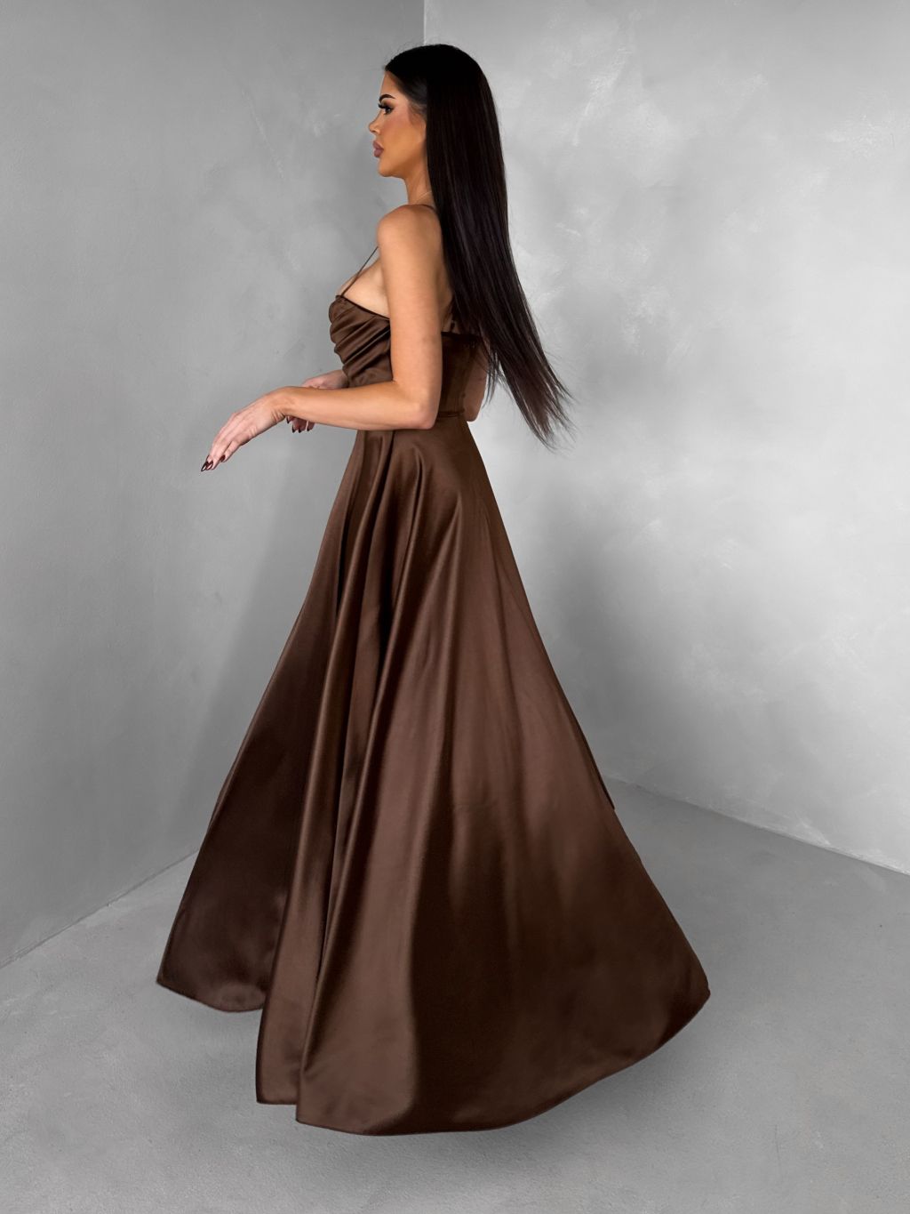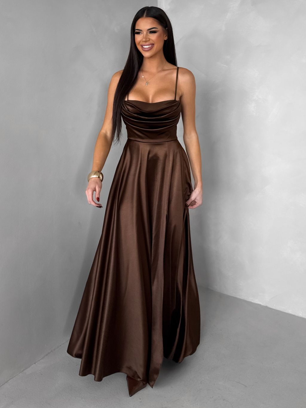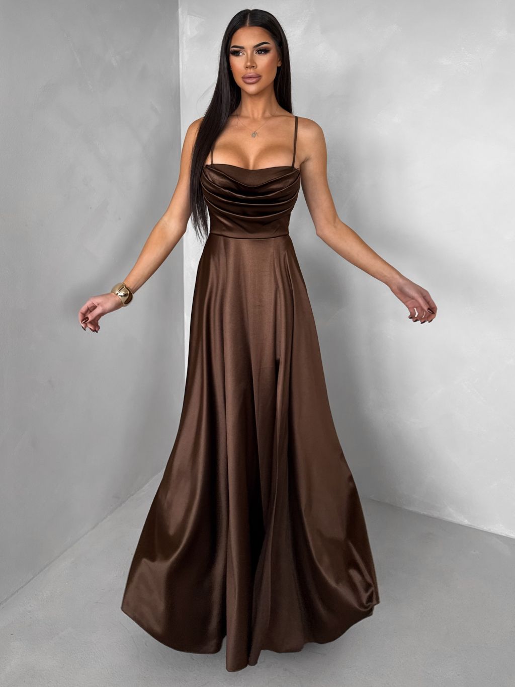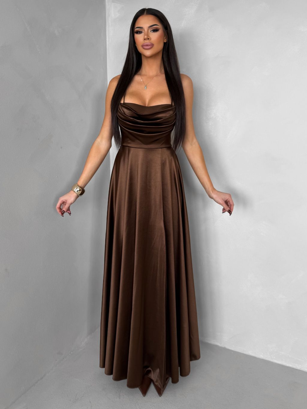 Hnedé saténové dlhé spoločenské šaty LUNOREX