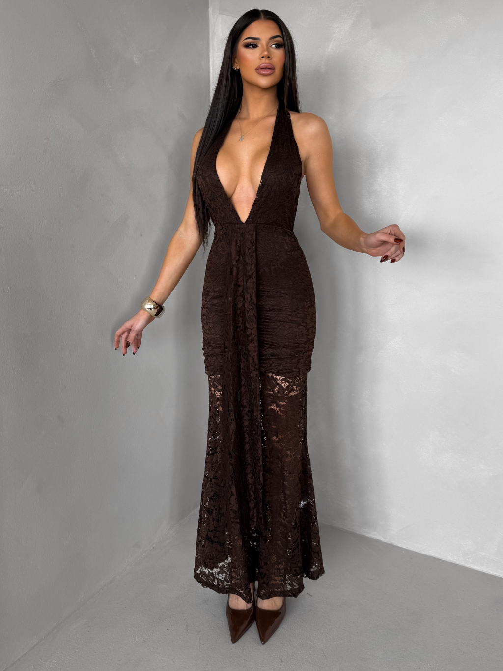 Hnedé spoločenské dlhé krajkové viazacie šaty ZERULON