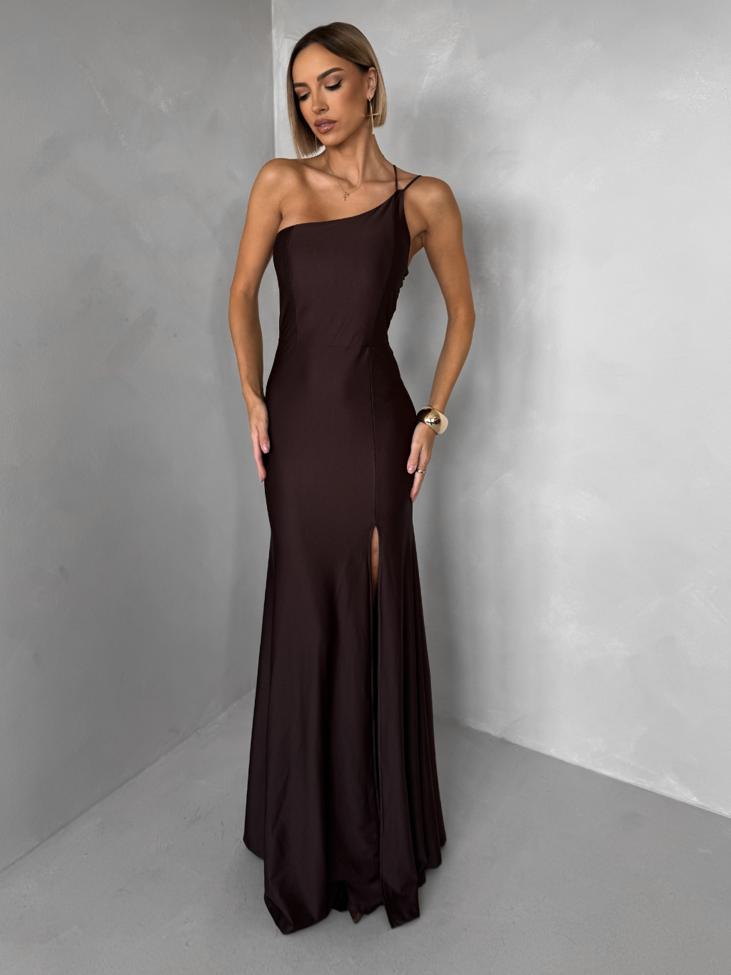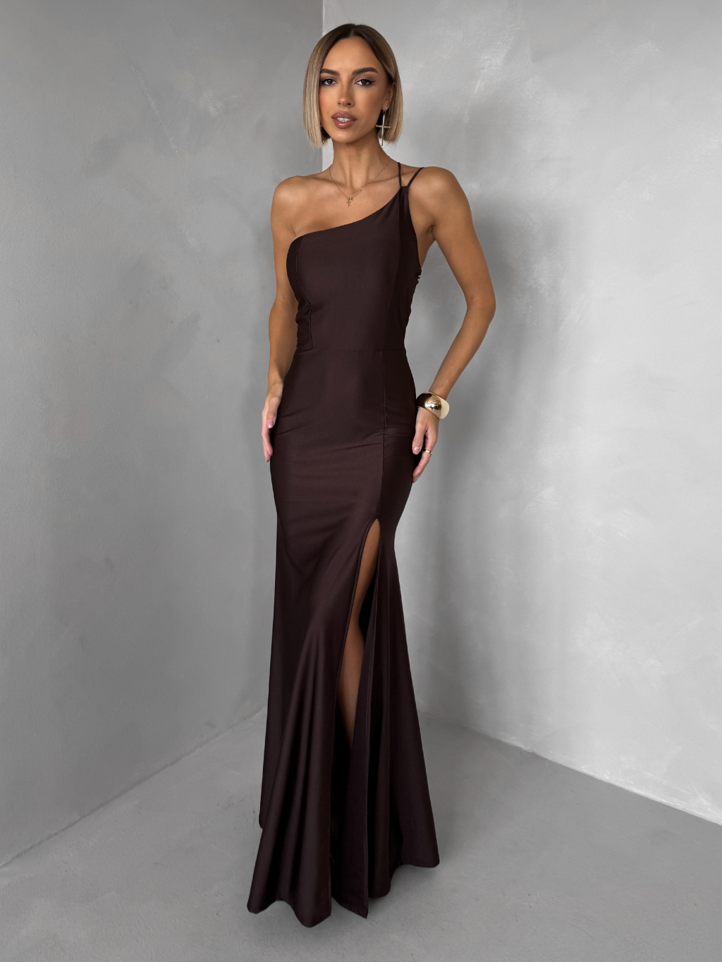 Hnedé spoločenské dlhé šaty GAREVIA s rázporkom