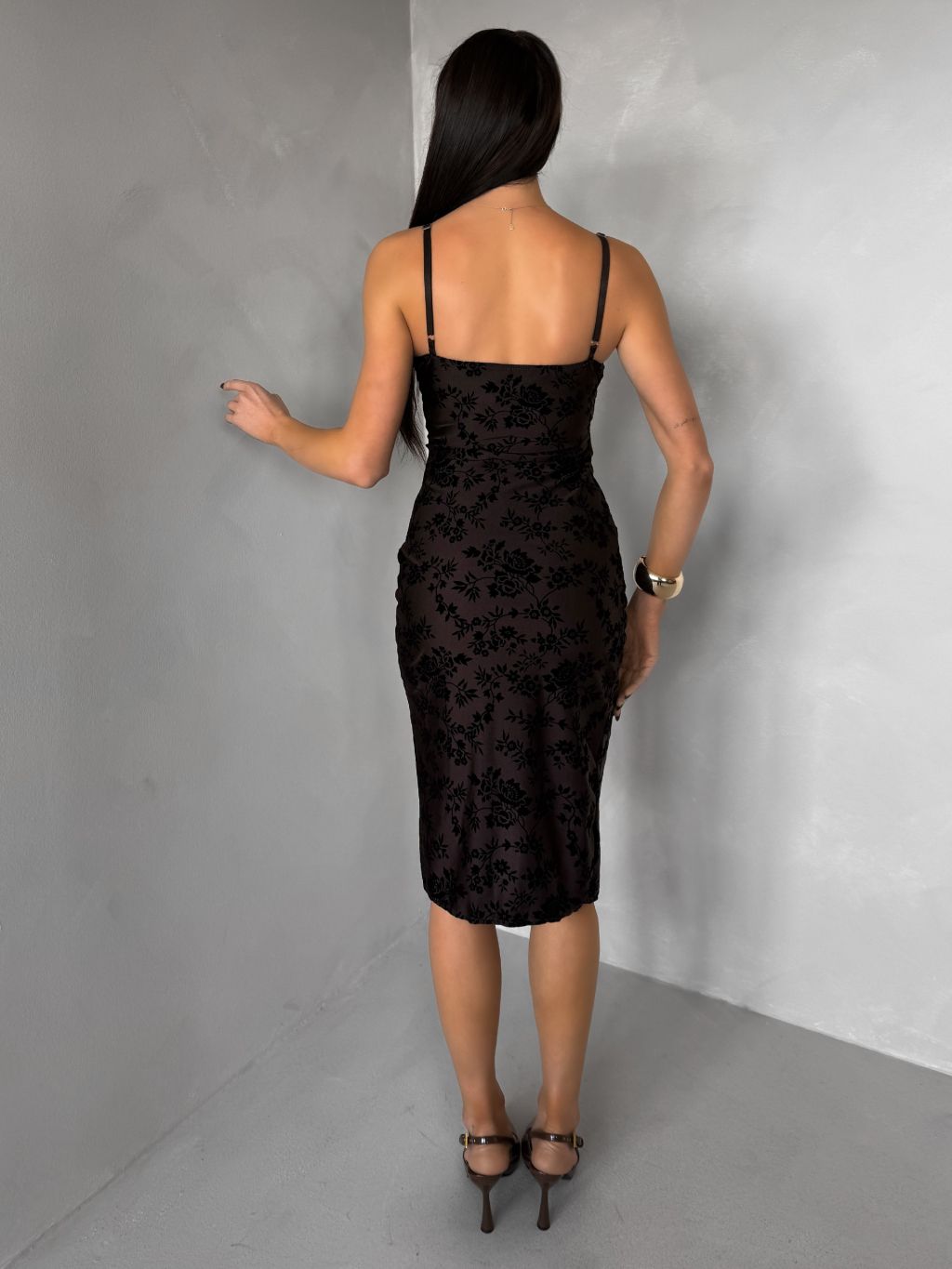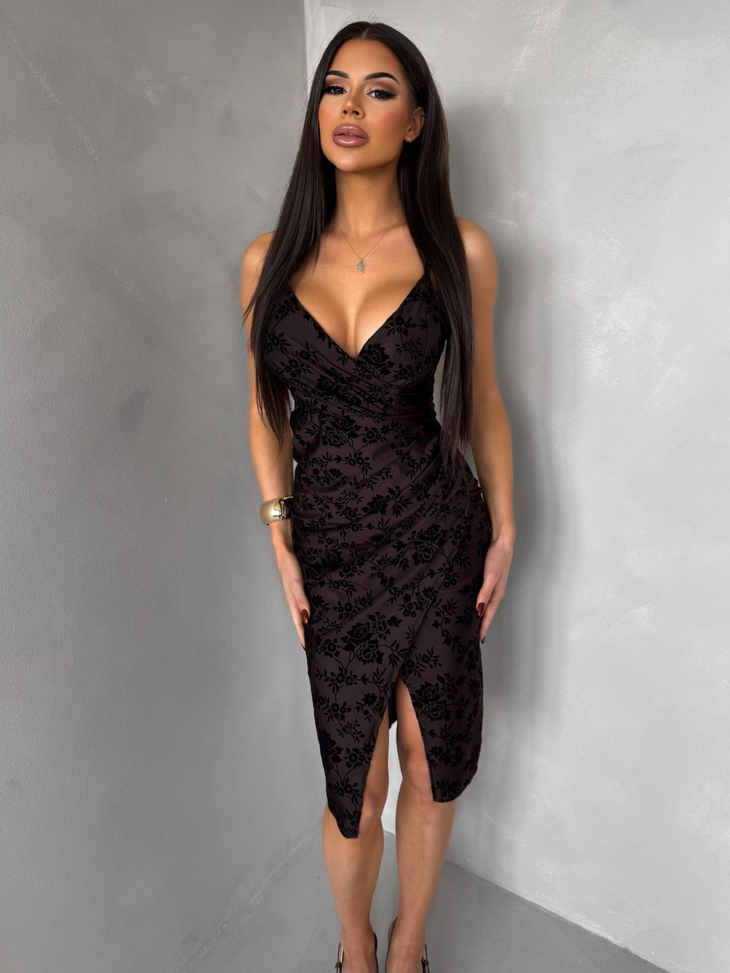 Hnedé spoločenské midi šaty ETNAVA s rázporkom
