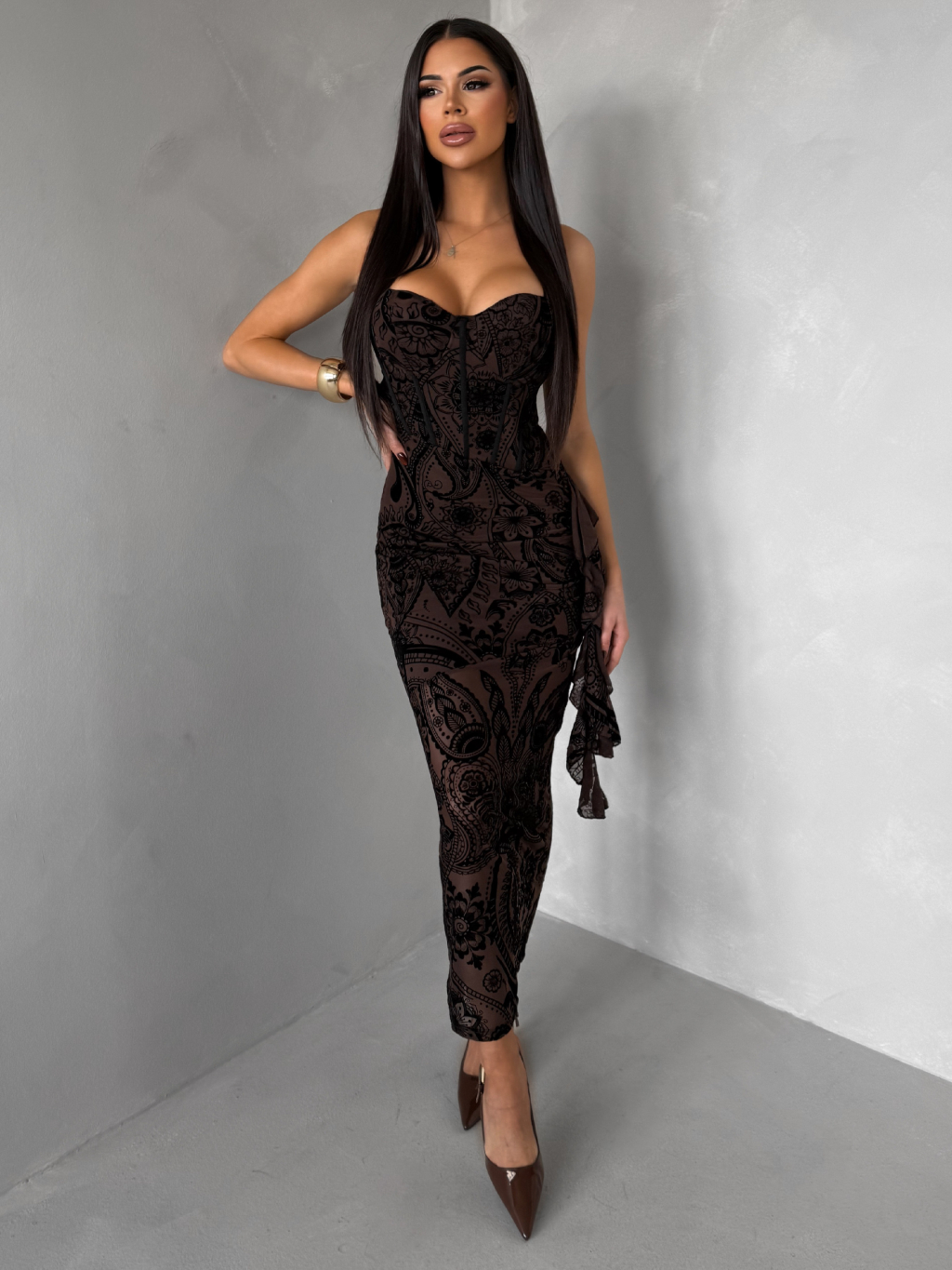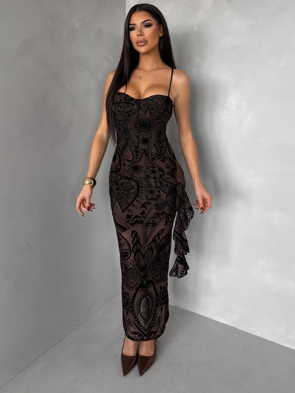 Hnedé vzorované dlhé korzetové šaty SOLVIENE s ramienkami