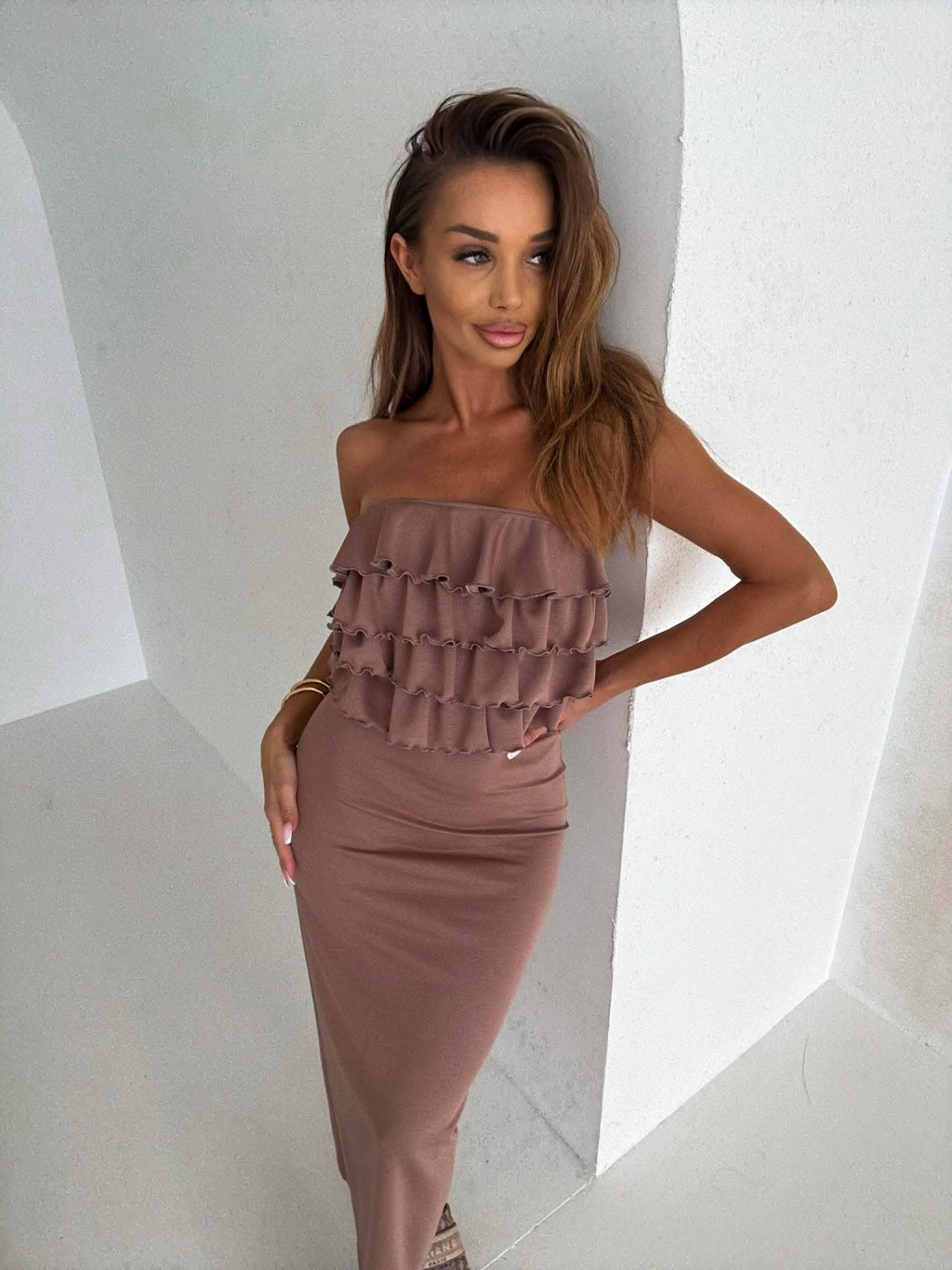 Hnedý elegantný komplet KESINA so sukňou a volánikmi