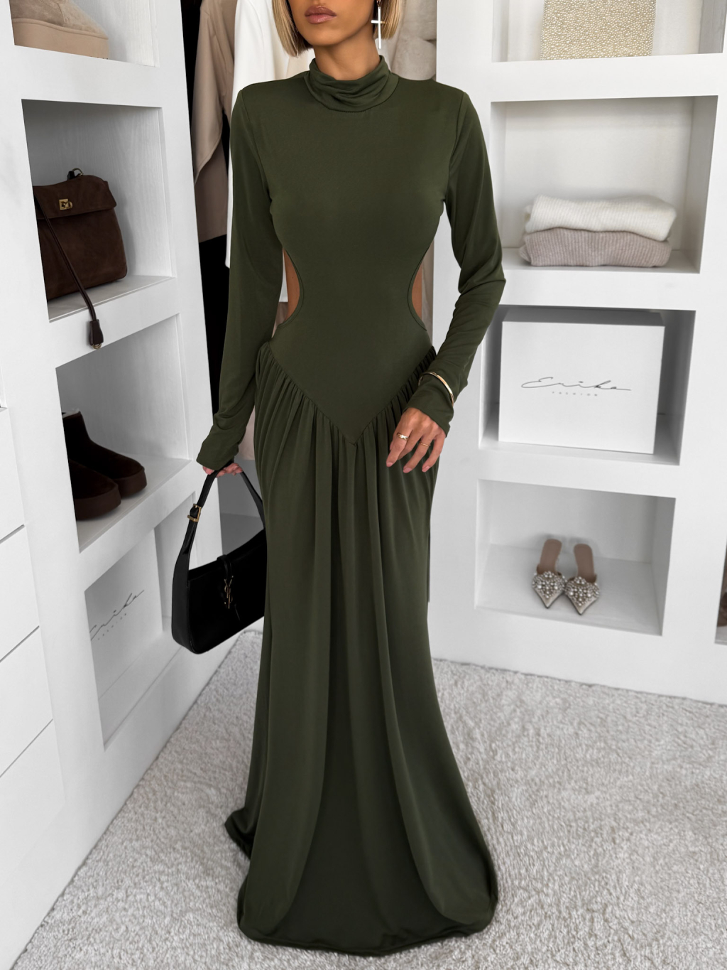 Kaki spoločenské dlhé šaty EVANIE s prestrihmi