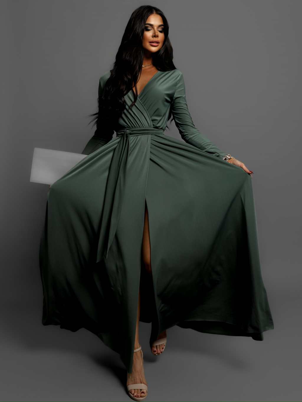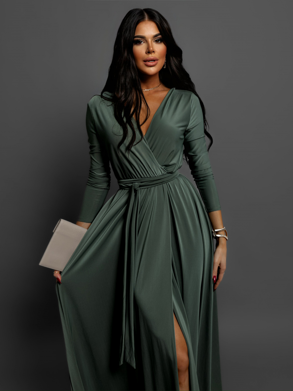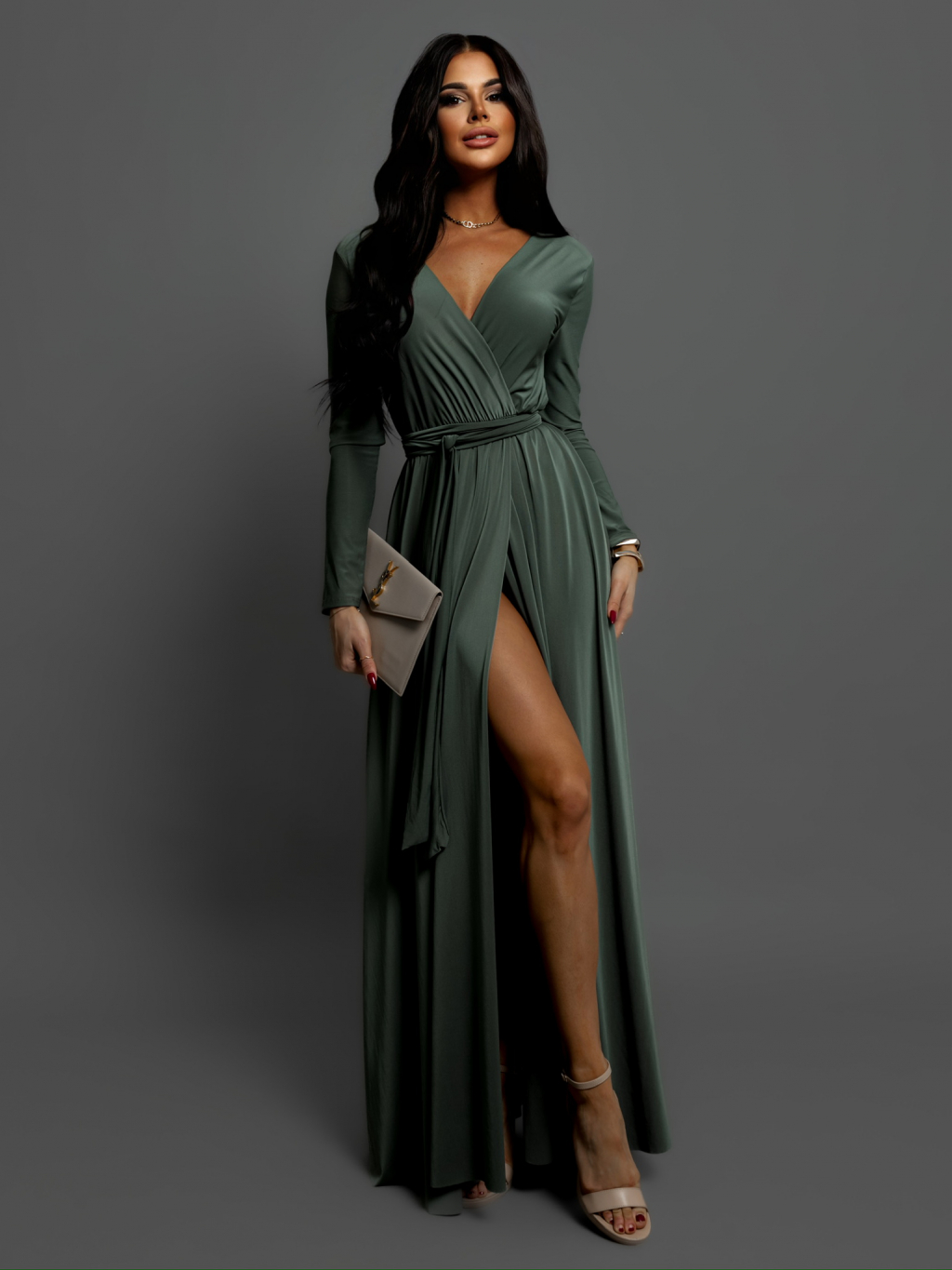 Khaki dlhé elegantné šaty JOELLIAN