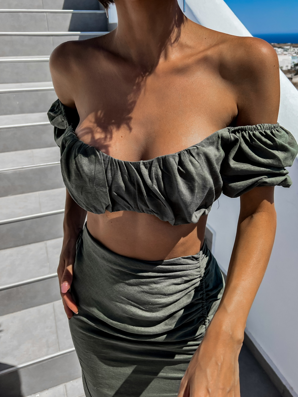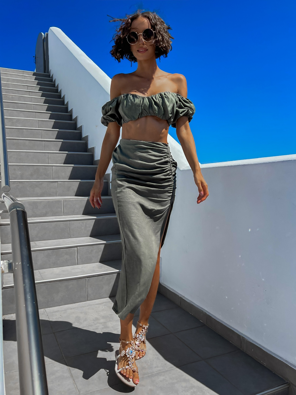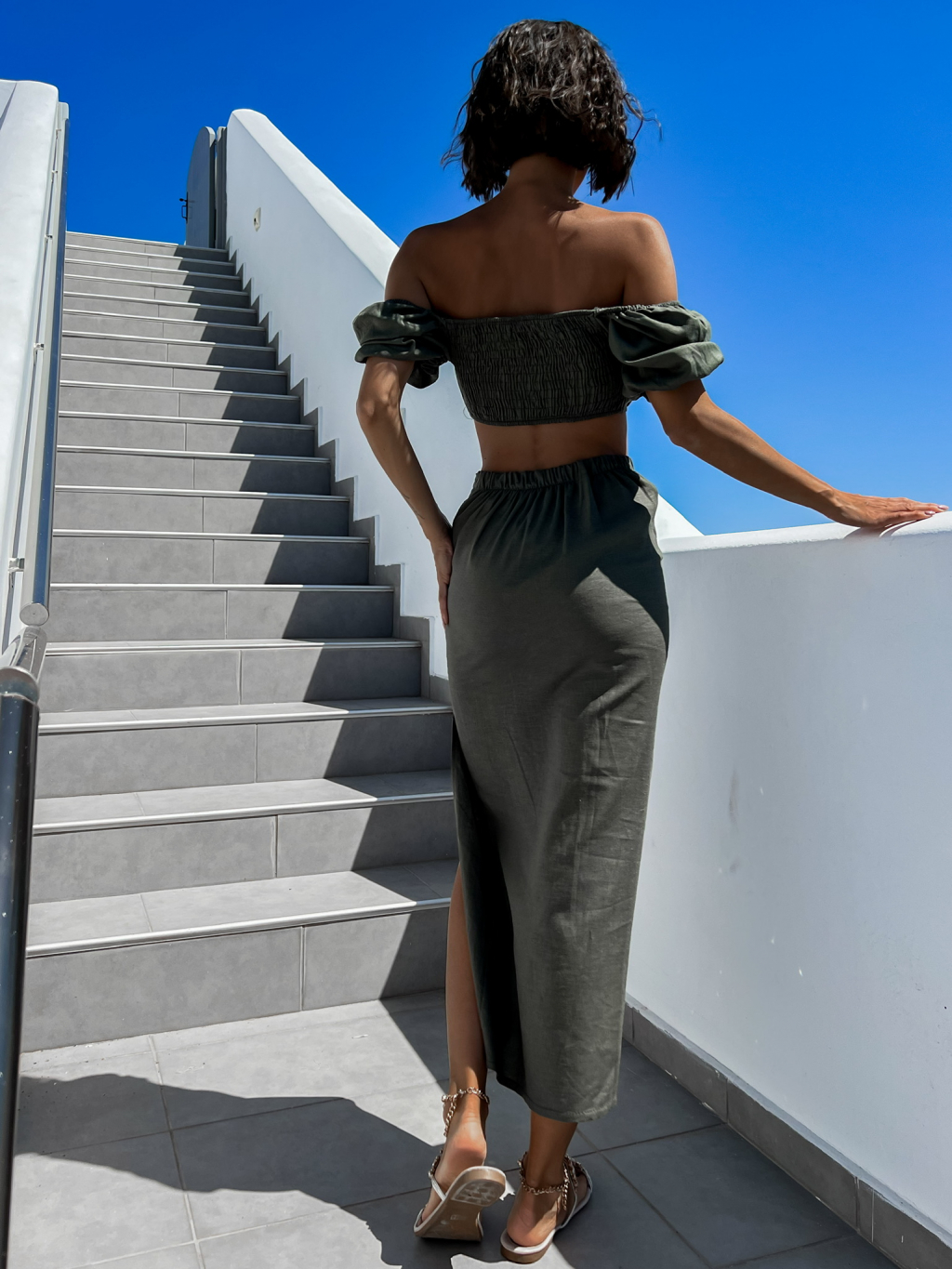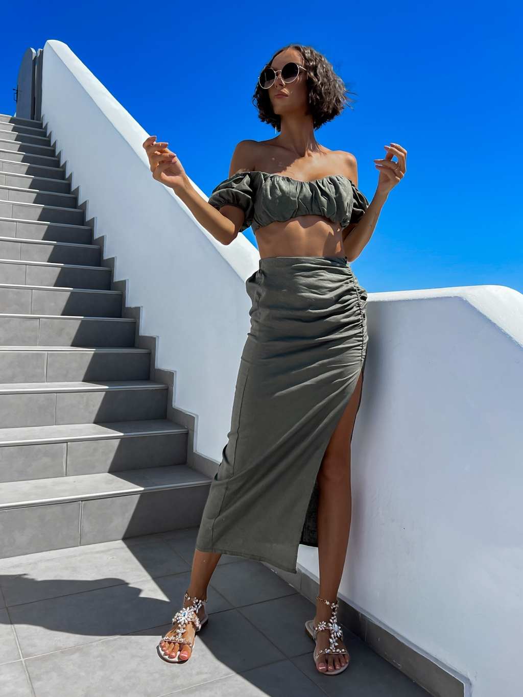 Khaki dvojdielny komplet MILESS s rázporkom