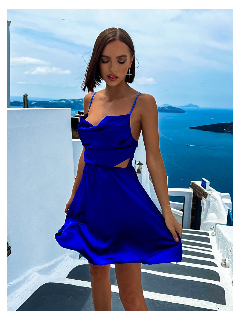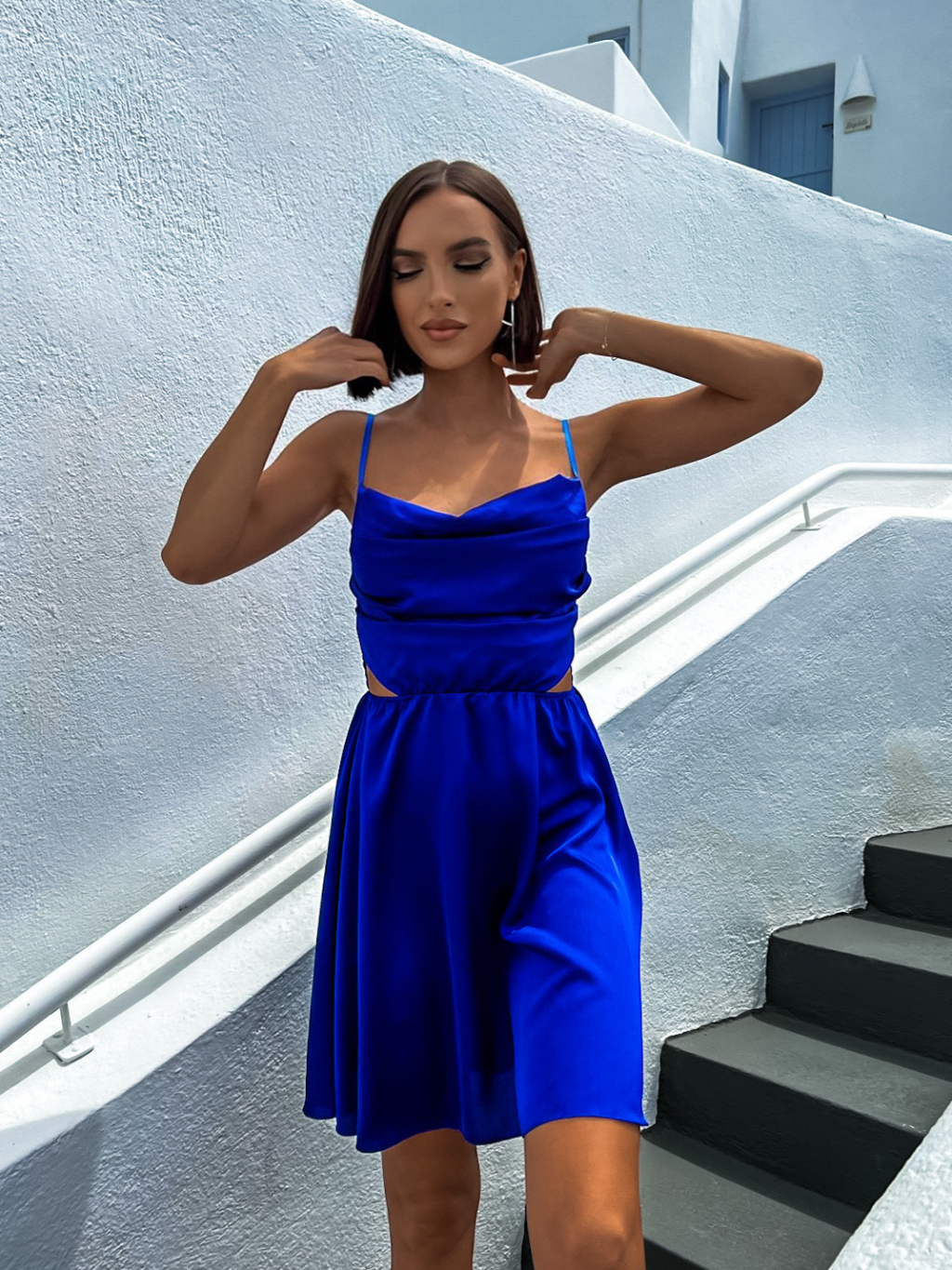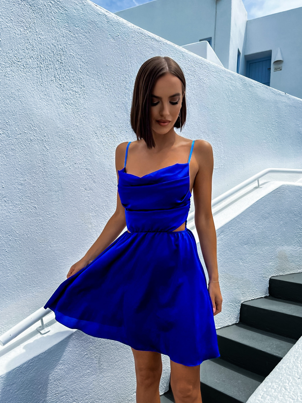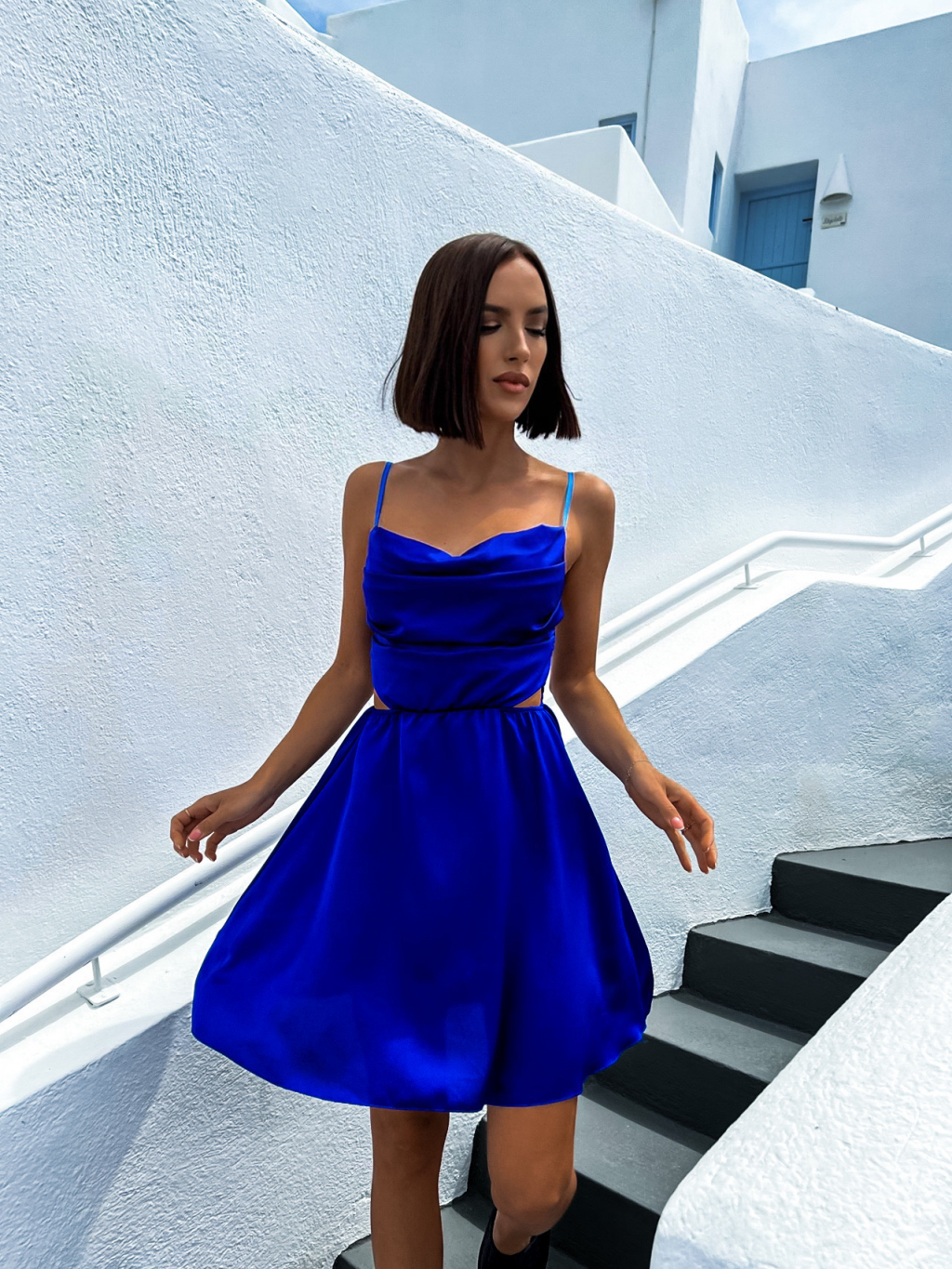 Kráľovsky modré lesklé elegantné šaty JEWELRY s prestrihmi