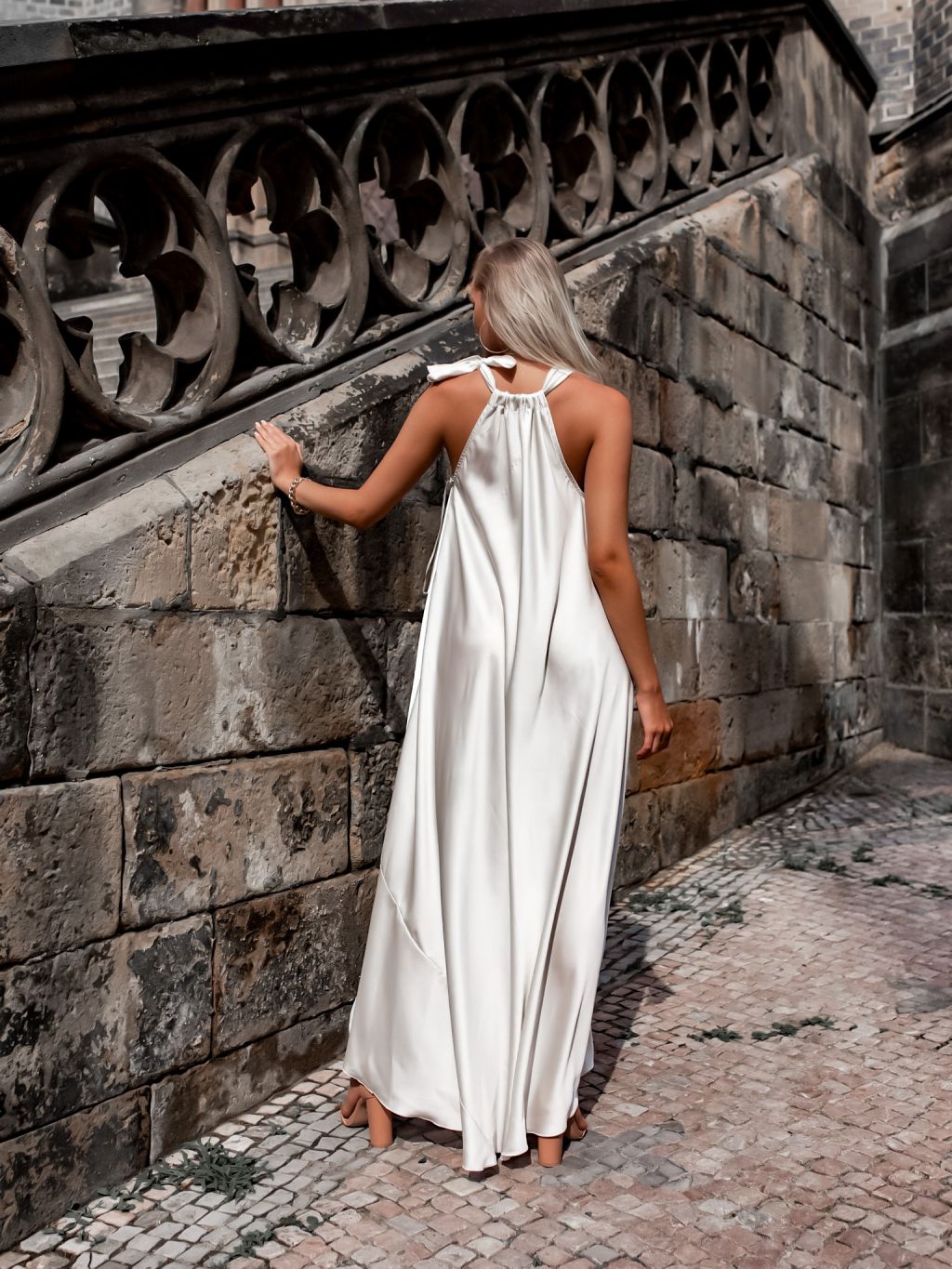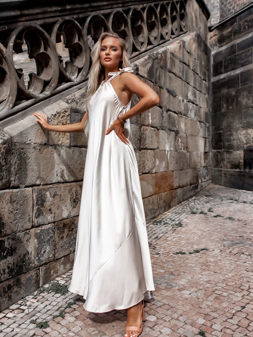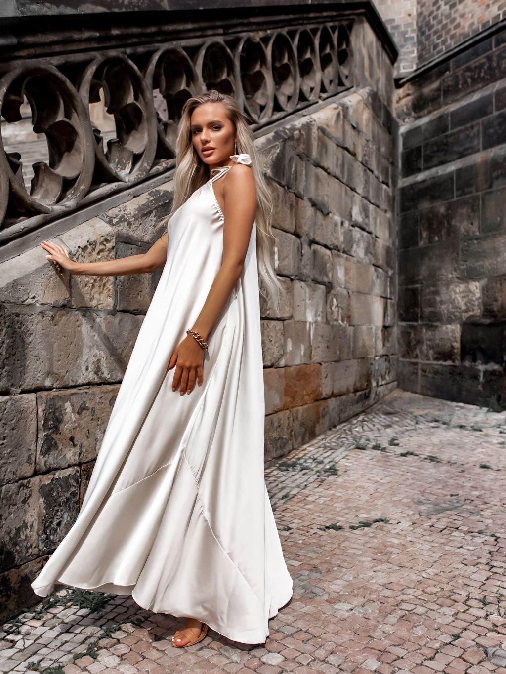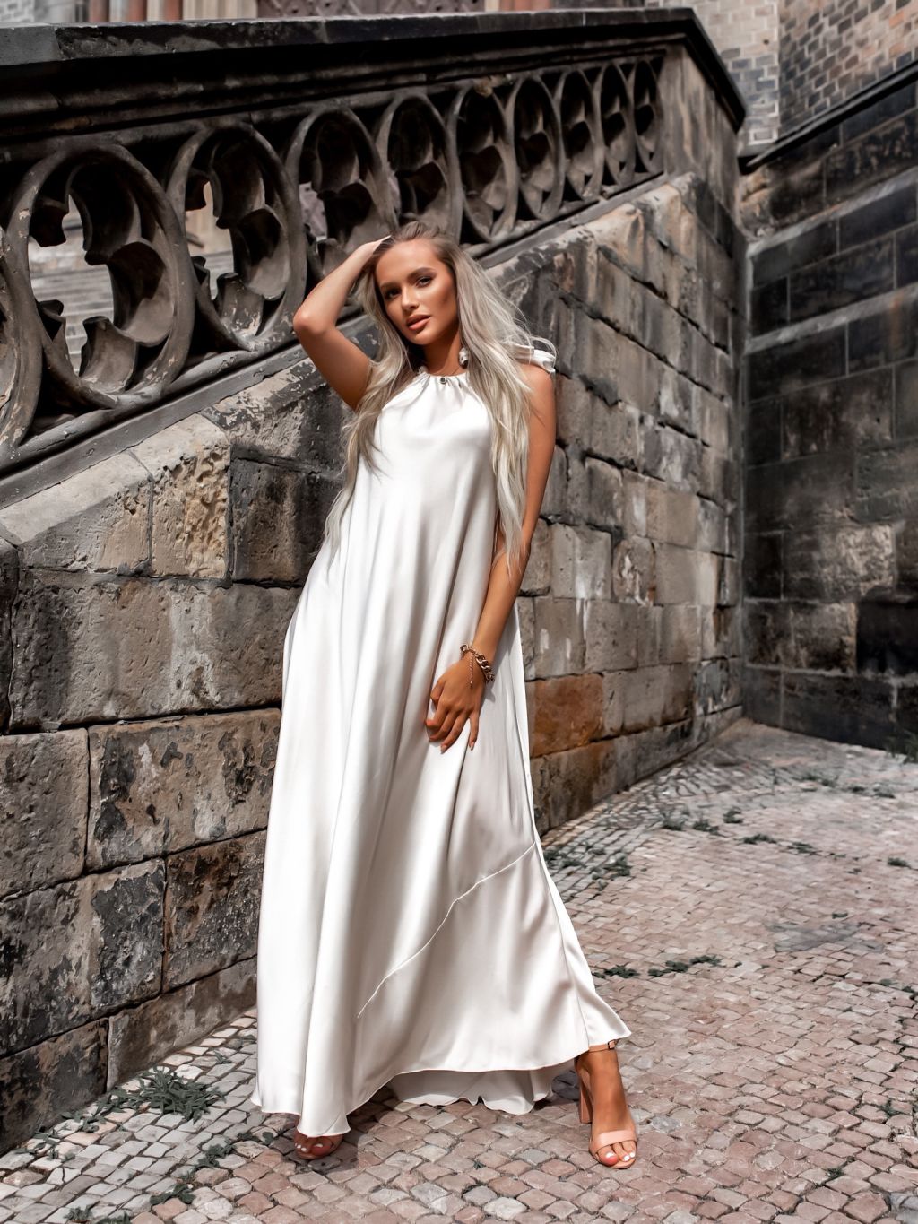 Krémové dlhé lesklé šaty ERIAH s viazaním okolo krku