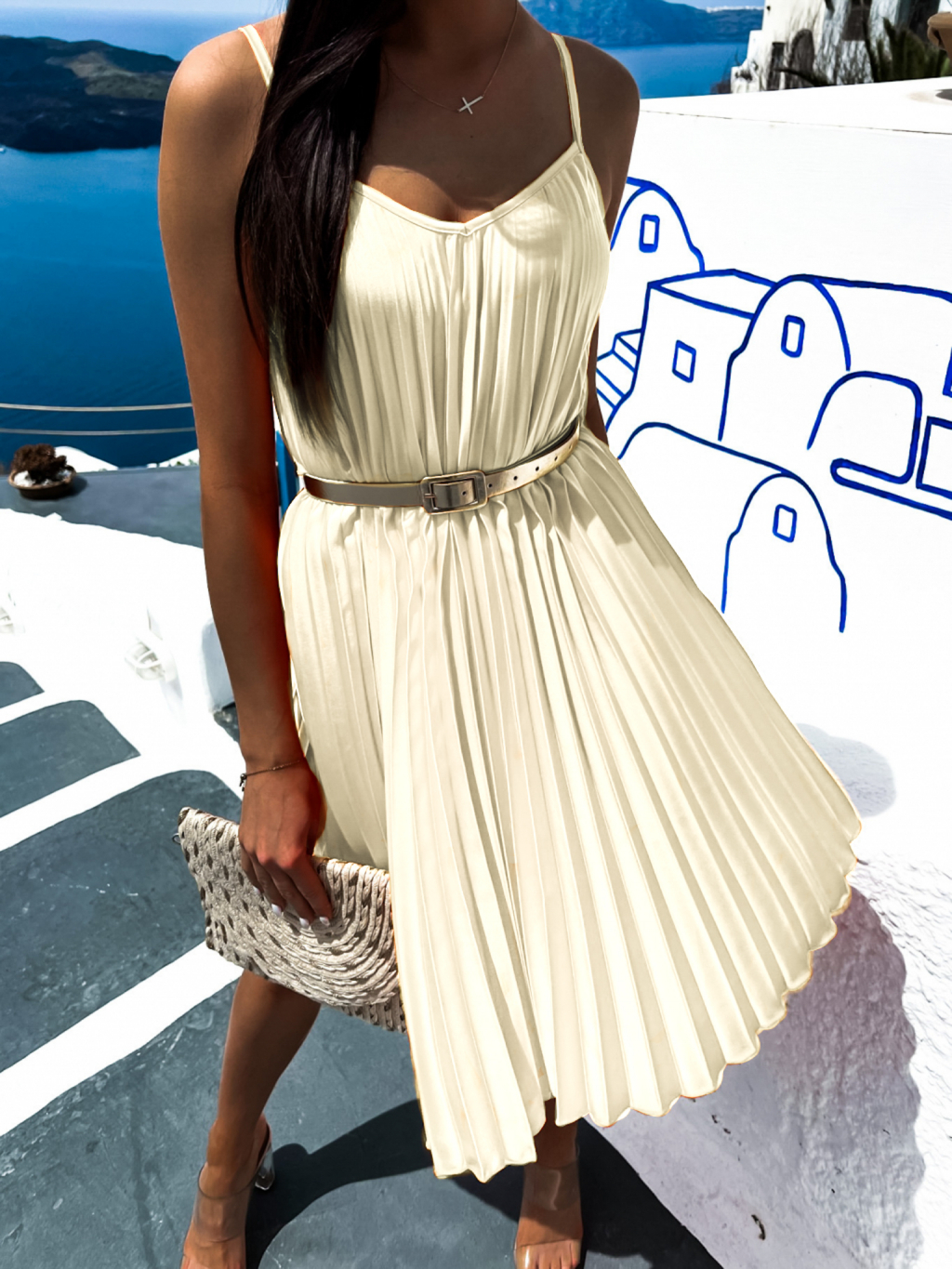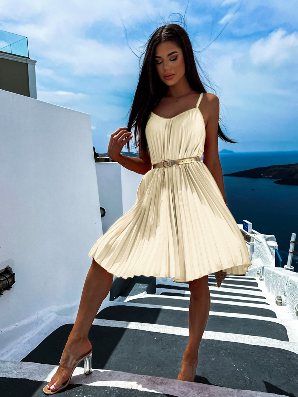 Krémové lesklé plisované šaty CLAURA so zlatým pásikom