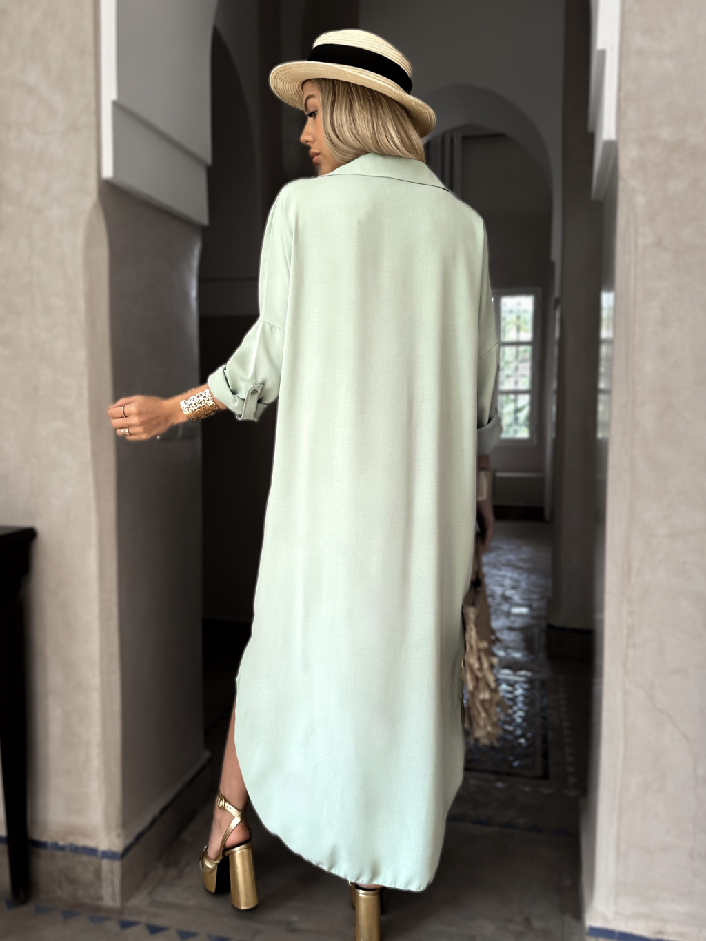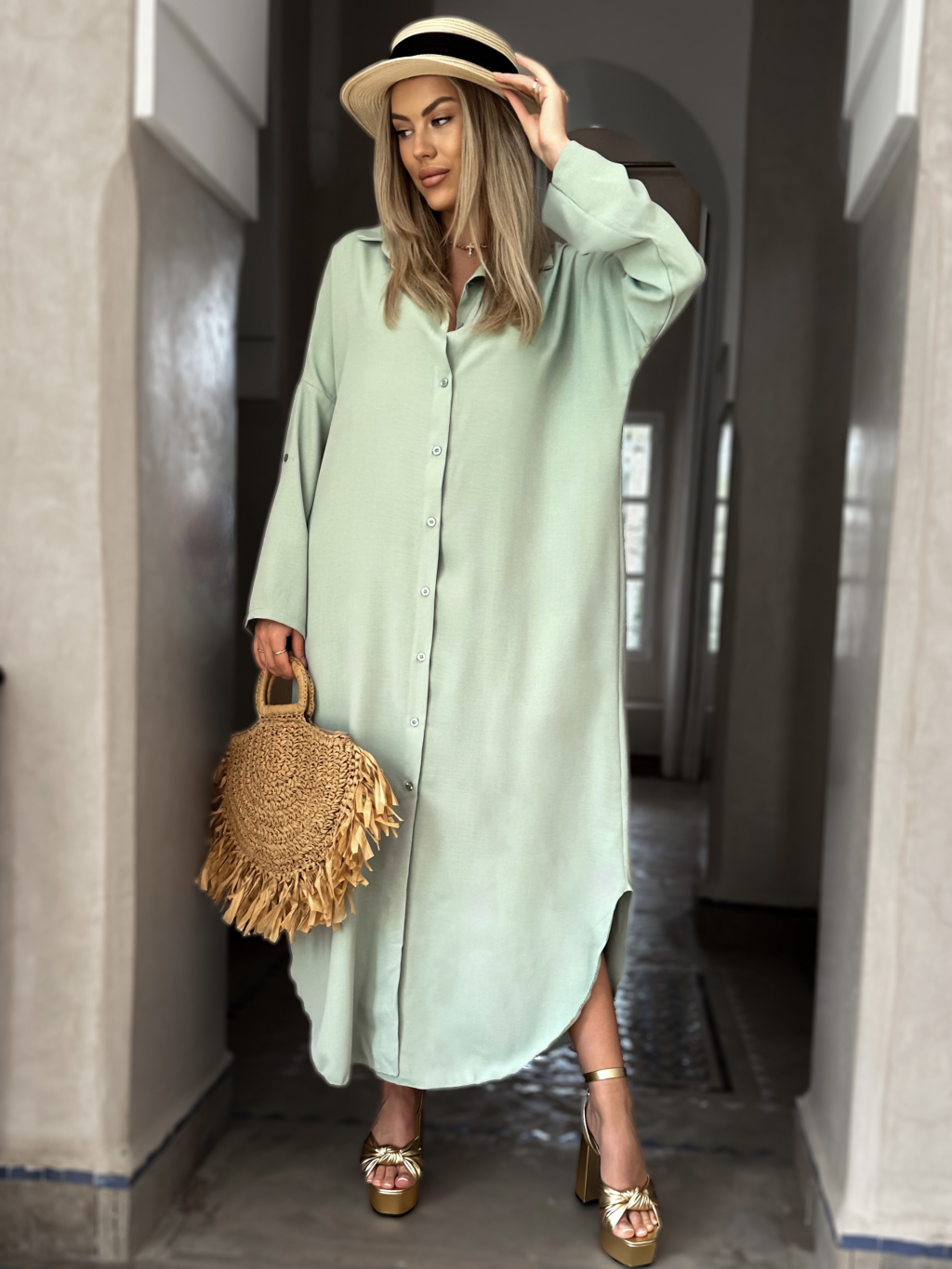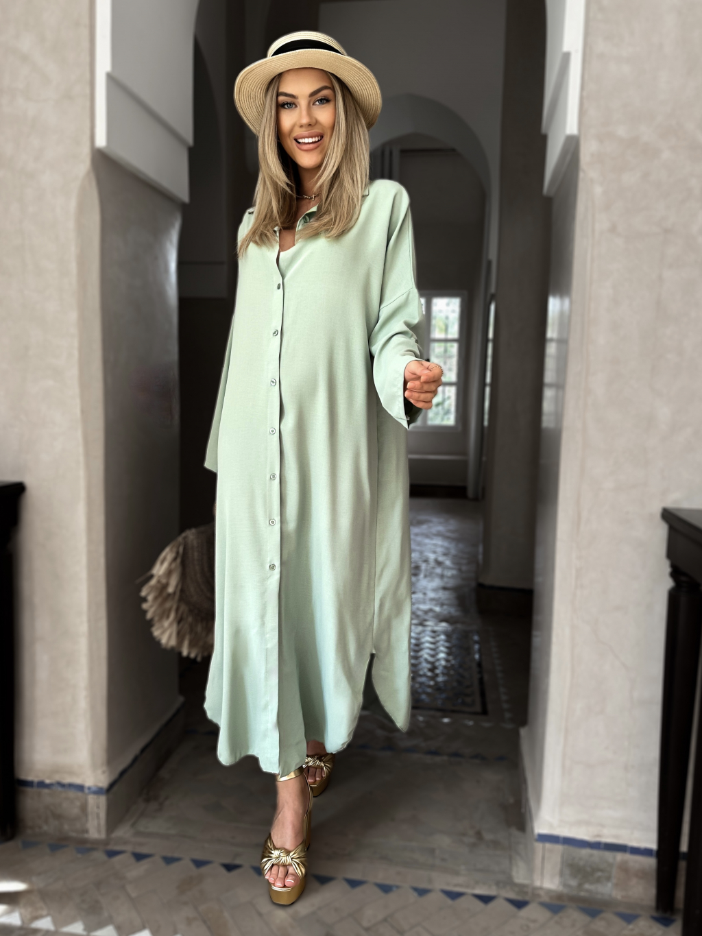 Mentolové dlhé košeľové šaty NESSY