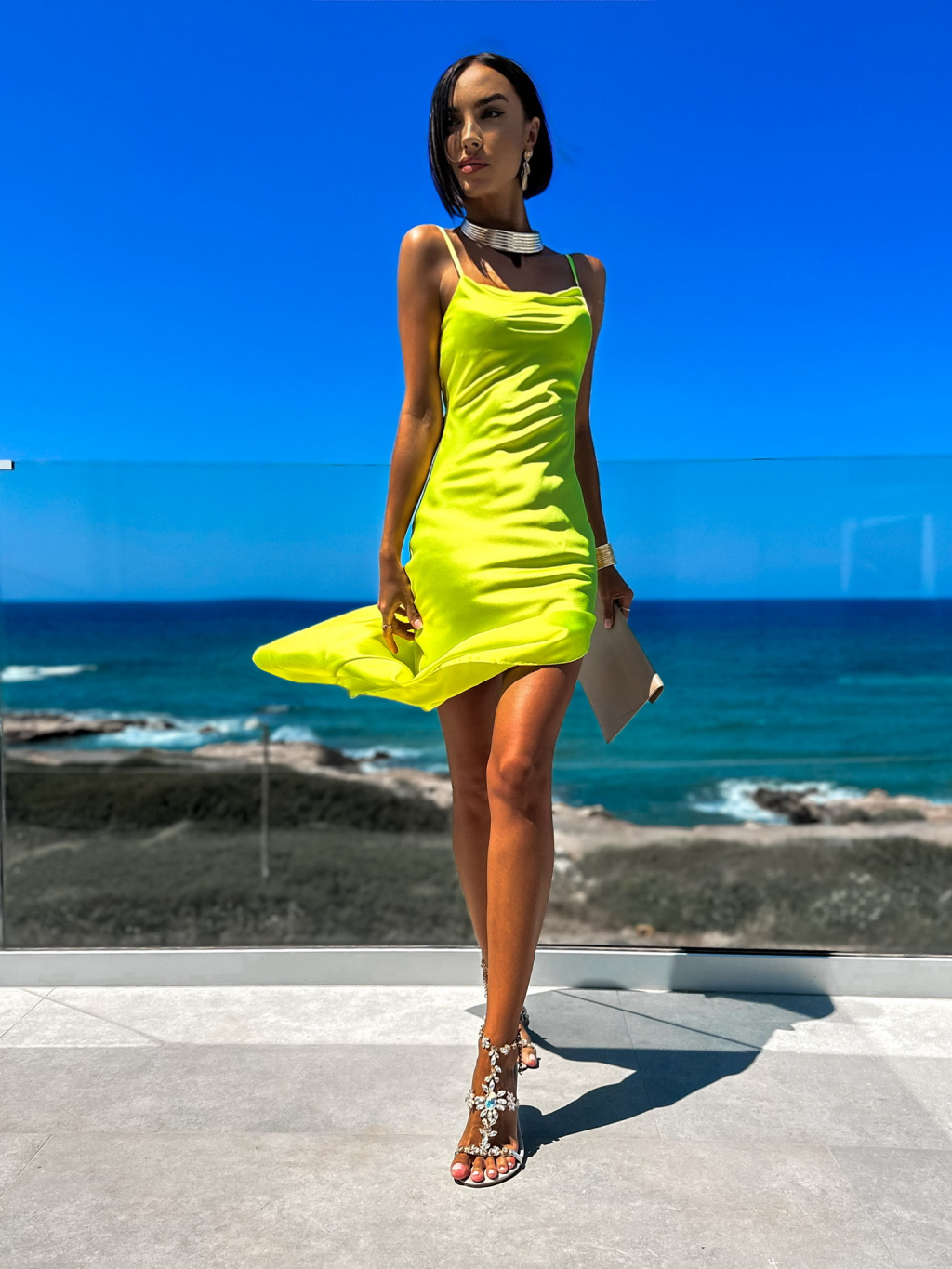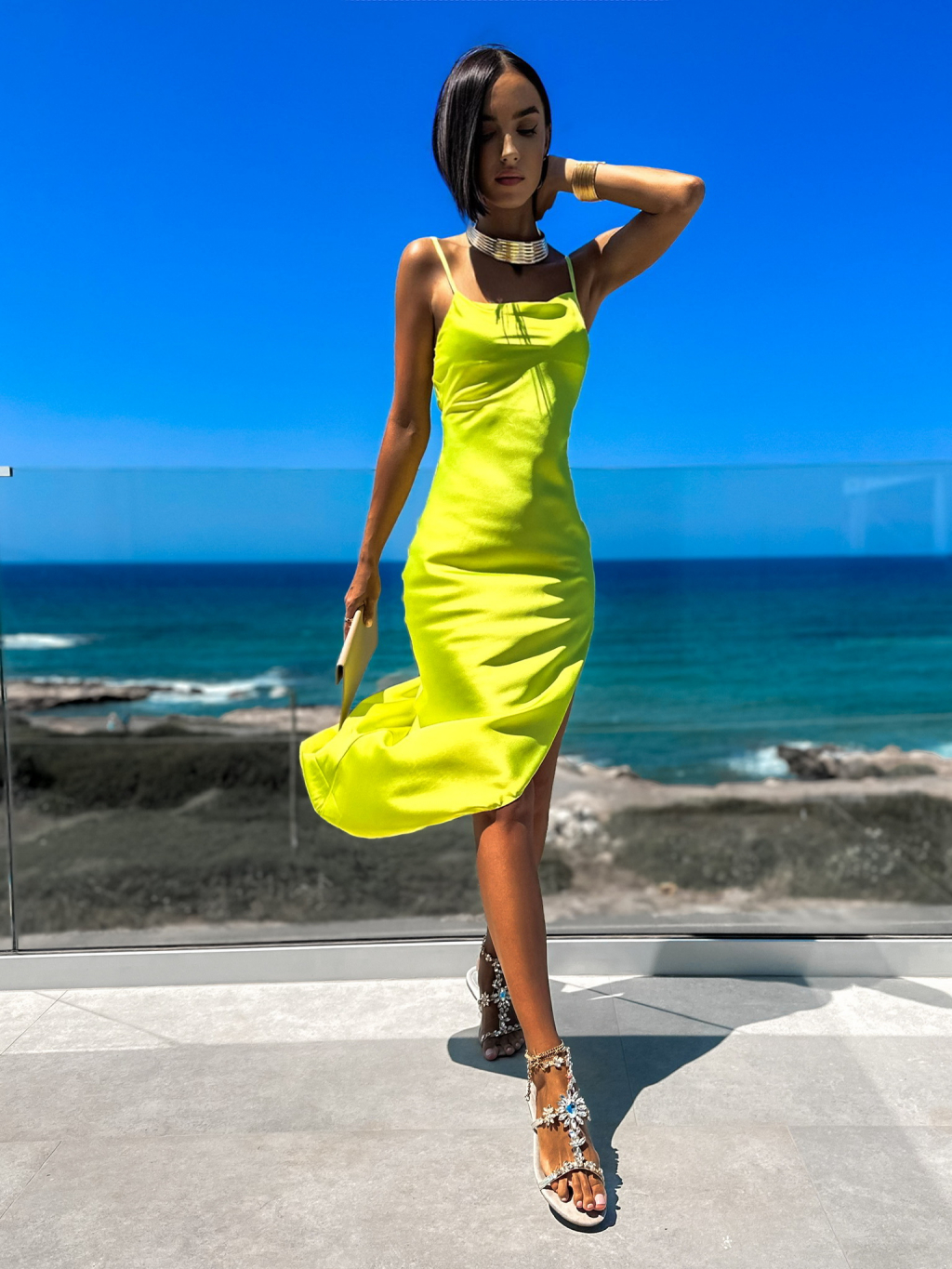 Neon zelené elegantné šaty SYMBOLIZE s rázporkom