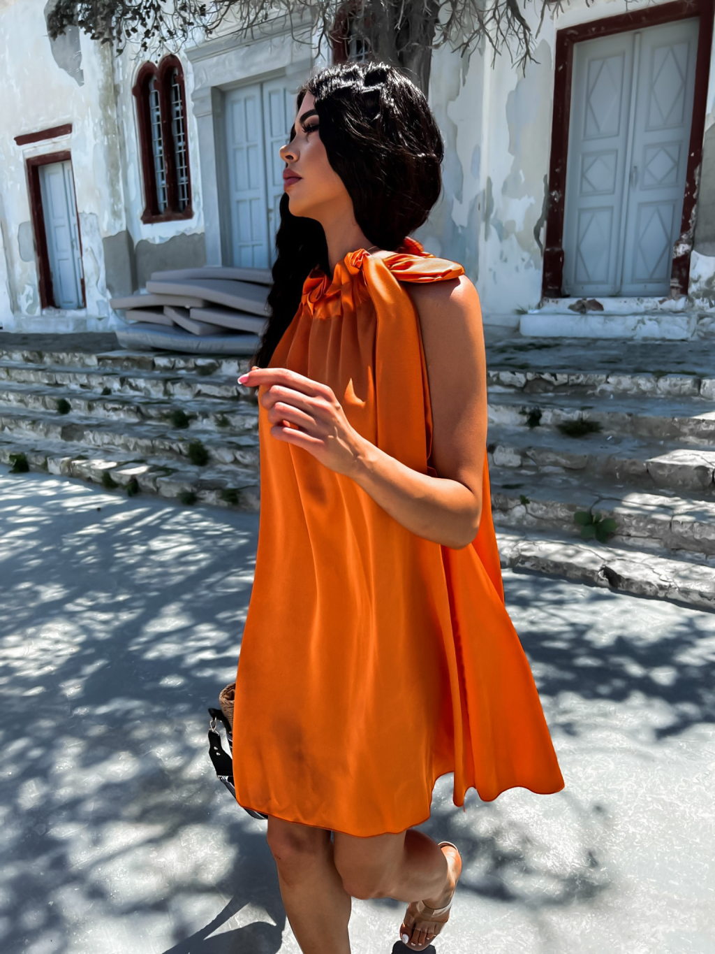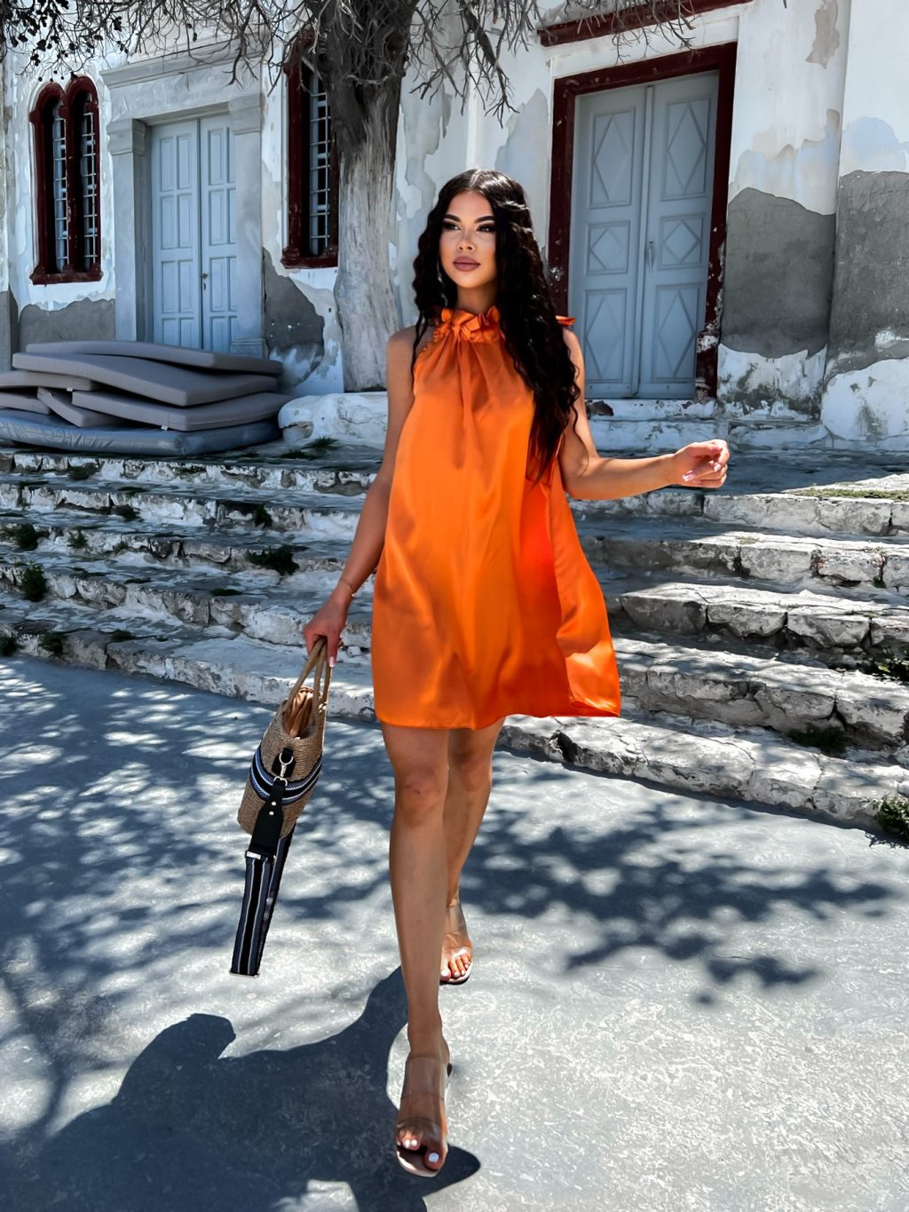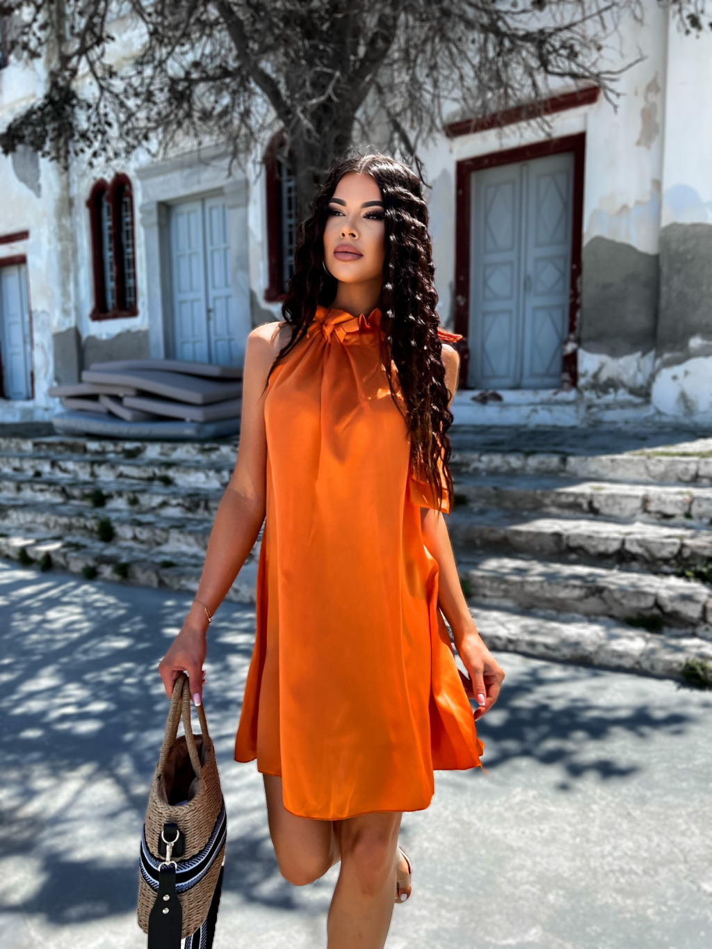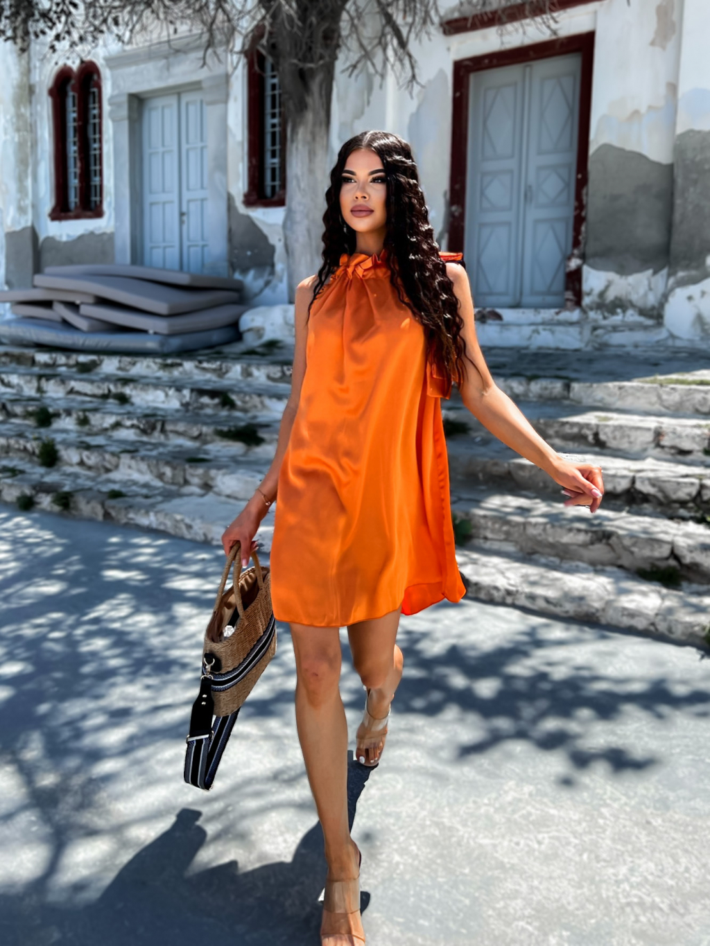 Oranžové lesklé šaty FUENTE s viazaním okolo krku