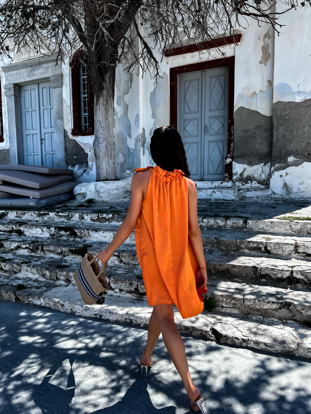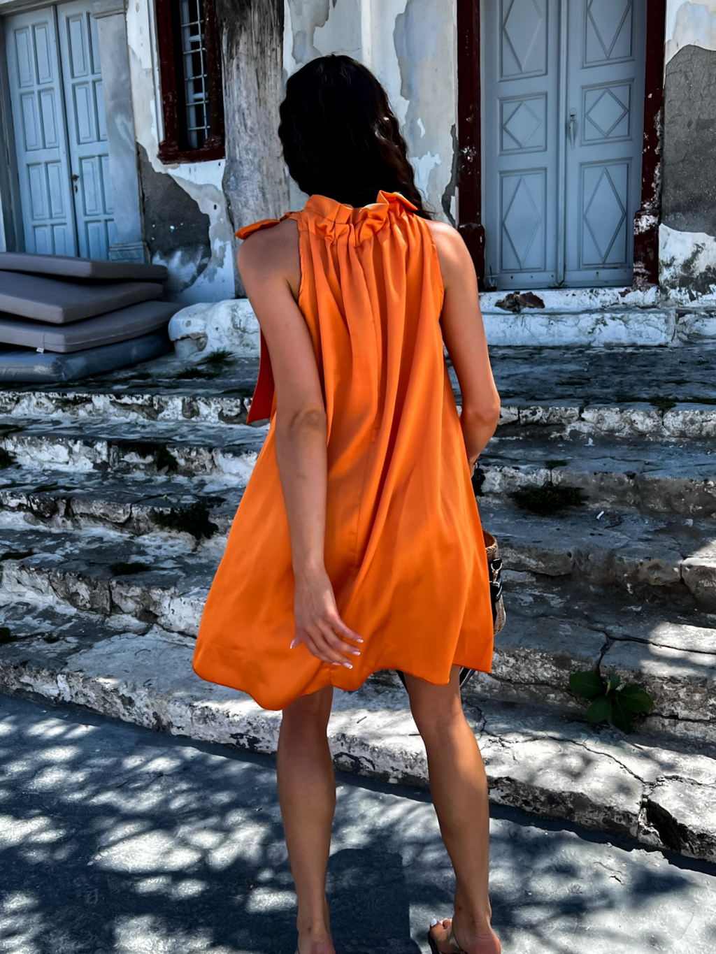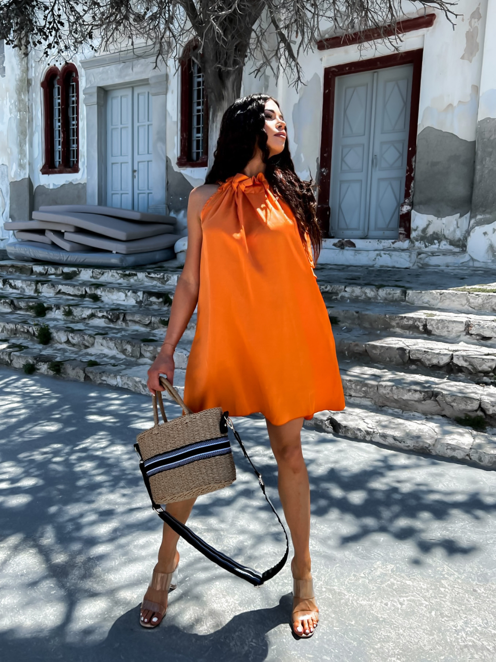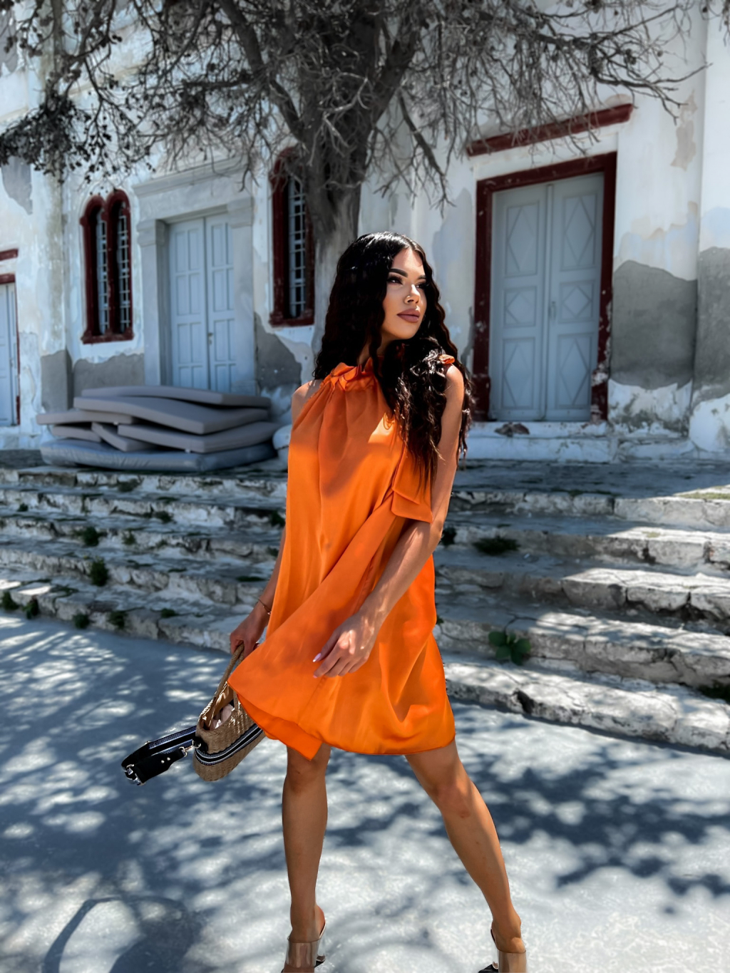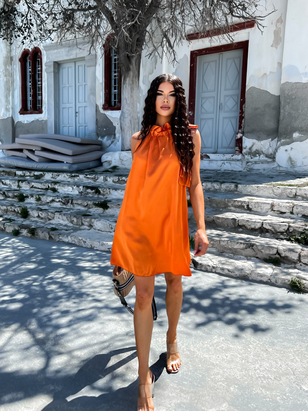 Oranžové lesklé šaty FUENTE s viazaním okolo krku