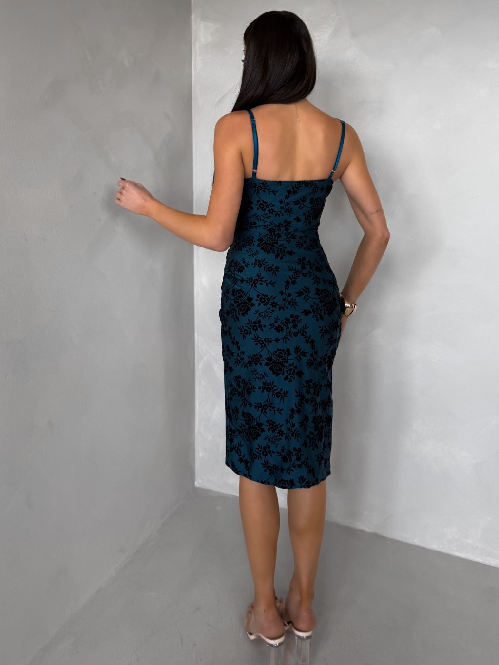 Petrolejové spoločenské midi šaty ETNAVA s rázporkom