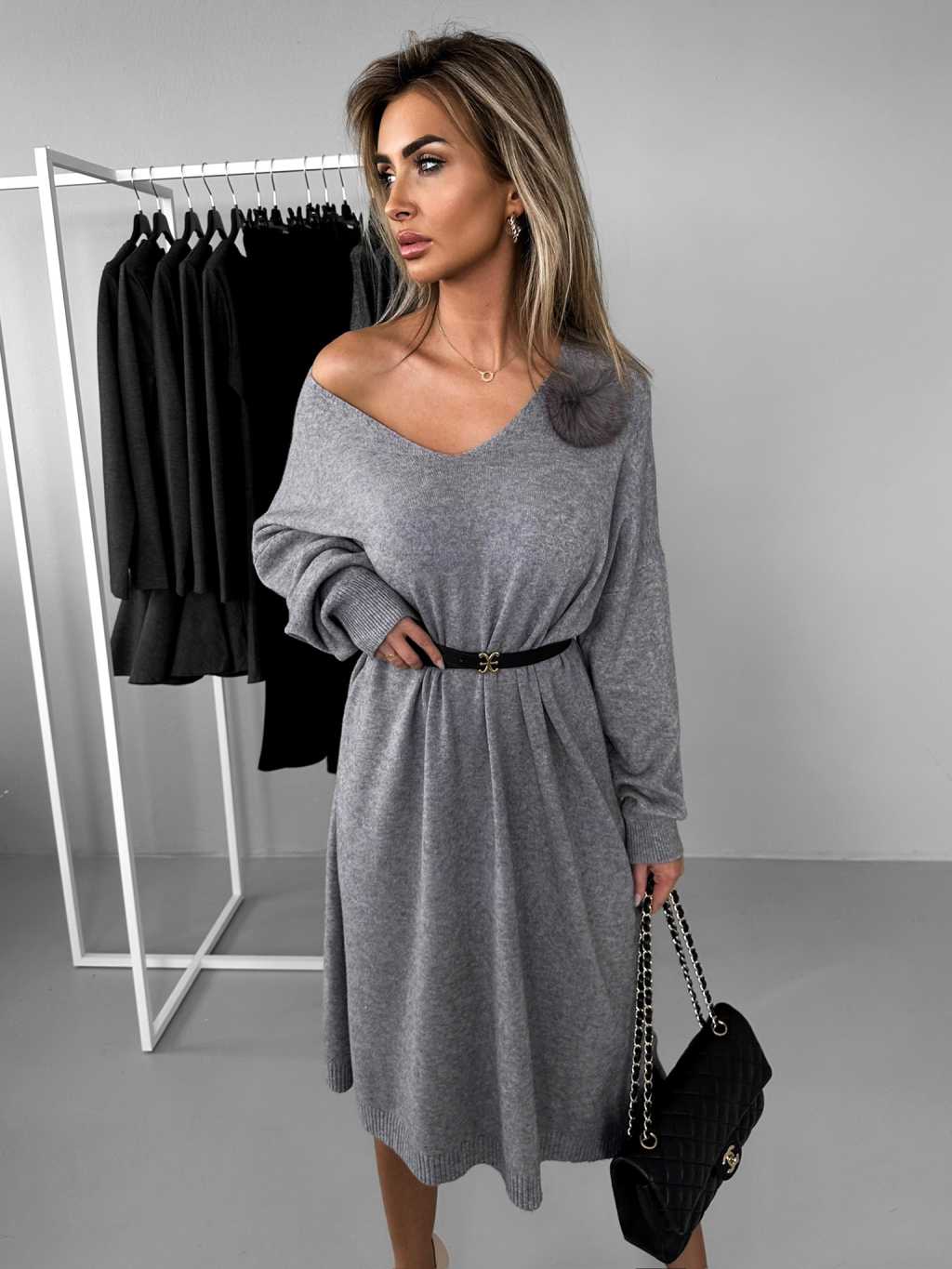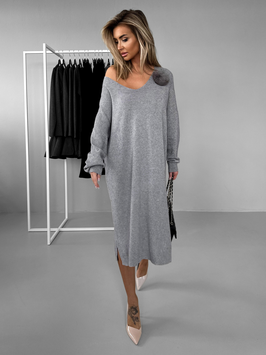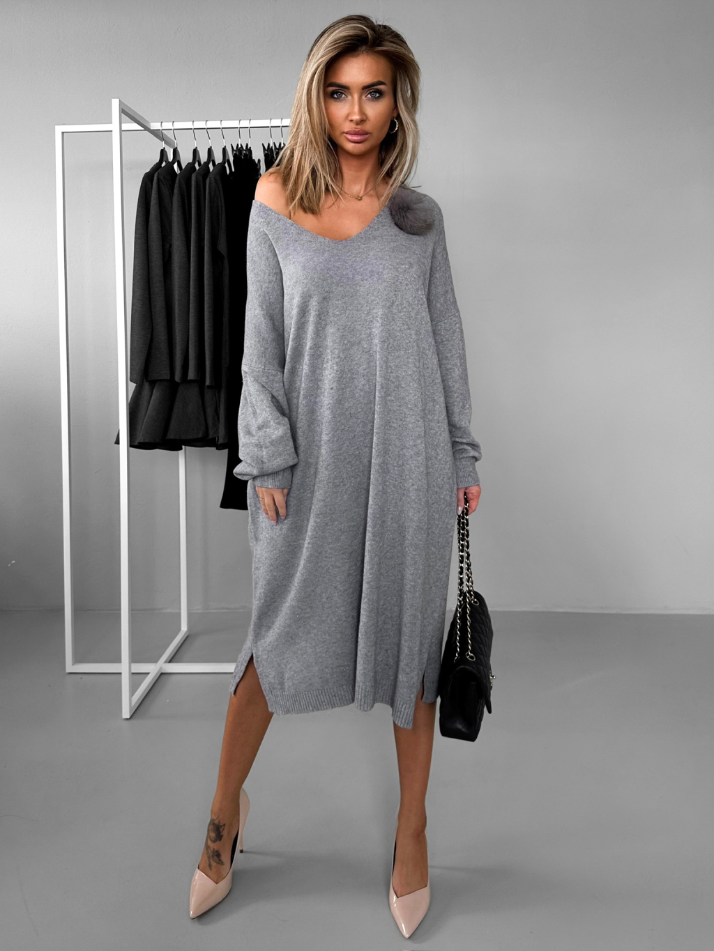 Šedé dlhé oversize svetrové šaty AUDREY s brošňou