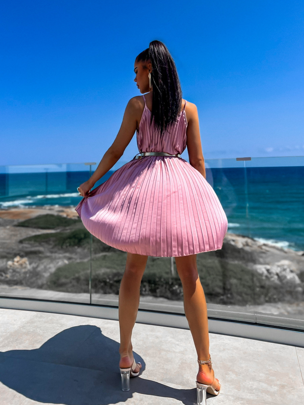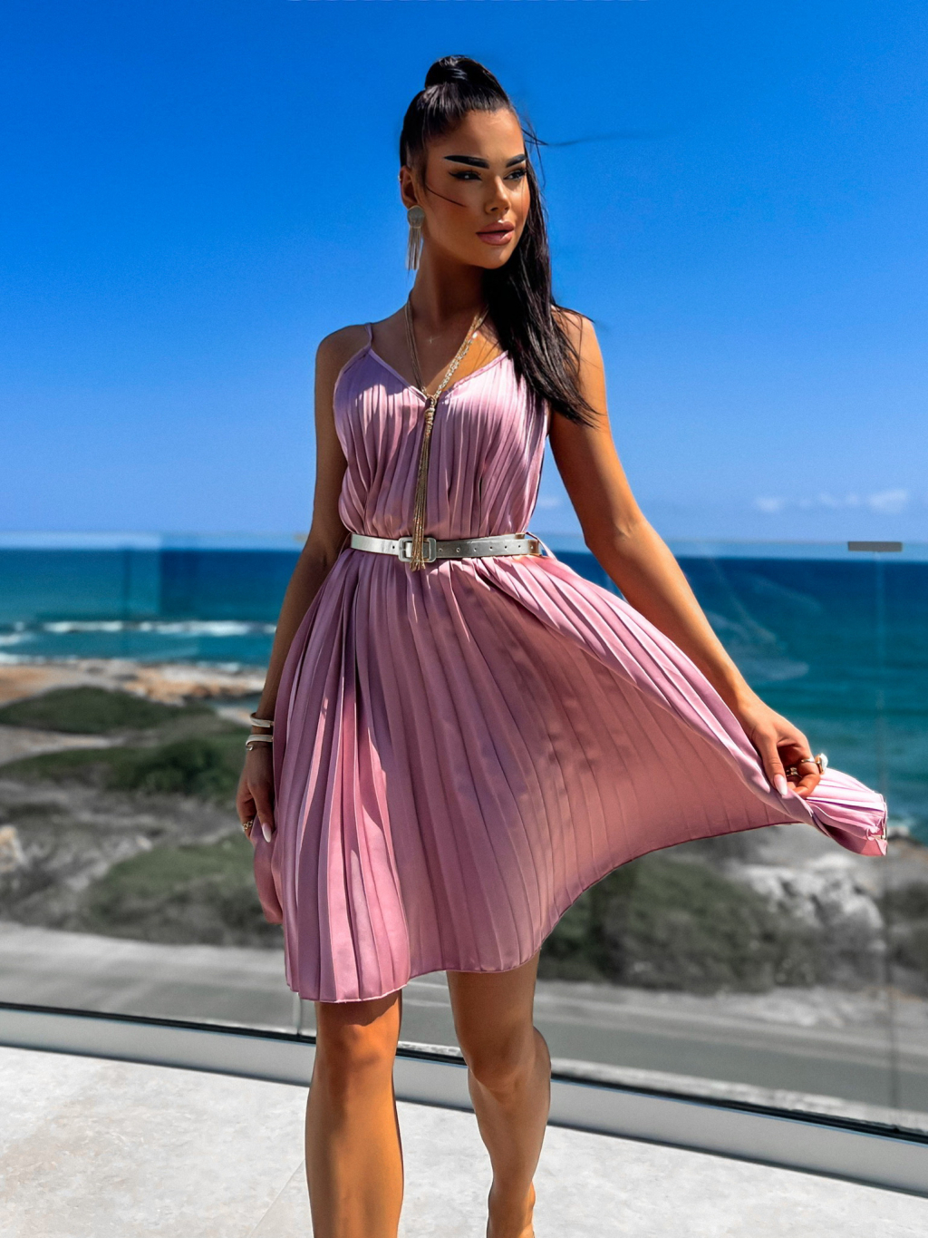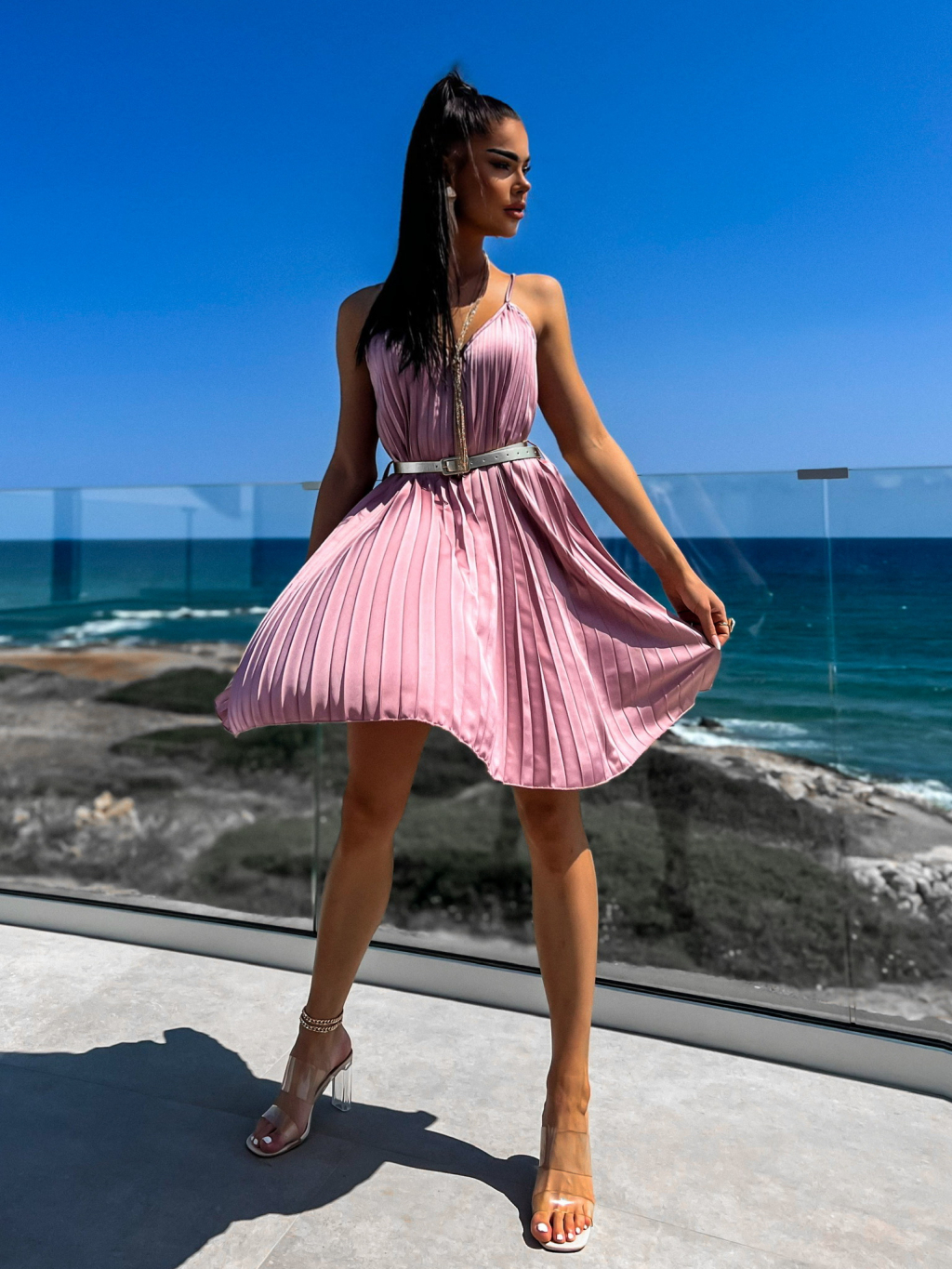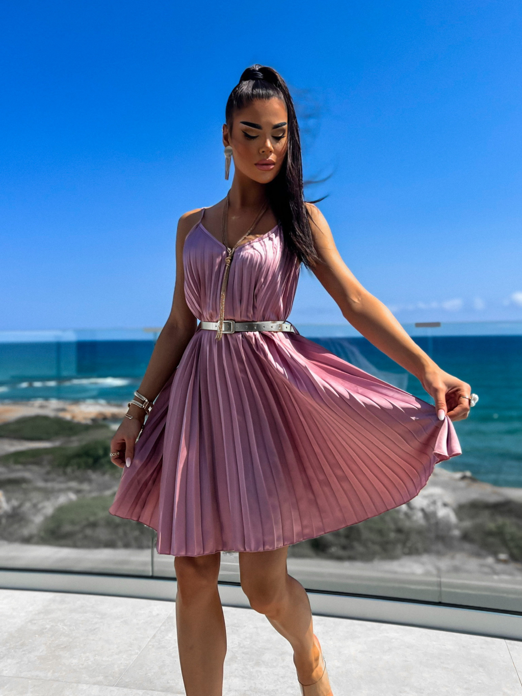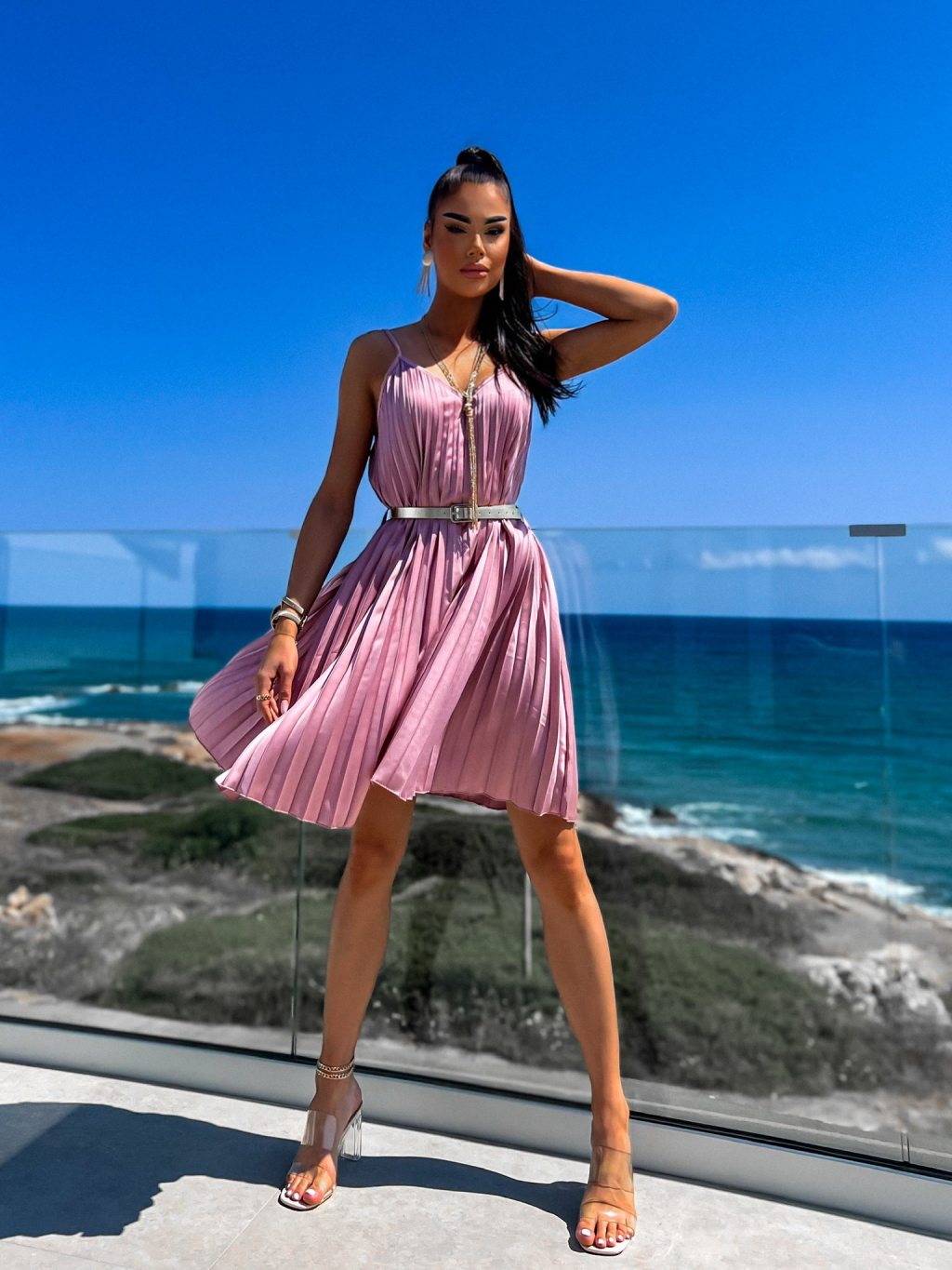 Staroružové lesklé plisované šaty CLAURA so zlatým pásikom