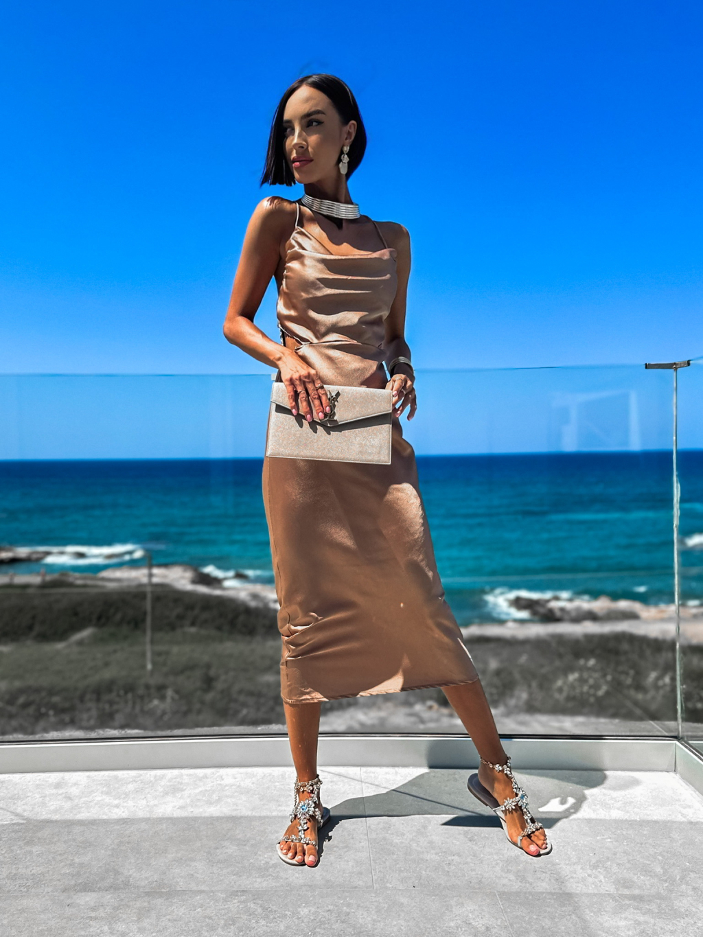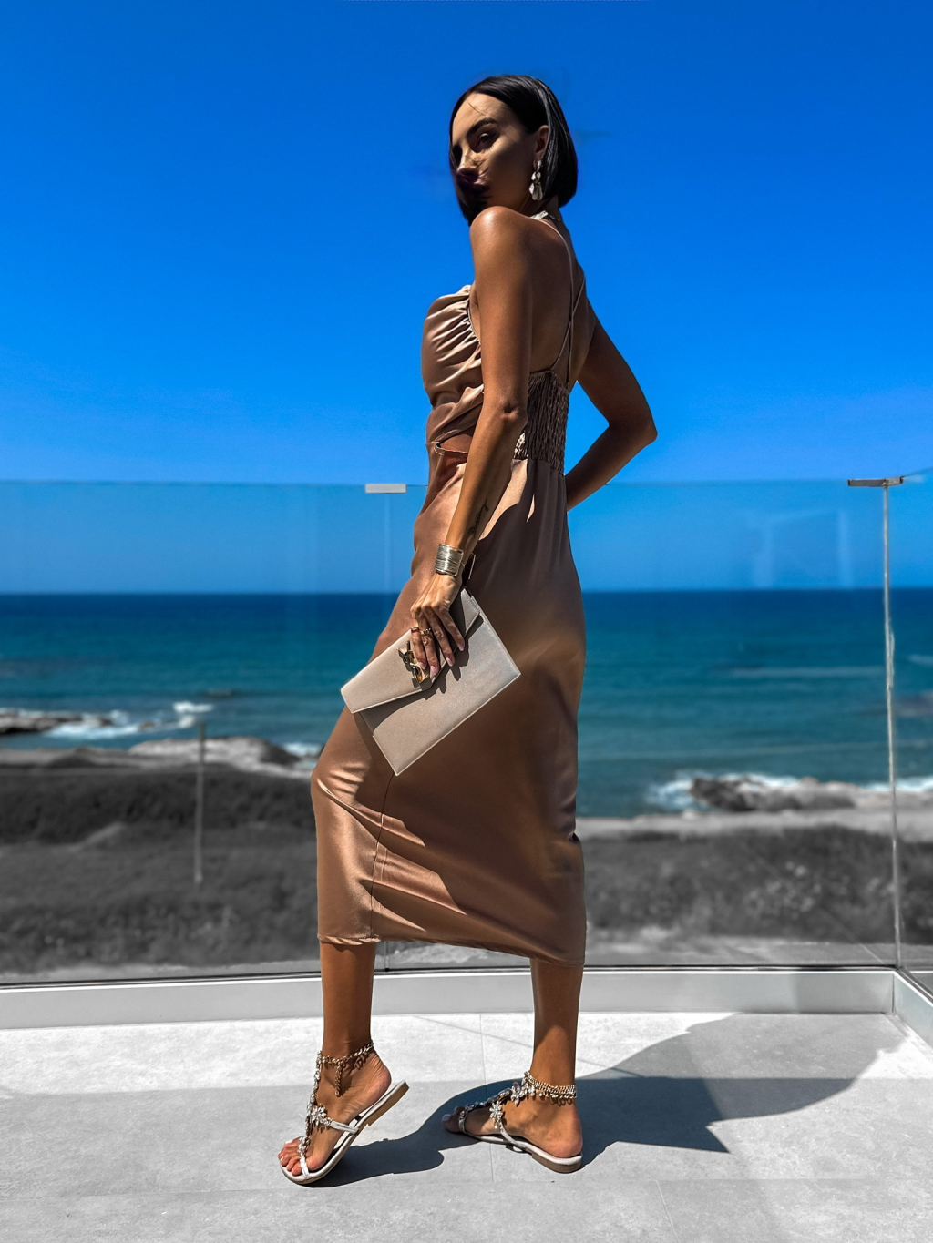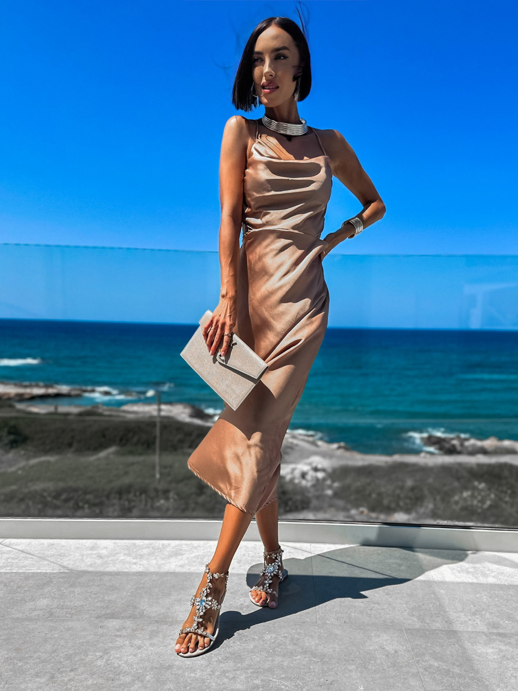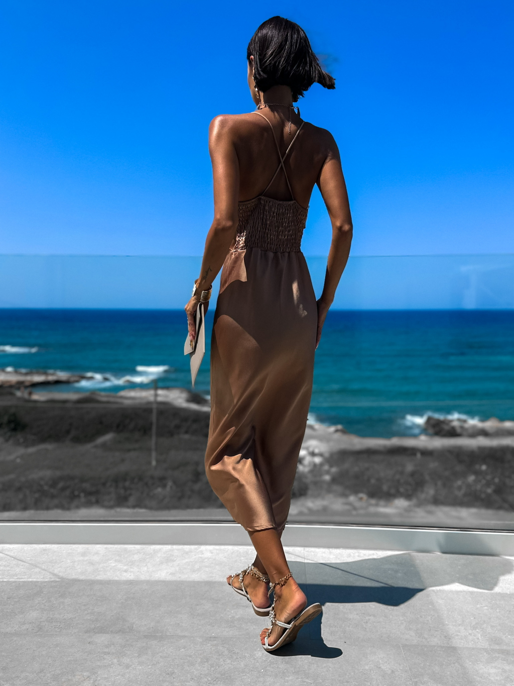 Svetlo hnedé lesklé elegantné šaty KAIAS