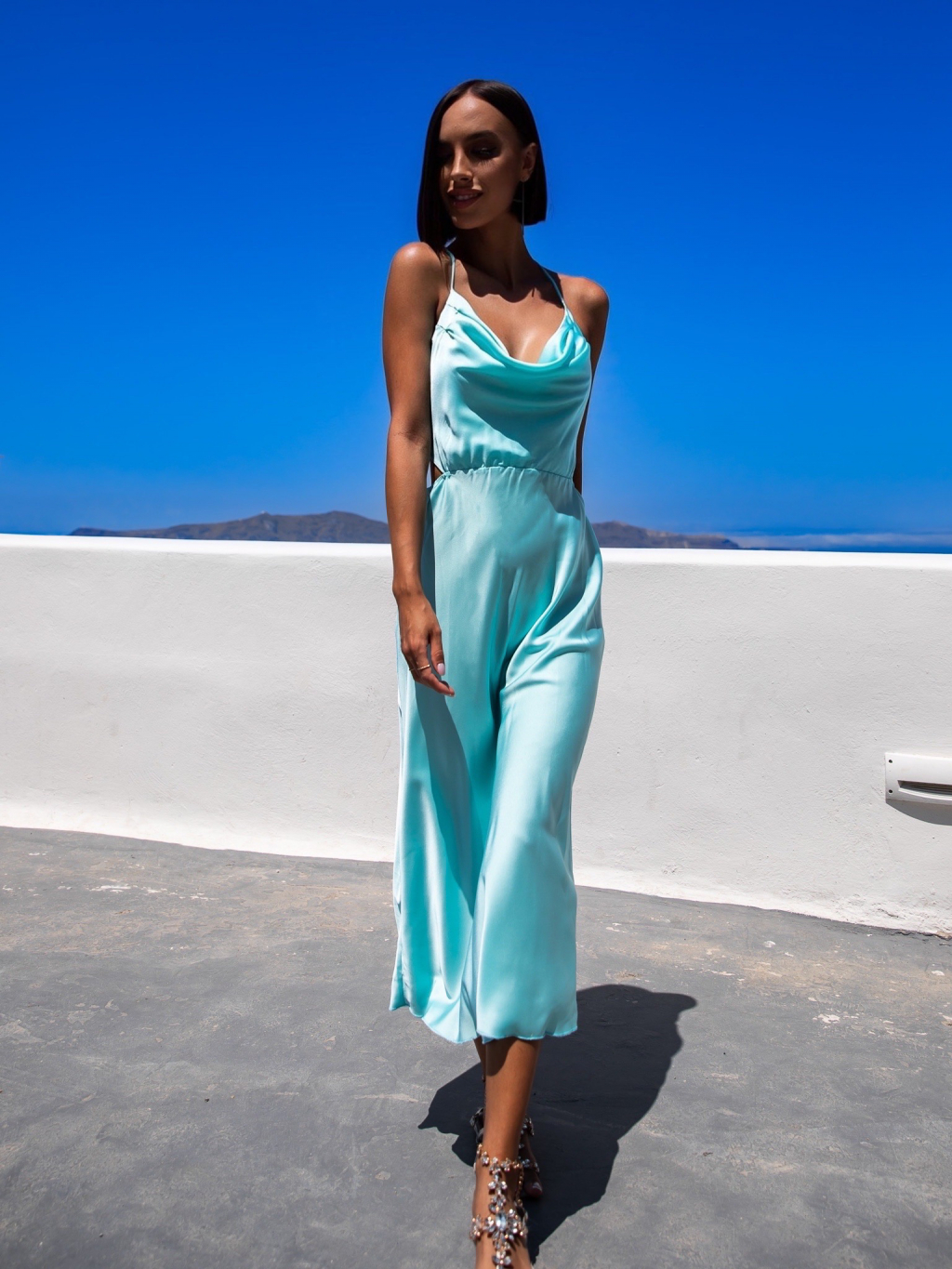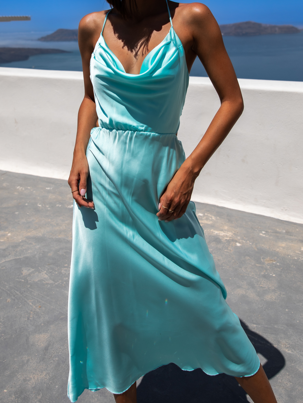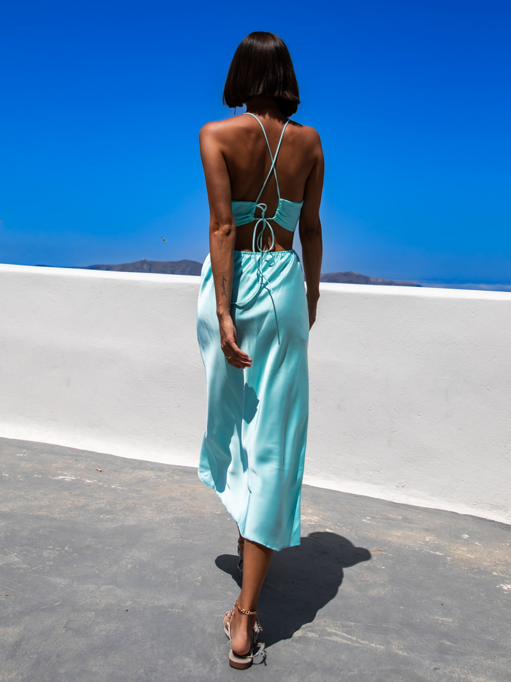 Svetlomodré lesklé elegantné šaty MADALYN s viazaním na chrbte